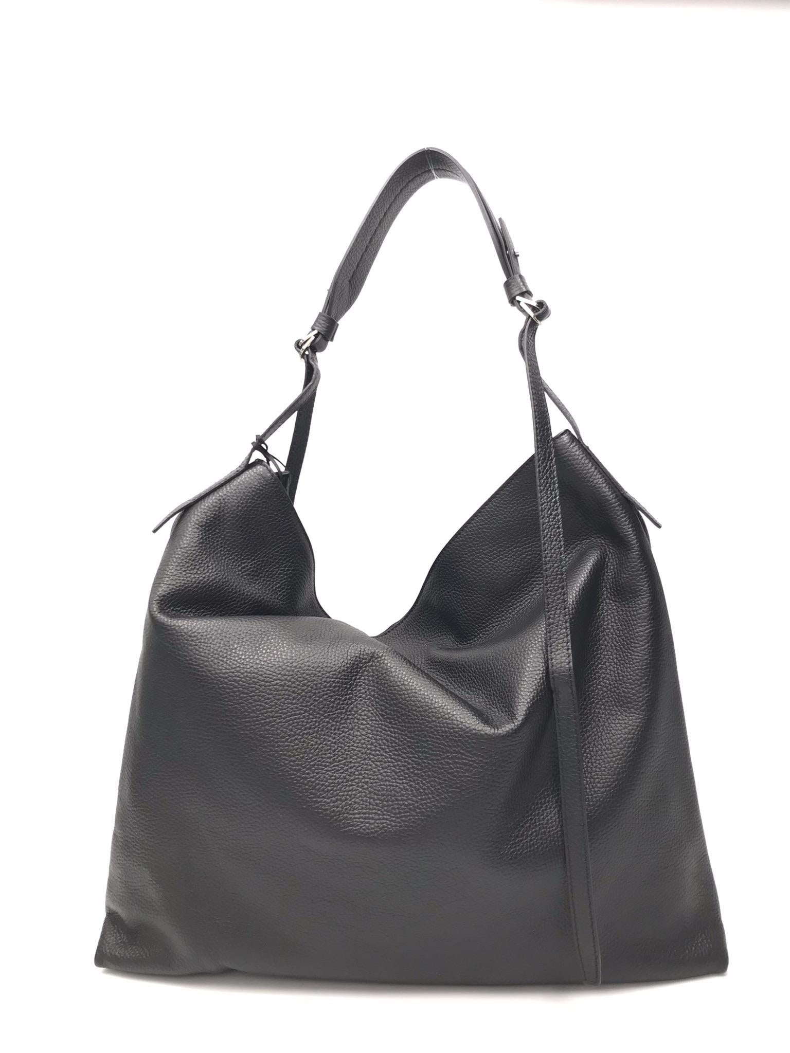 Borsa a spalla realizzata in pelle martellata tinta unita nera. Chiusura superiore con cerniera e manico in tono per indossarla a mano o a spalla. Manico regolabile. Accessori in metallo oro. Fodera interna. Tasca interna con cerniera, tasca porta cellulare.