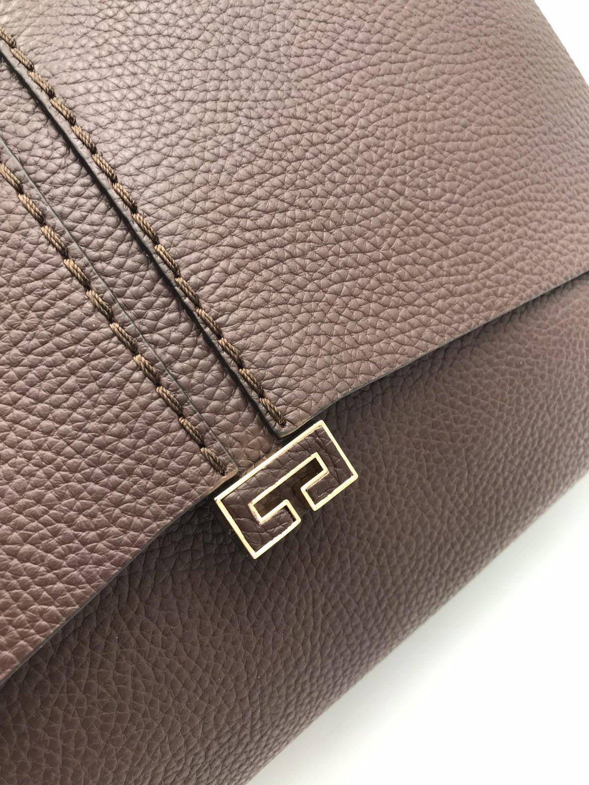 Borsa modello Kendall in vera pelle stampa dollaro color cioccolato. Dettaglio con inserto in pelle nella patta frontale. Accessori metallici color argento. Manico altezza 14 cm. Chiusura superiore con cerniera e patta frontale. Fodera interna in tessuto. Tasca interna con cerniera, tasca porta cellulare. Tracolla in pelle staccabile e regolabile.