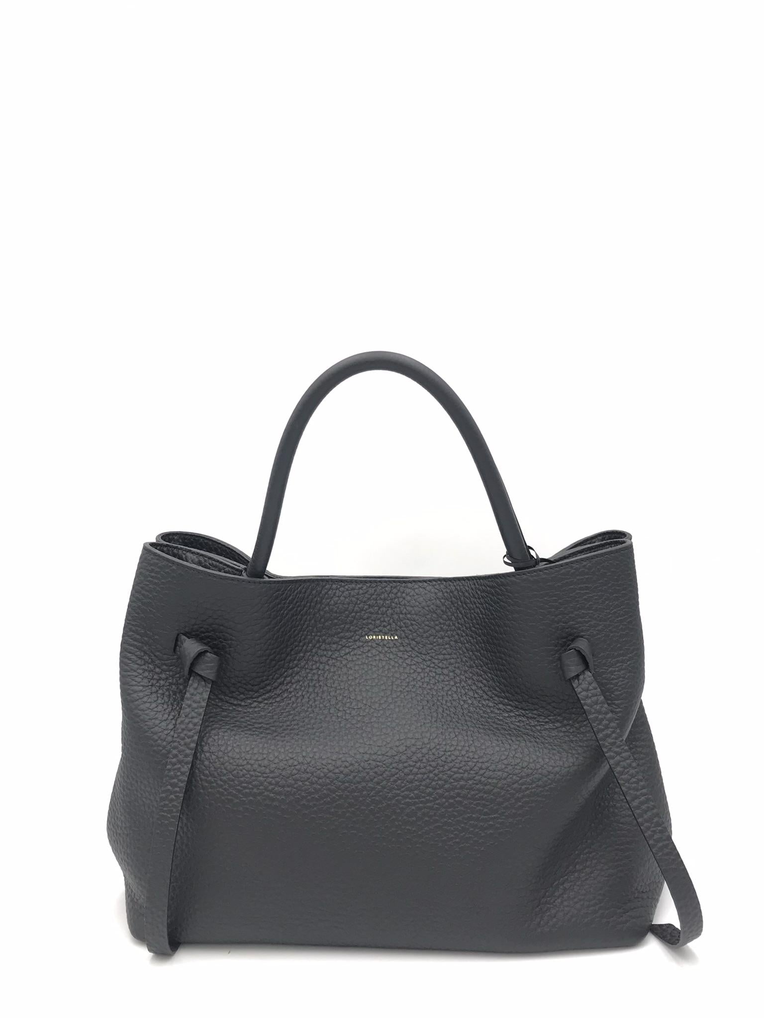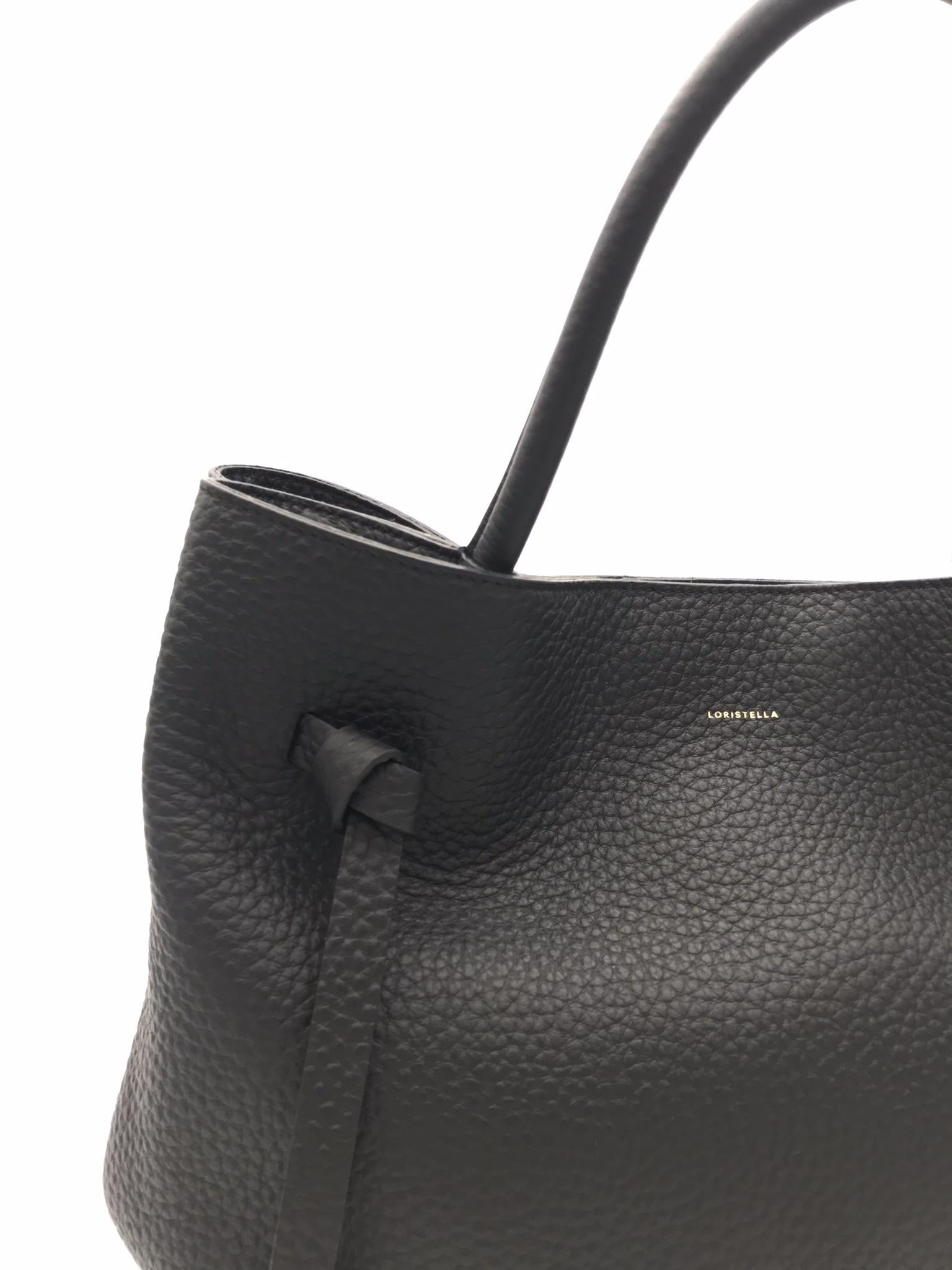 Borsa a spalla realizzata in pelle martellata nera. Chiusura superiore con calamita e manico in tono per indossarla a mano o a spalla. Tracolla in pelle allungabile e removibile. Fodera interna. Tasca interna con cerniera, tasca porta cellulare.