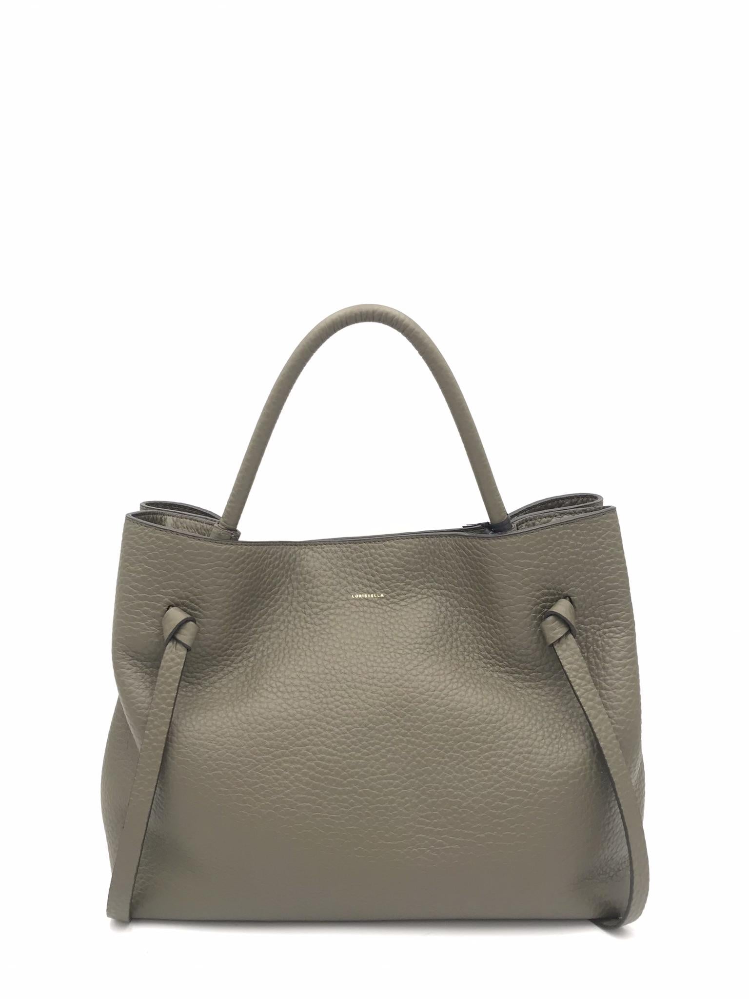 Borsa a spalla realizzata in pelle martellata verde militare. Chiusura superiore con calamita e manico in tono per indossarla a mano o a spalla. Tracolla in pelle allungabile e removibile. Fodera interna. Tasca interna con cerniera, tasca porta cellulare.