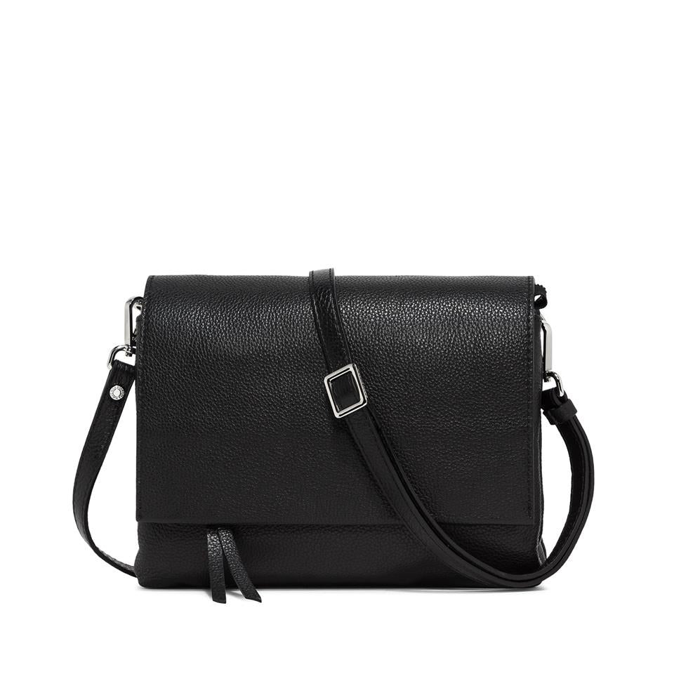 La borsa Three è realizzata in pregiata pelle martellata color nero. Giovane e divertente è composta da due bustine che convergono nella parte superiore con zip di chiusura, e una patta frontale concalamita. Portabile a mano o a spalla con la tracolla in pelle in dotazione. interno foderato in tessuto con tasche a parete. Dimensioni: 25x22x5 cm.