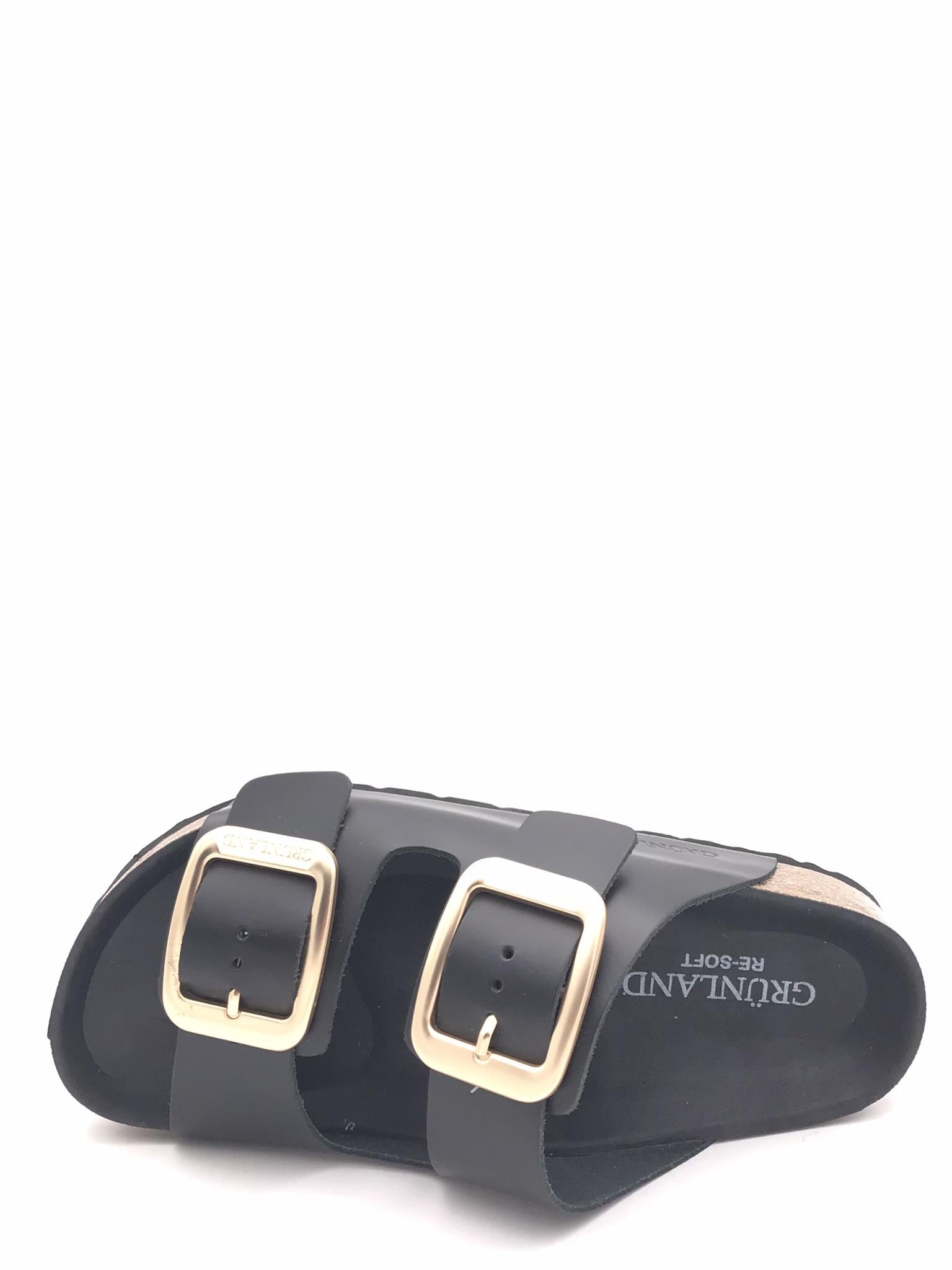 Ciabatta aperta in pelle nera. Doppia fascia con fibbia regolabile nel collo piede. Fibbia color oro. Fodera interna in pelle. Plantare anatomico in pelle e sughero con sottopiede RE-SOFT (realizzato in doppio strato di schiuma di poliuretano, primo strato ammortizza il secondo memorizza) che recupera la forma originaria anche dopo molte ore di camminata.