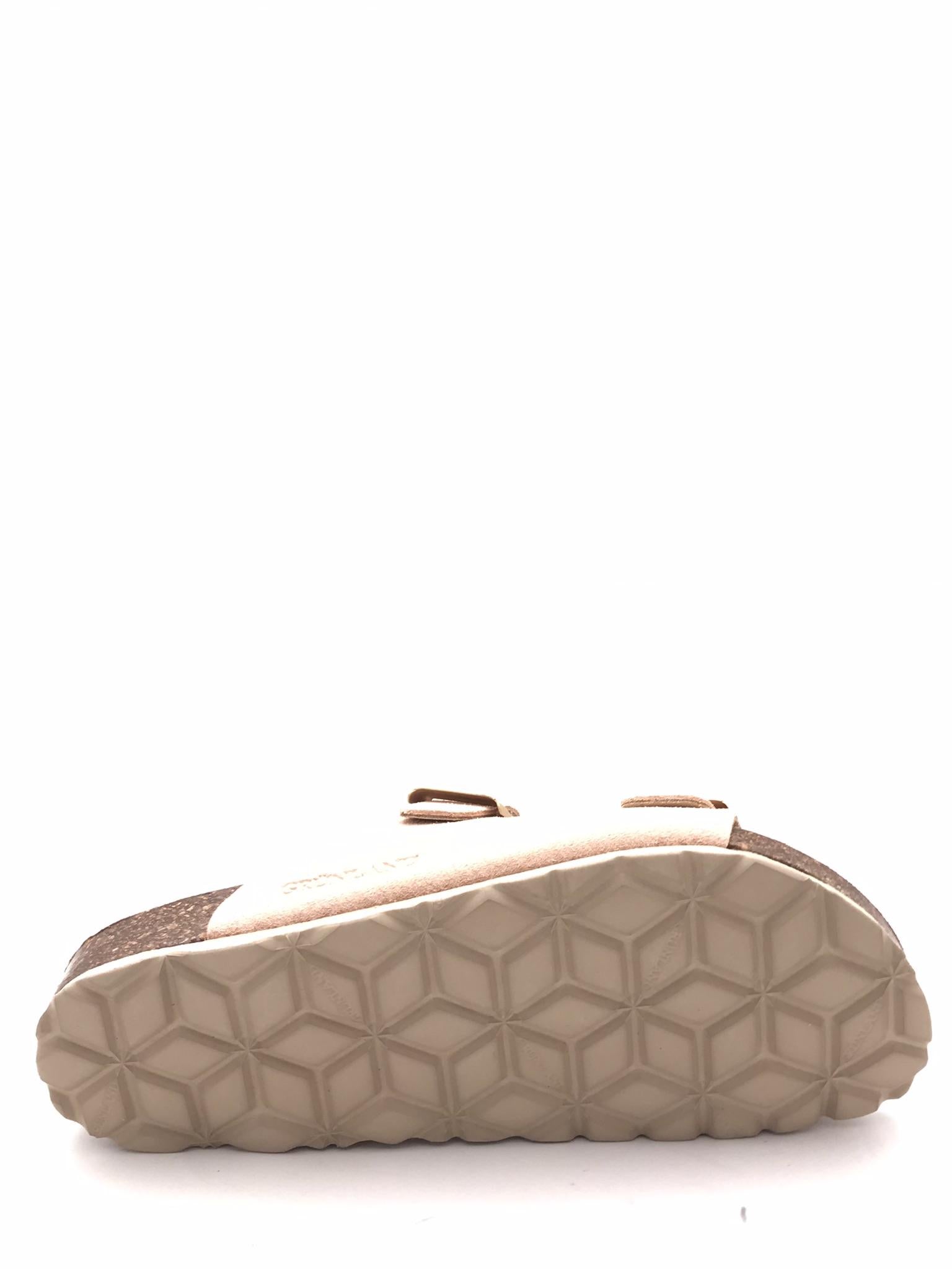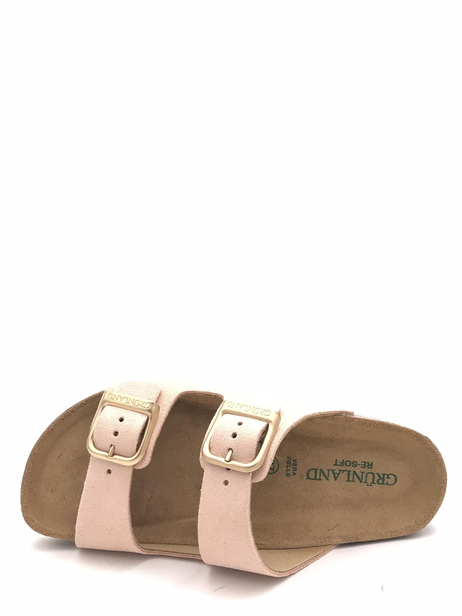 Ciabatta aperta in crosta color pesca. Doppia fascia con fibbia regolabile nel collo piede. Fibbia color oro. Fodera interna in pelle. Plantare anatomico in pelle e sughero con sottopiede RE-SOFT (realizzato in doppio strato di schiuma di poliuretano, primo strato ammortizza il secondo memorizza) che recupera la forma originaria anche dopo molte ore di camminata.