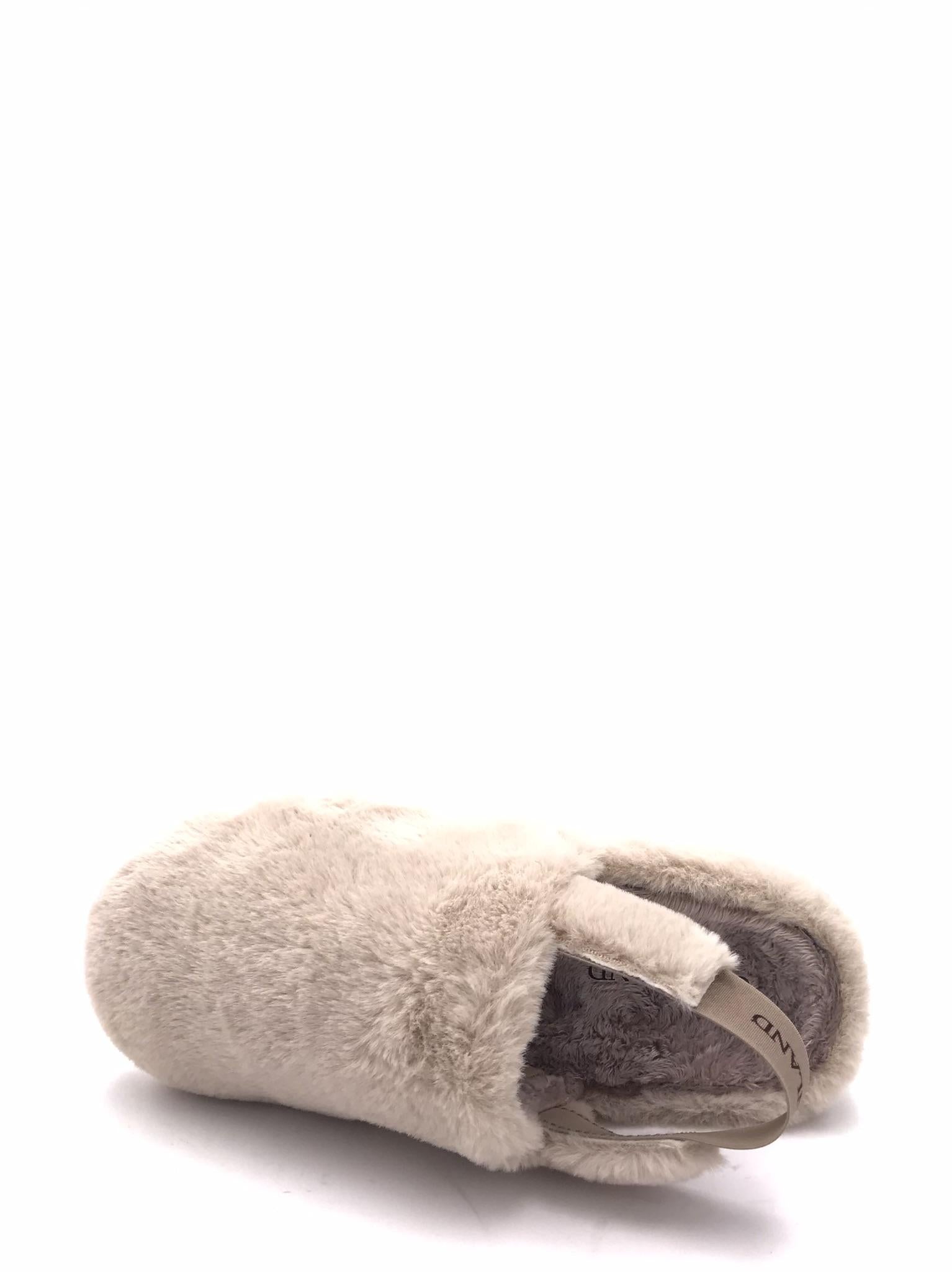 Ciabatta chiusa in panno effetto pelliccia color beige. Elastico logato nel tallone. Fodera interna in panno. Plantare morbido.
