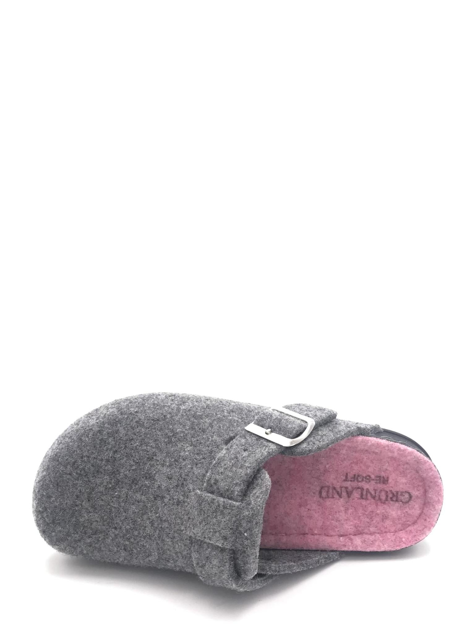 Ciabatta chiusa modello Pila realizzata in lana cotta color grigio. Fibia di regolazione nel collo piede. Fodera interna in lana cotta rosa a contrasto. Plantare in lana a contrasto con sottopiede RE-SOFT (realizzato in doppio strato di schiuma di poliuretano, primo strato ammortizza il secondo memorizza) che recupera la forma originaria anche dopo molte ore di camminata.