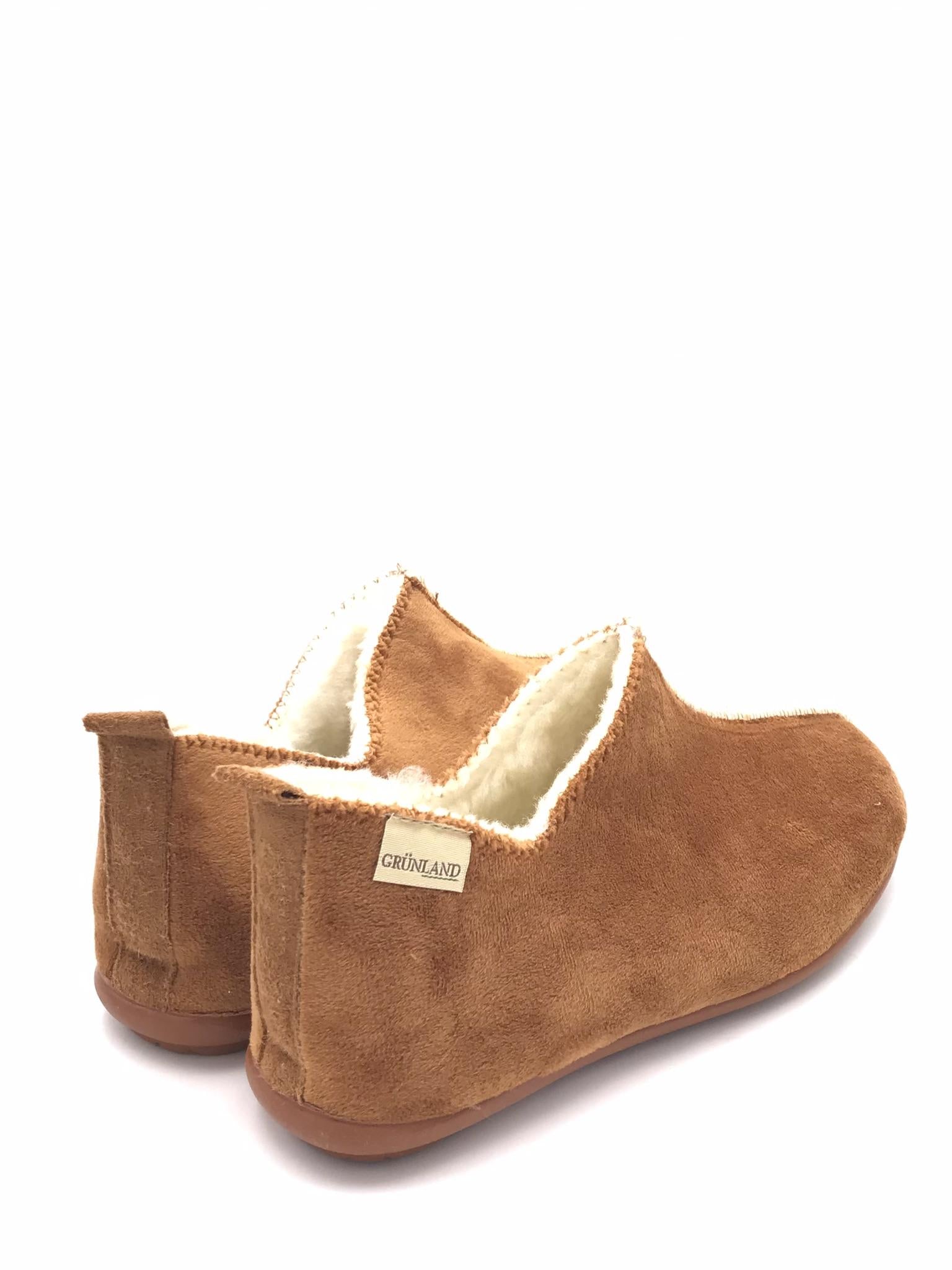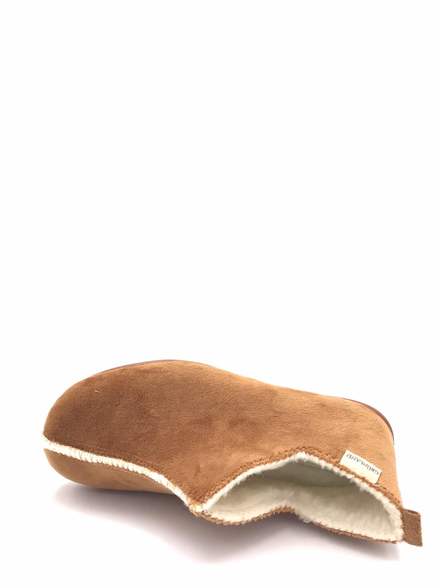 Pantofola chiusa in panno effetto montone color cuoio con cuciture a vista color panna. Fodera interna in panno. Plantare morbido.