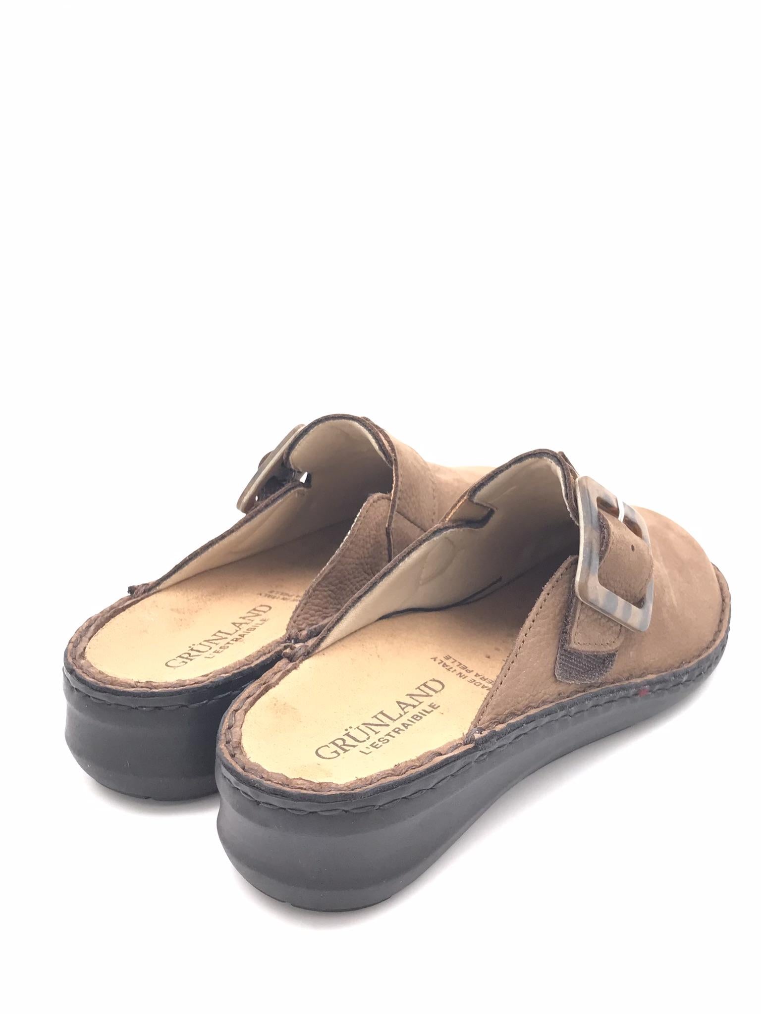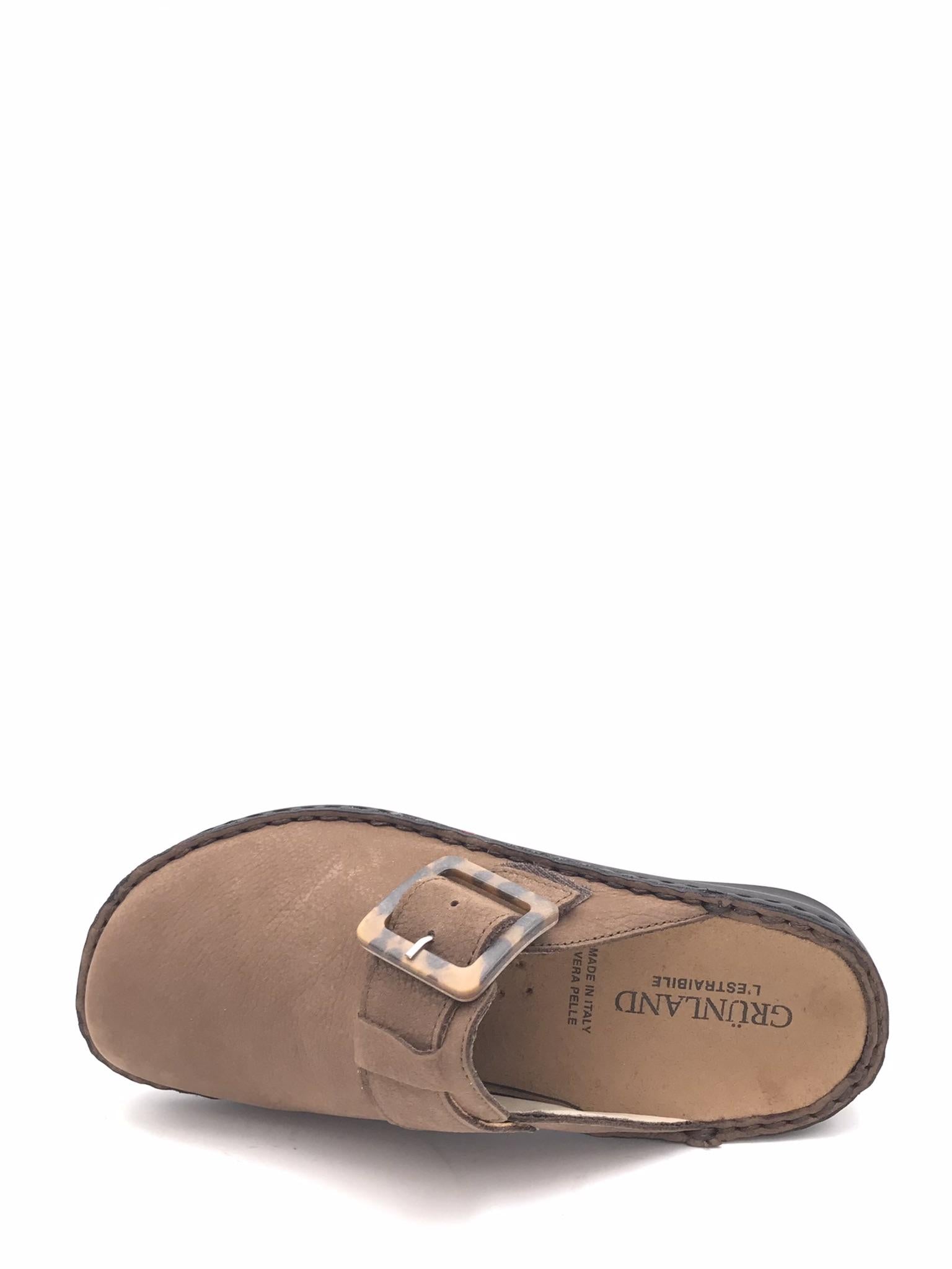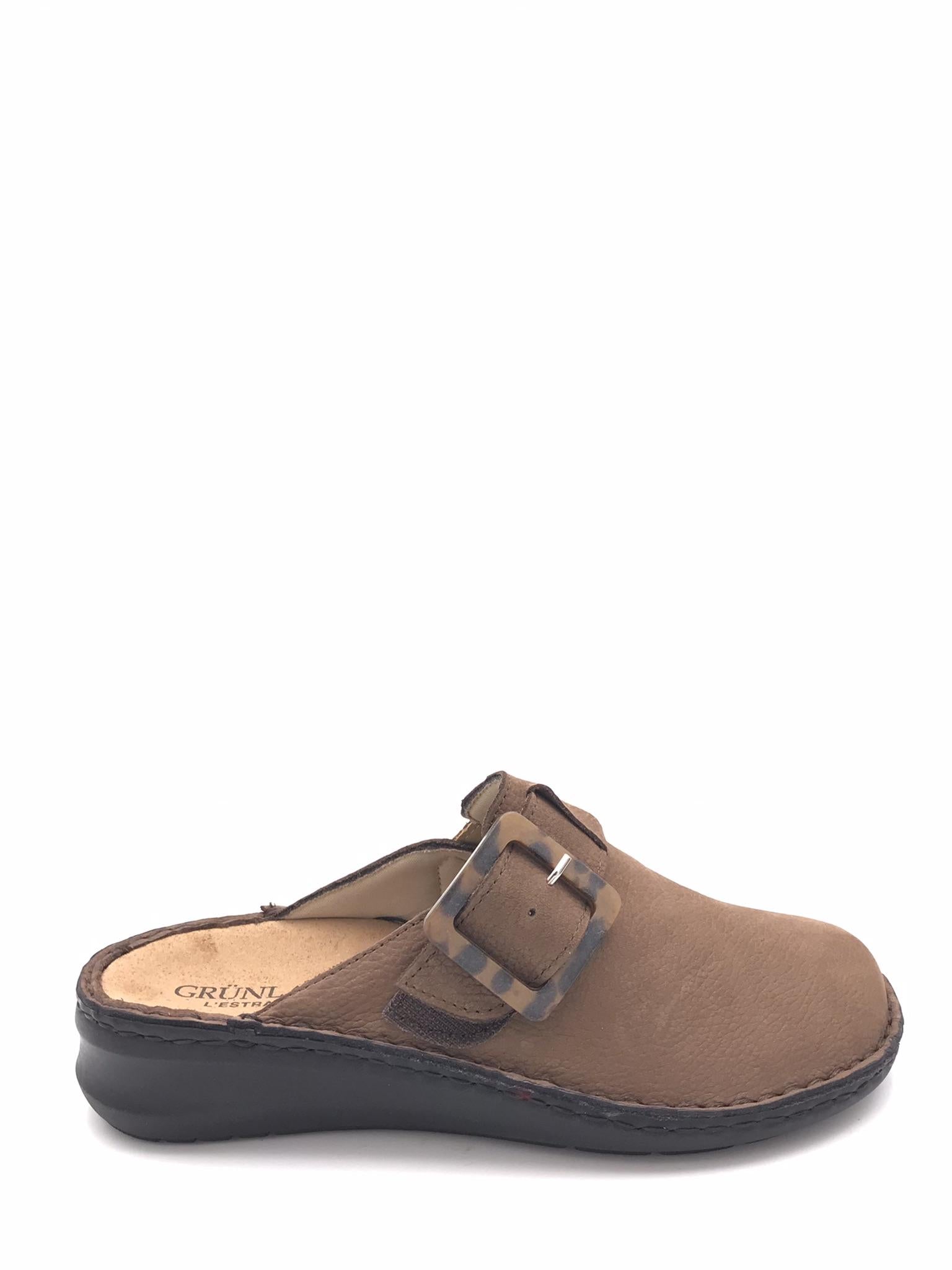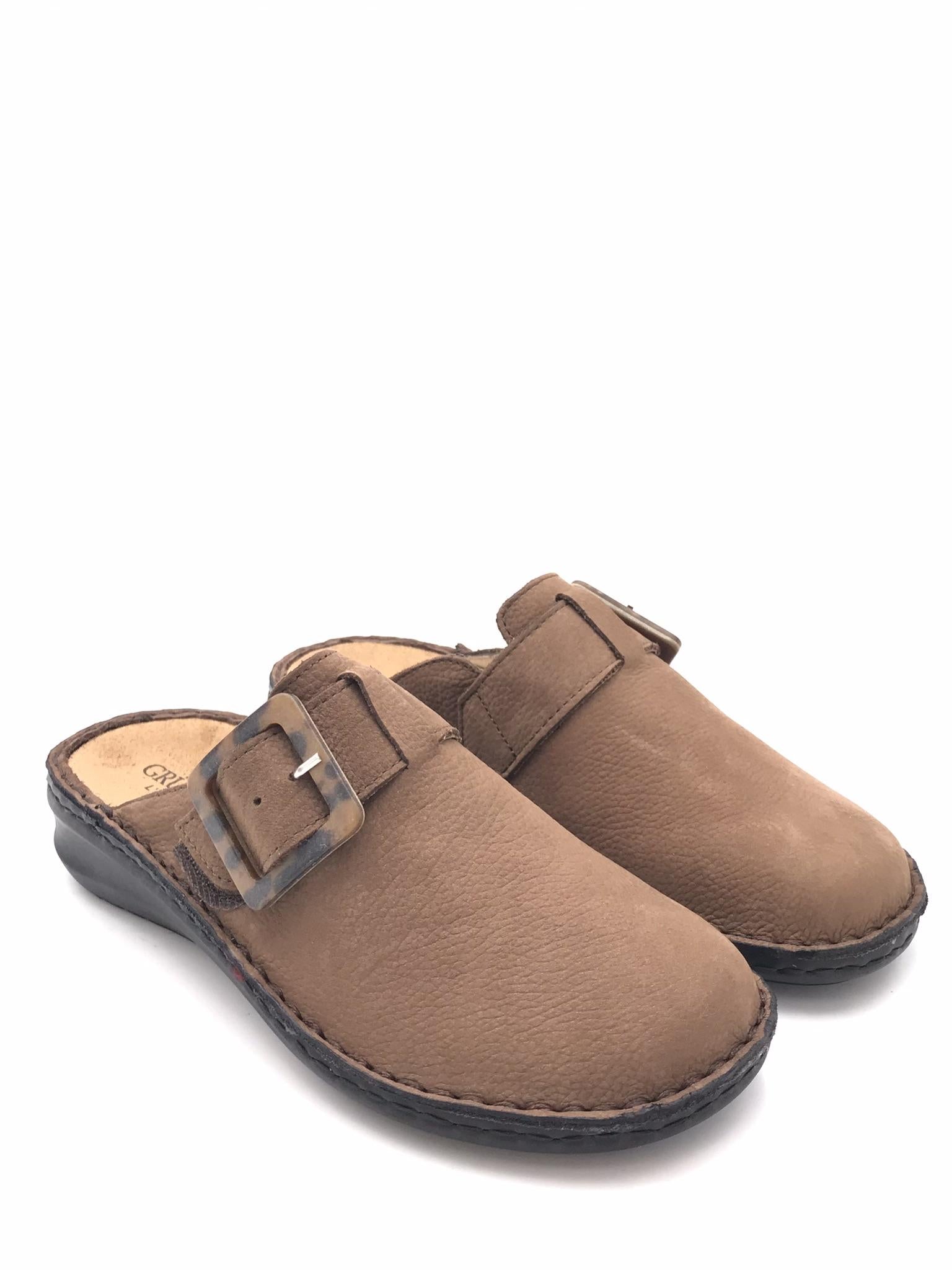 Ciabatta comfort chiusa in punta in camoscio color terra. Fascia con cinturino regolabile nel collo piede con fibbia animalier. Plantare anatomico estraibile (mescola di lattice e sughero naturale in grado di ammortizzare la camminata e dare il massimo comfort al piede).