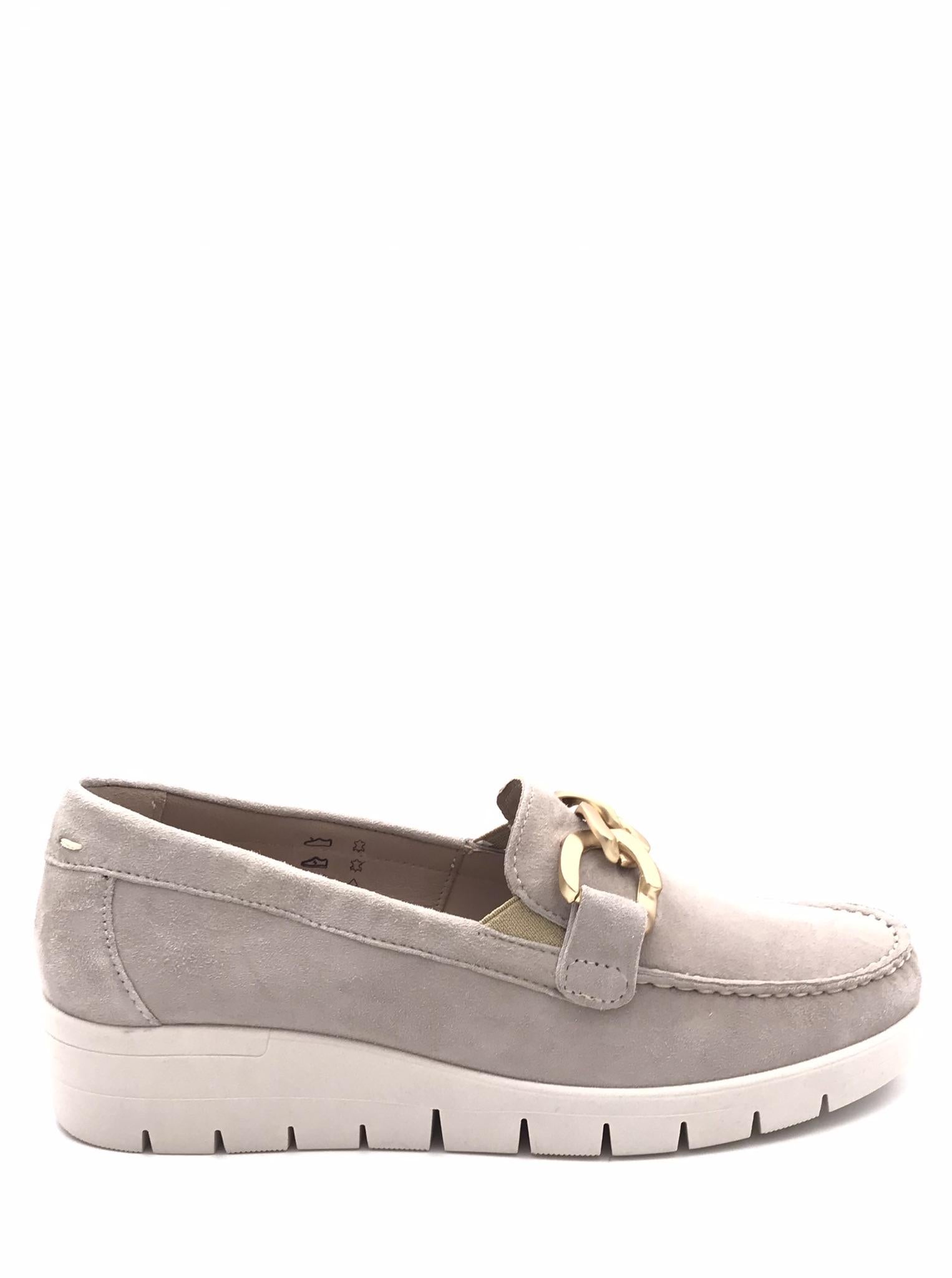 Mocassino modello Tafa in camoscio color ghiaccio. Morsetto in metallo oro applicato nel collo piede. Elastico nel collo piede. Fodera interna in pelle. Plantare DRY SOFT (realizzato con speciale schiuma che assorbe l'umidità e la rilascia rapidamente una volta che viene estratto il plantare). Suola leggera in gomma flessibile con zeppa altezza 3 cm