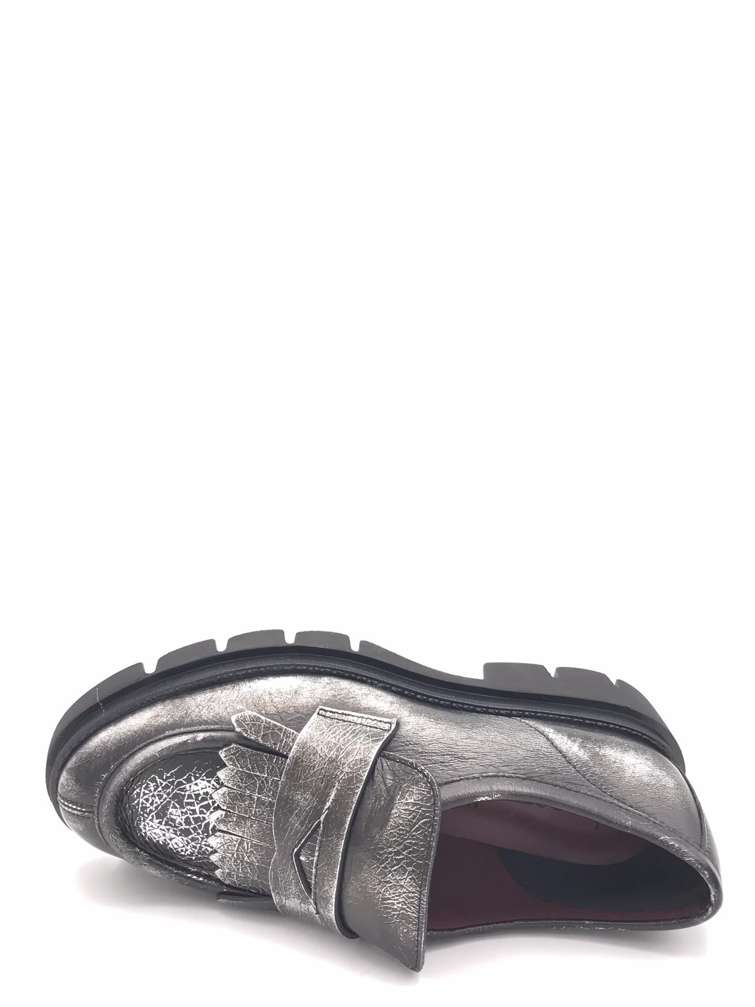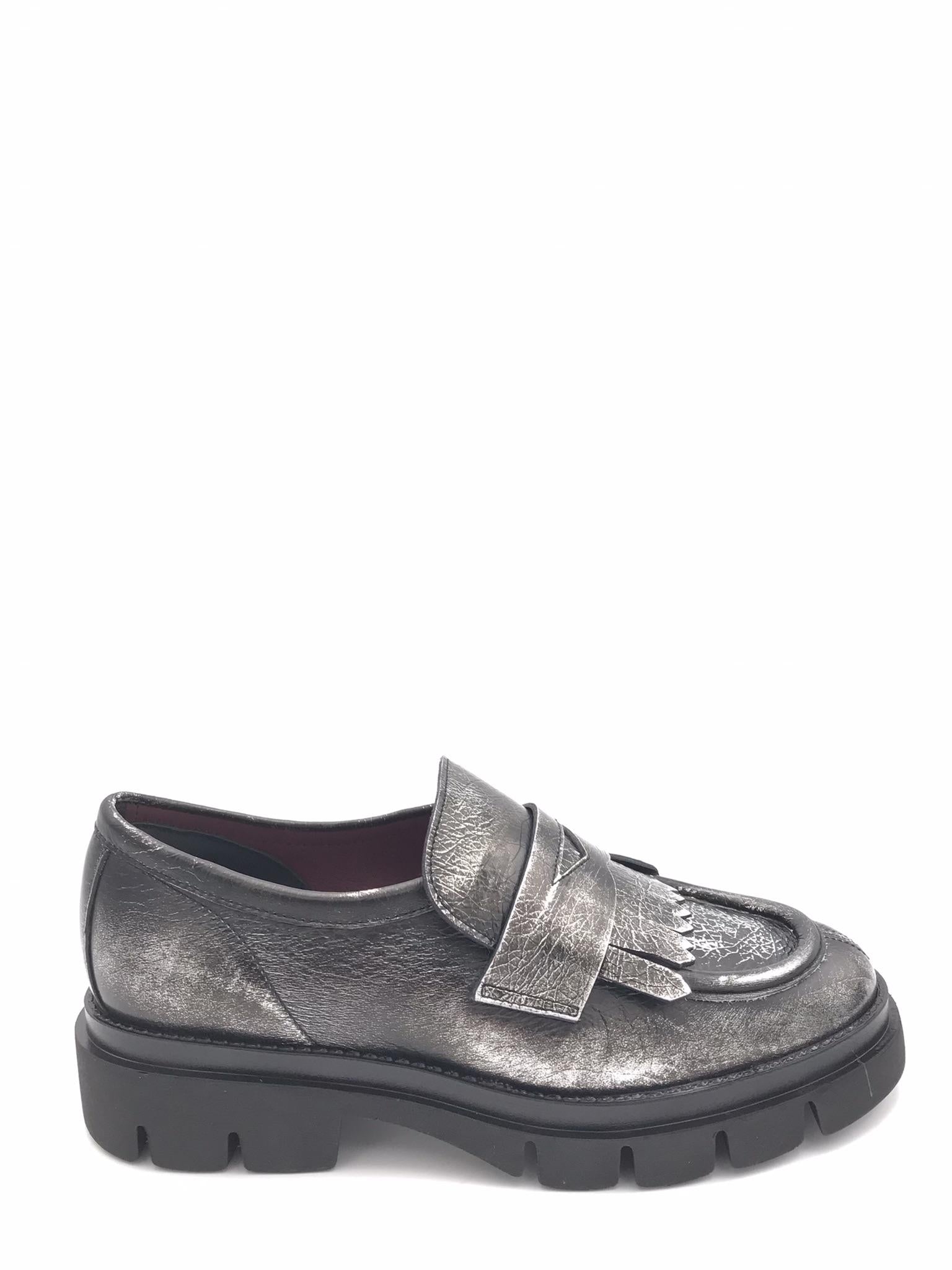 Mocassino realizzato in pelle craccata asportabile antracite. Forma arrotondata con vaschetta cucita nel puntale. Passante con frangia applicata nel collo piede. Fodera interna in pelle. Suola in gomma leggera con guardolo cucito. Lavorazione artigianale