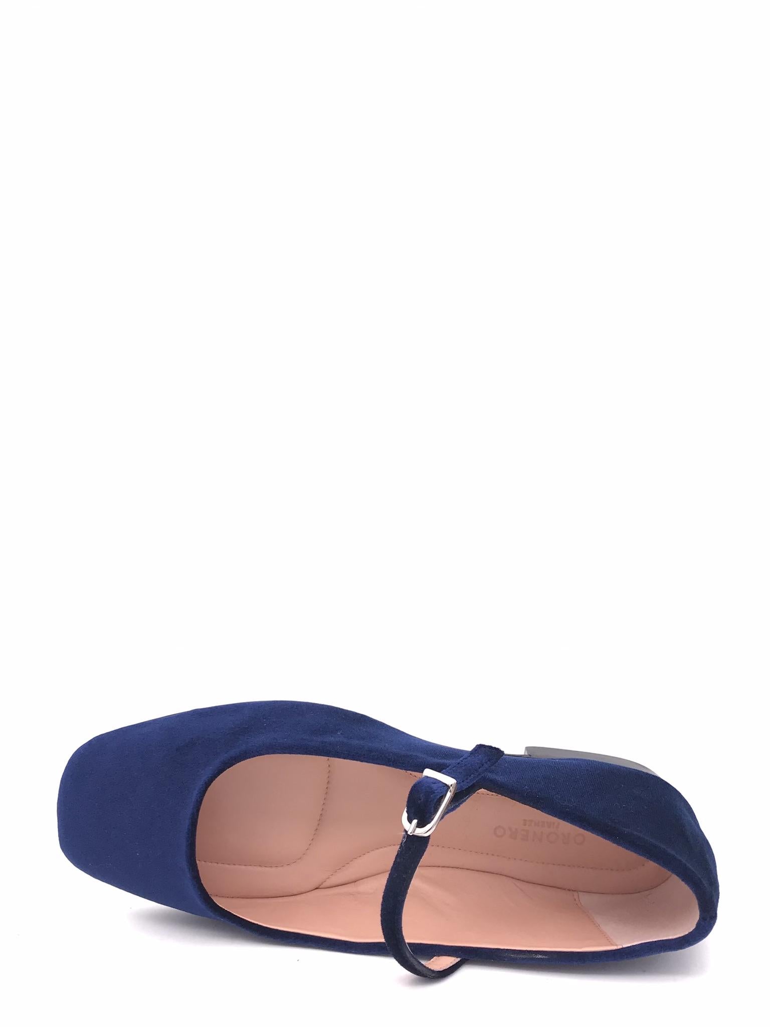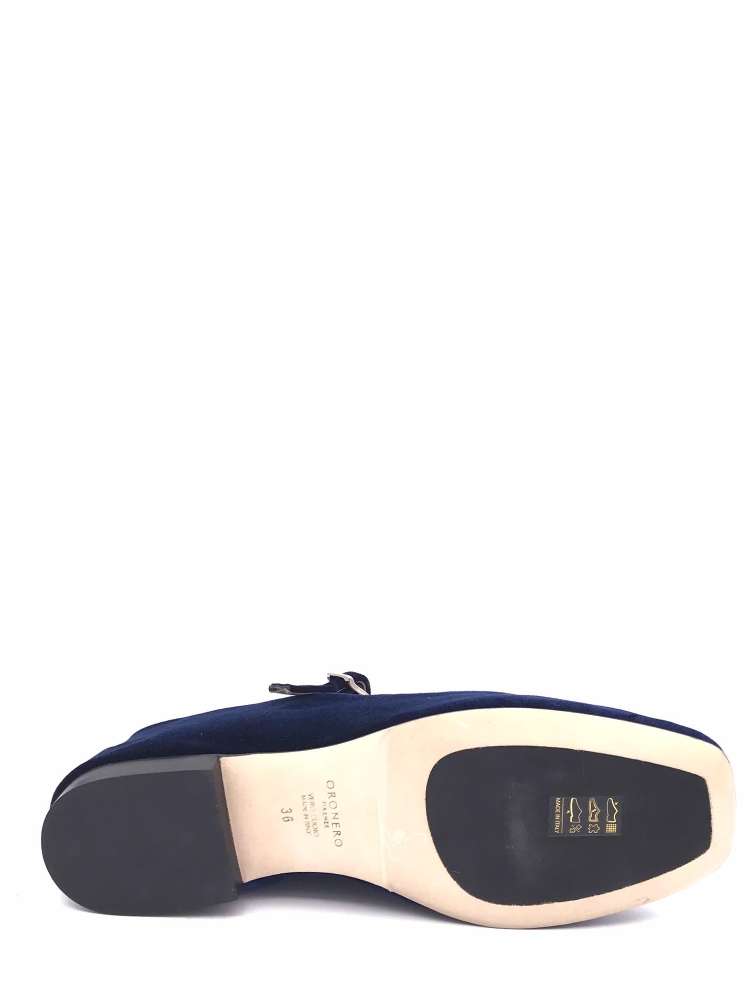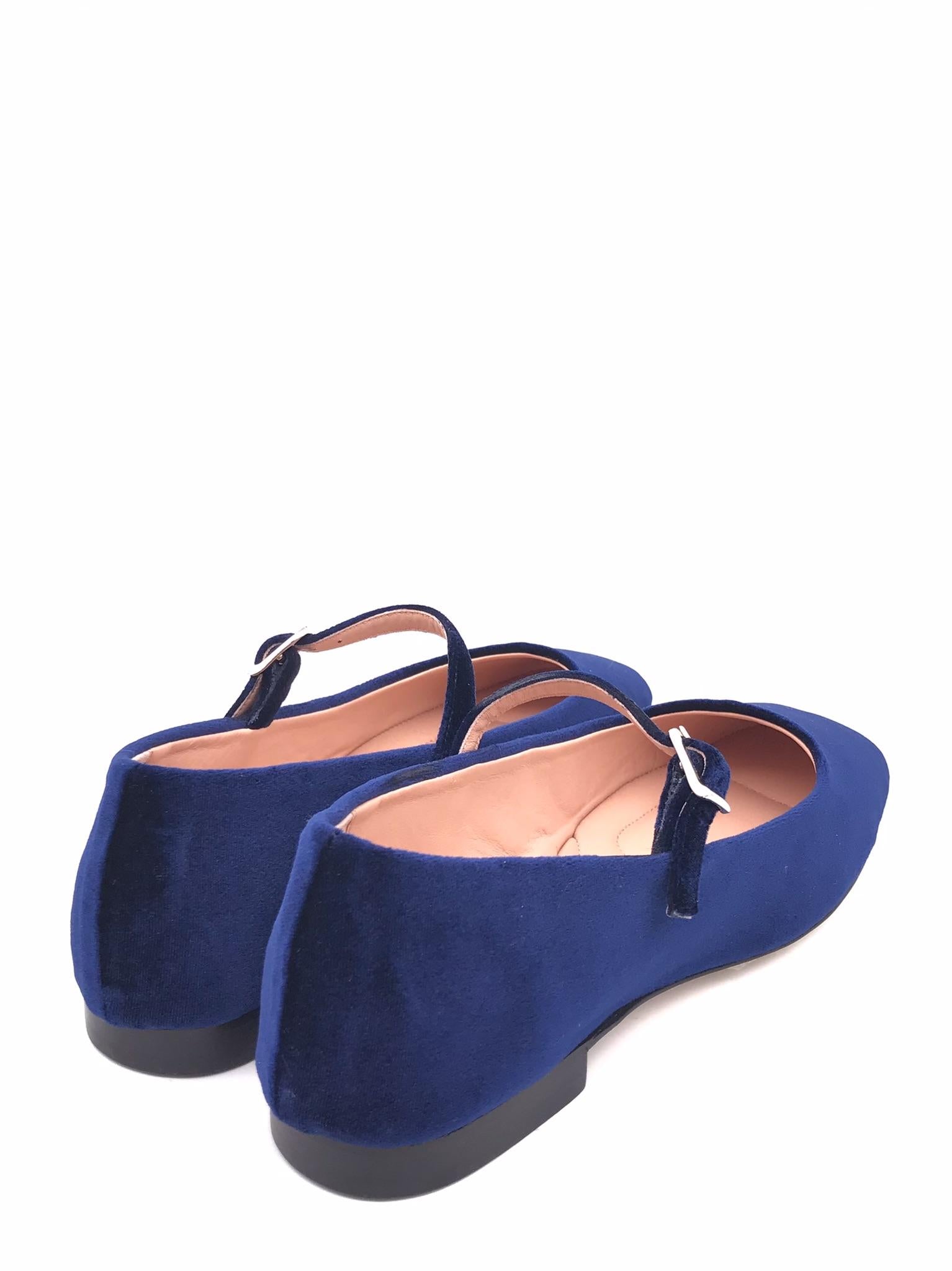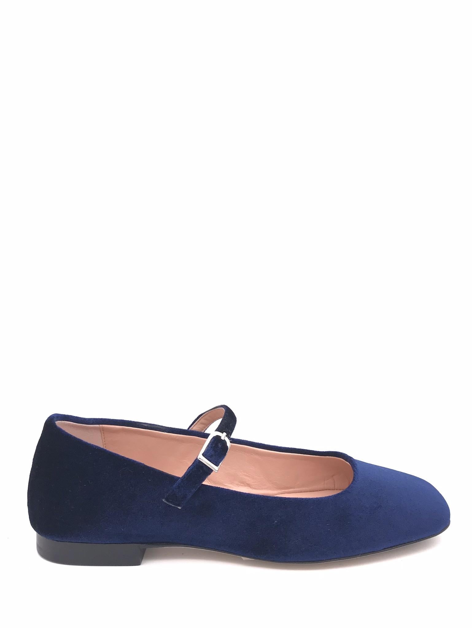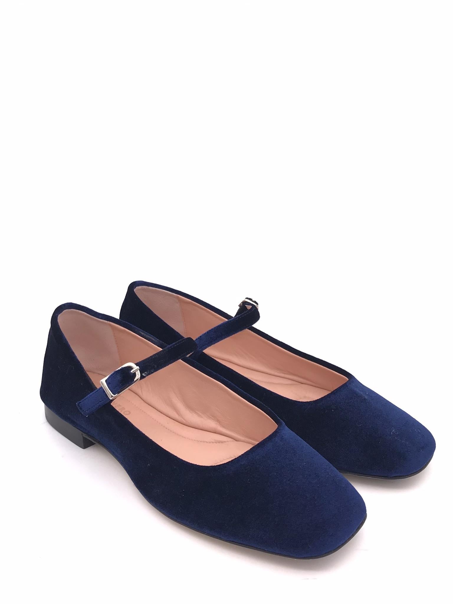Ballerina bassa modello Emma realizzata in velluto blu. Forma squadrata. Scollatura arrotondata. Fodera interna in pelle e sottopiede in pelle con lavorazione a sacchetto. Cinturino regolabile nel collo piede. Tacco altezza 1 cm. Fondo in cuoio con inserto in gomma. Lavorazione artigianale