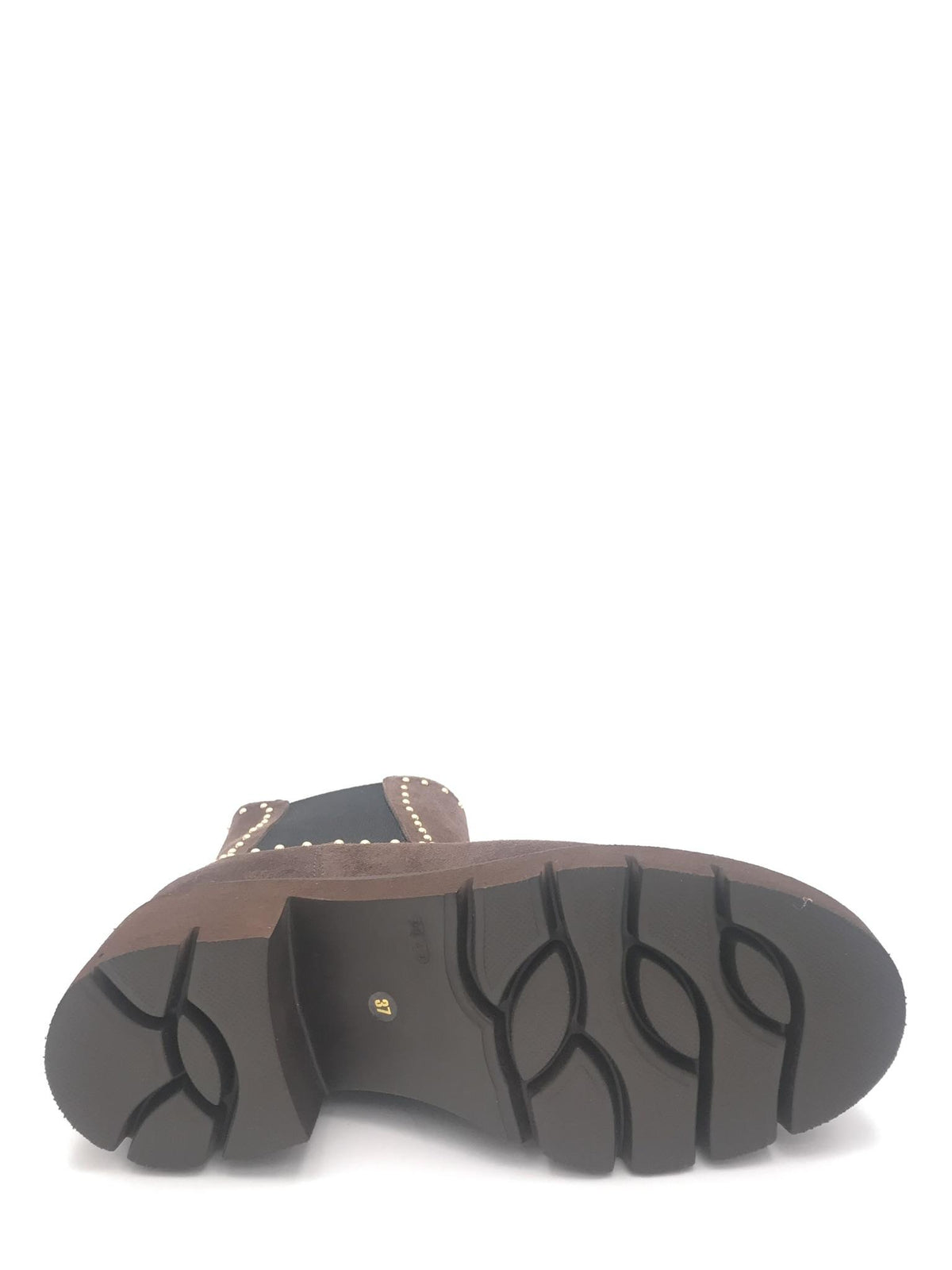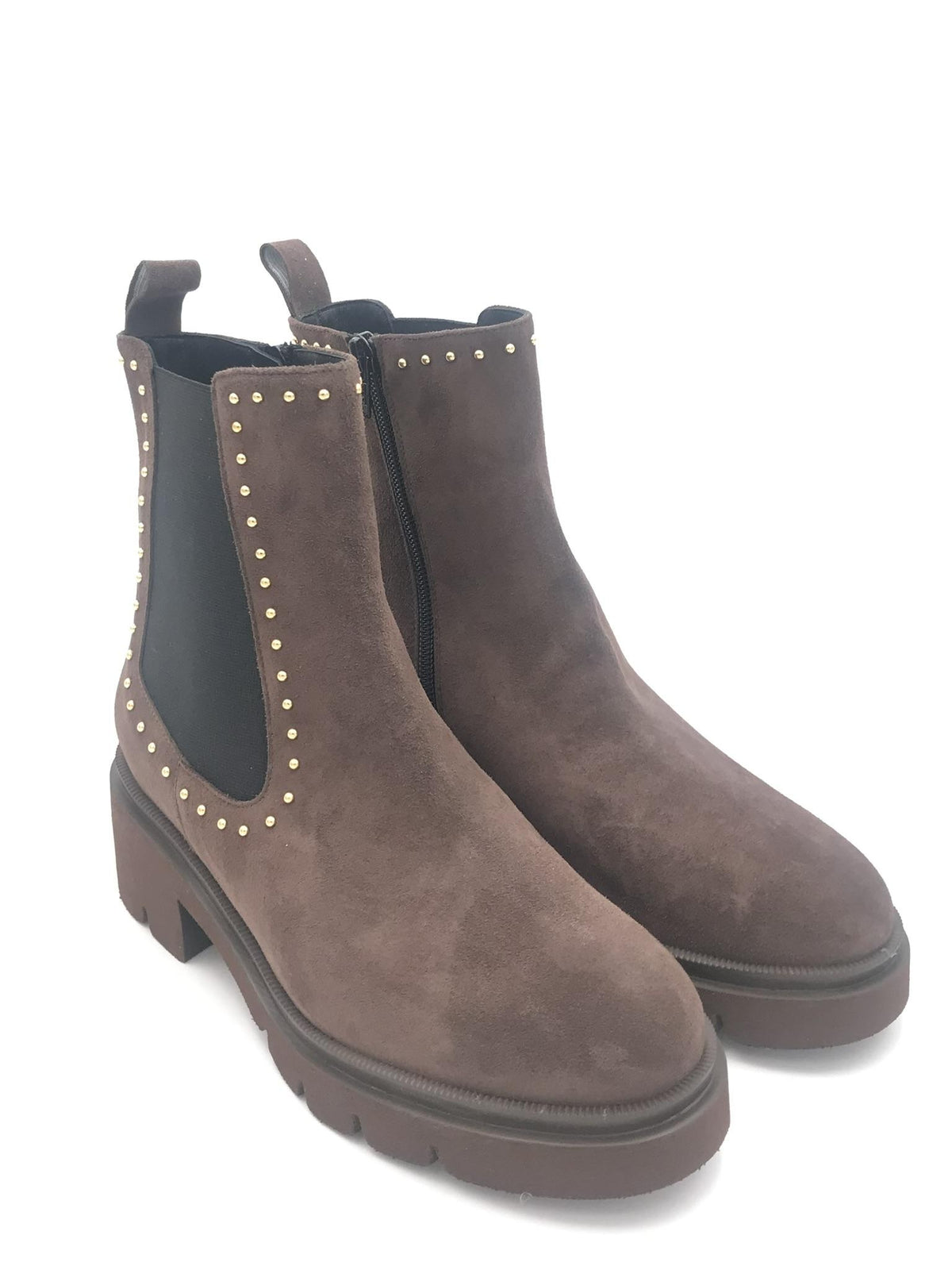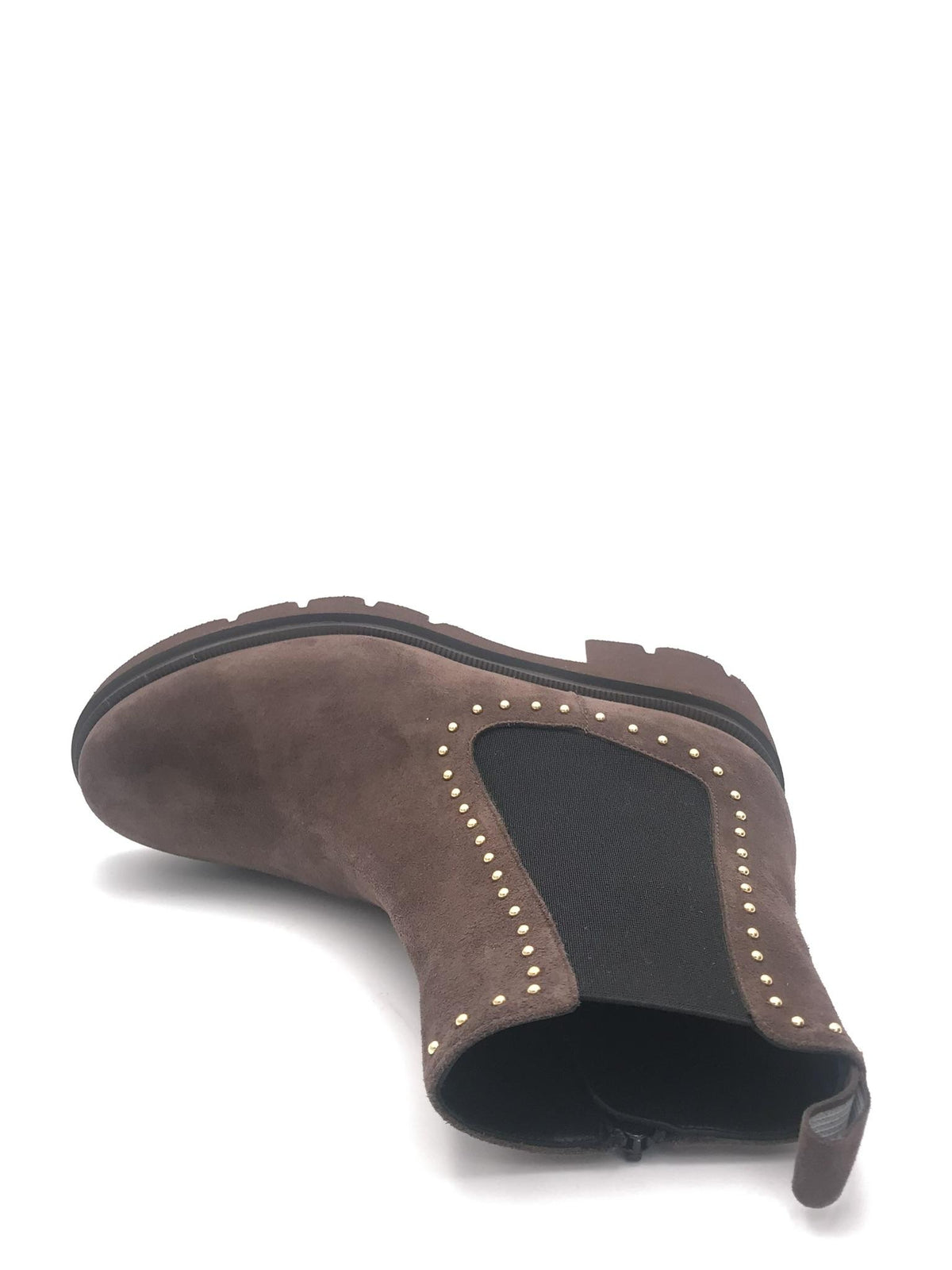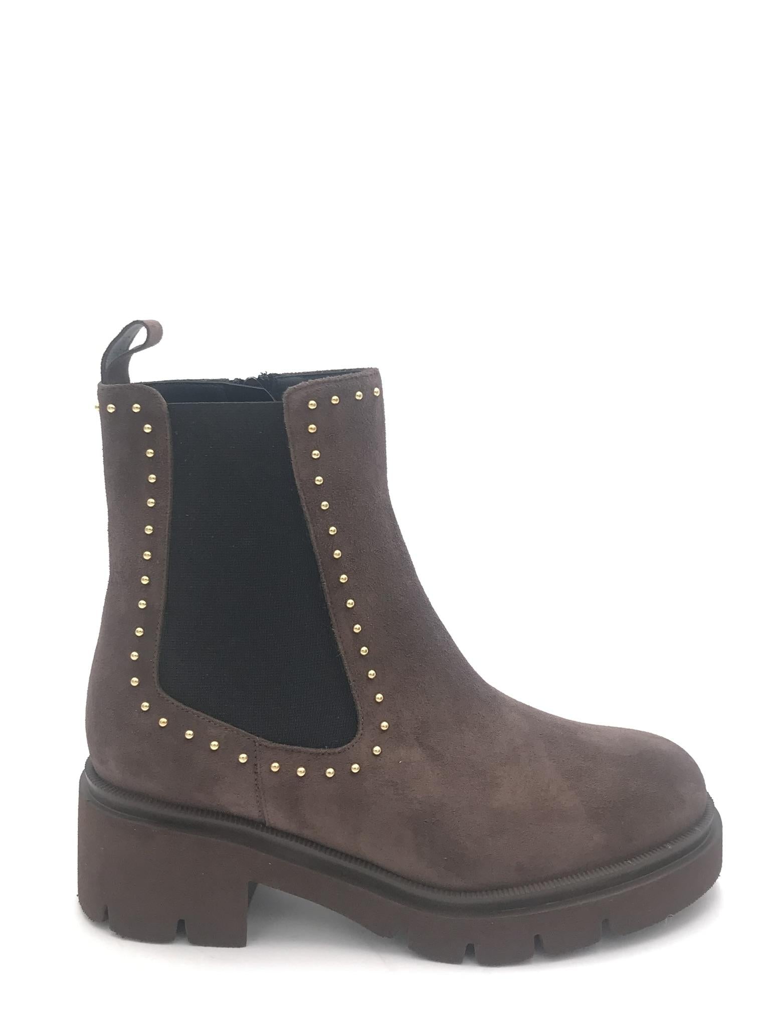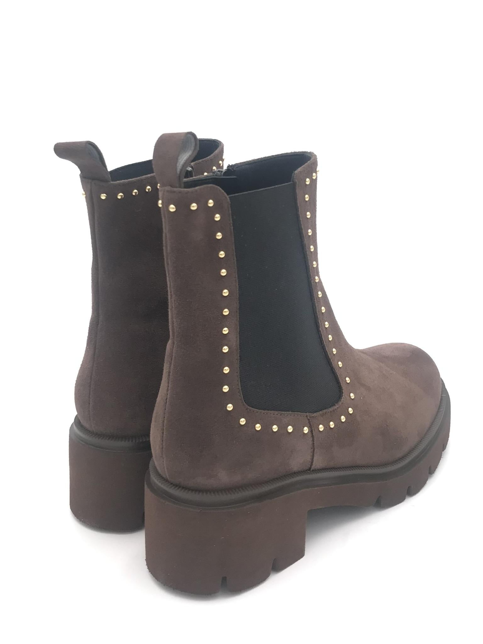 Beatles realizzato in crosta color moro. Forma arrotondata. Dettaglio di micro borchie applicate nella tomaia ed elastico laterale. Zip interna di chiusura. Fodera interna in pelle. Suola in gomma leggera effetto roccia. Lavorazione artigianale