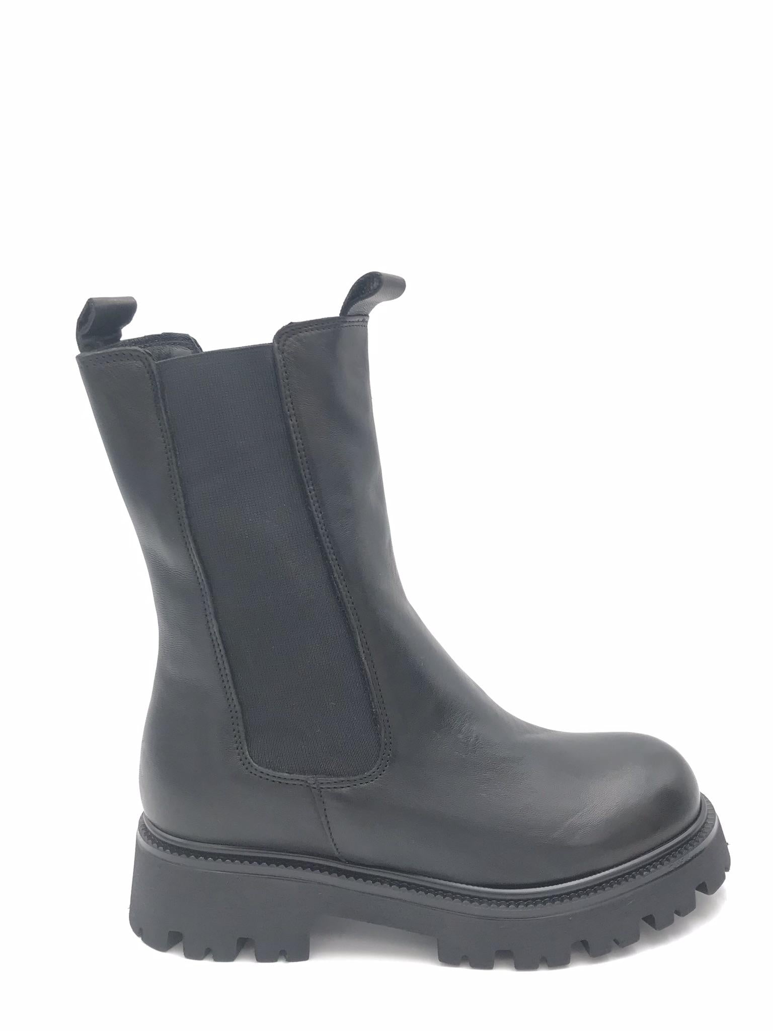 Boot realizzato in pelle nera. Elastici laterali. Forma arrotondata. Fodera interna in pelle. Sottopiede morbido in pelle. Suola in gomma leggera effetto roccia.