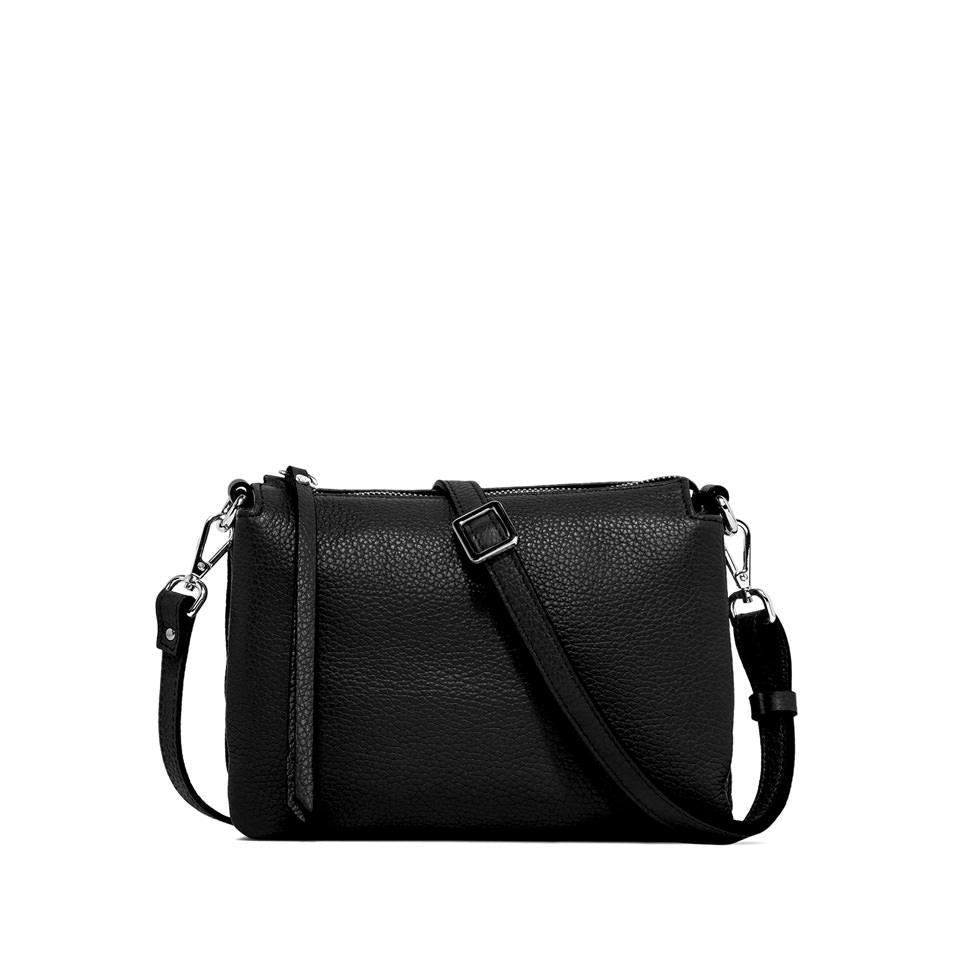 La borsa Three è realizzata in pregiata pelle martellata color nero. Giovane e divertente è composta da tre bustine che convergono nella parte superiore nel dettaglio della zip a contrasto. Da portare a mano o a spalla con la pratica tracolla in dotazione. Dimensioni: 21x15x6 cm.