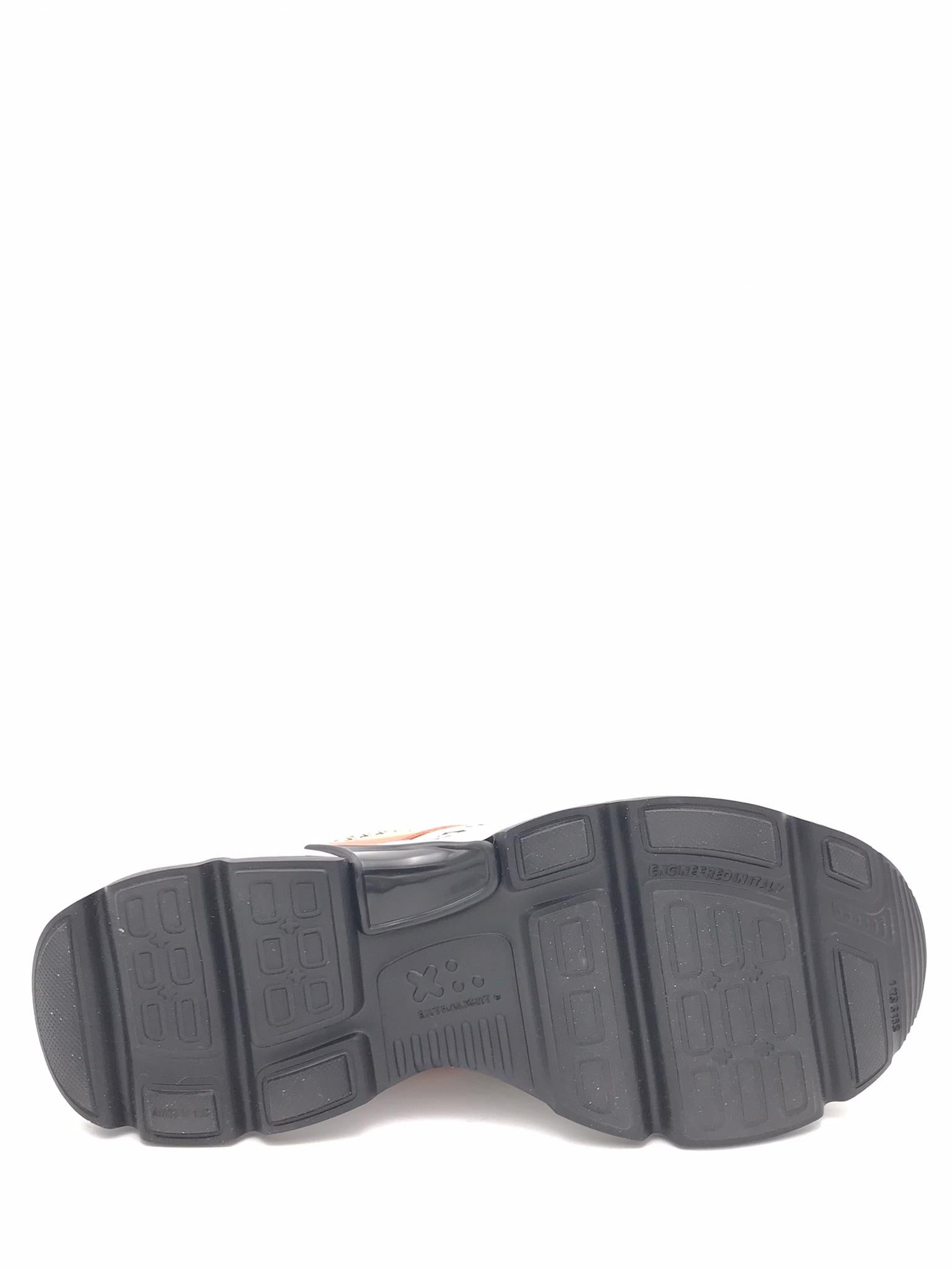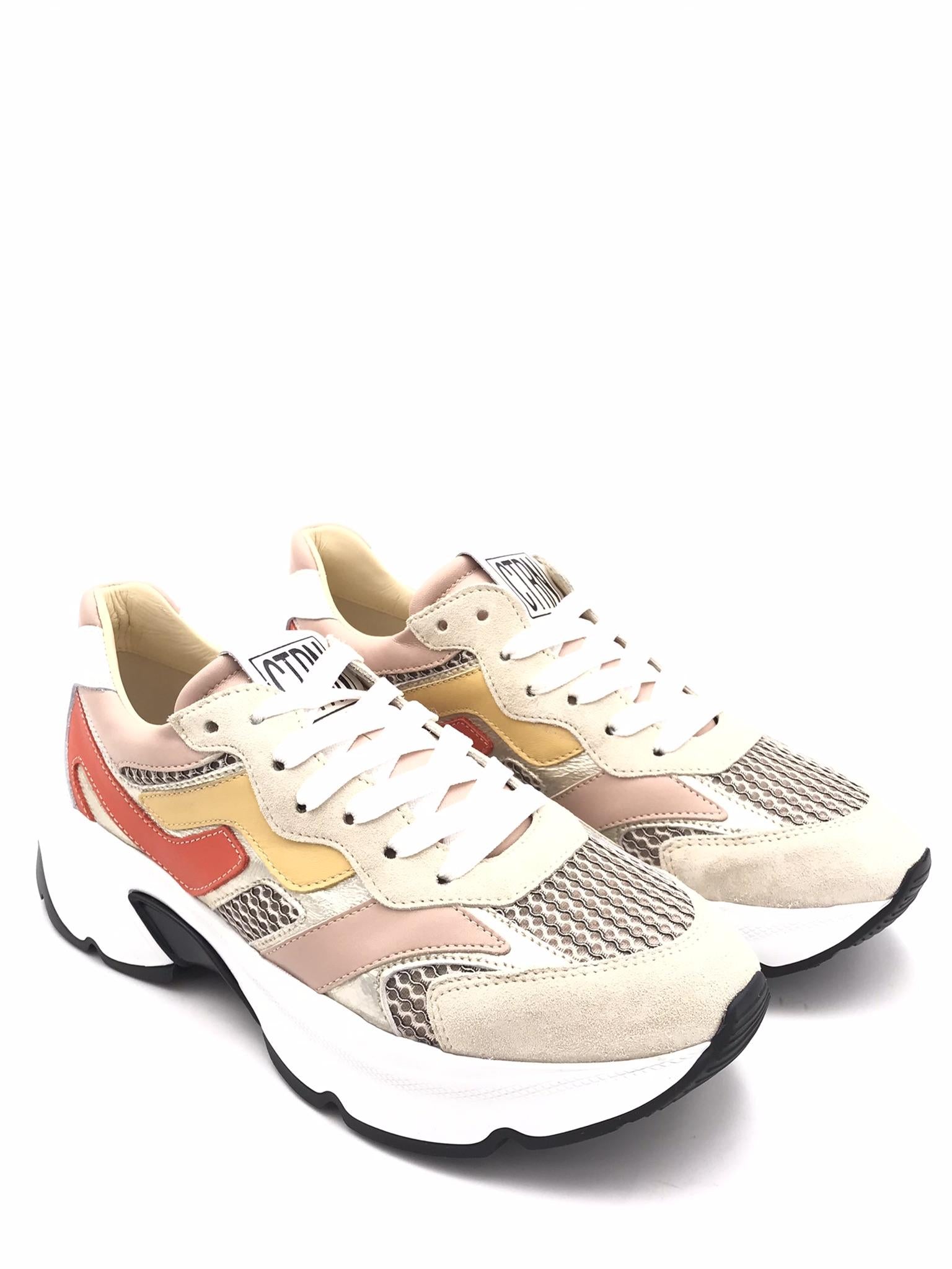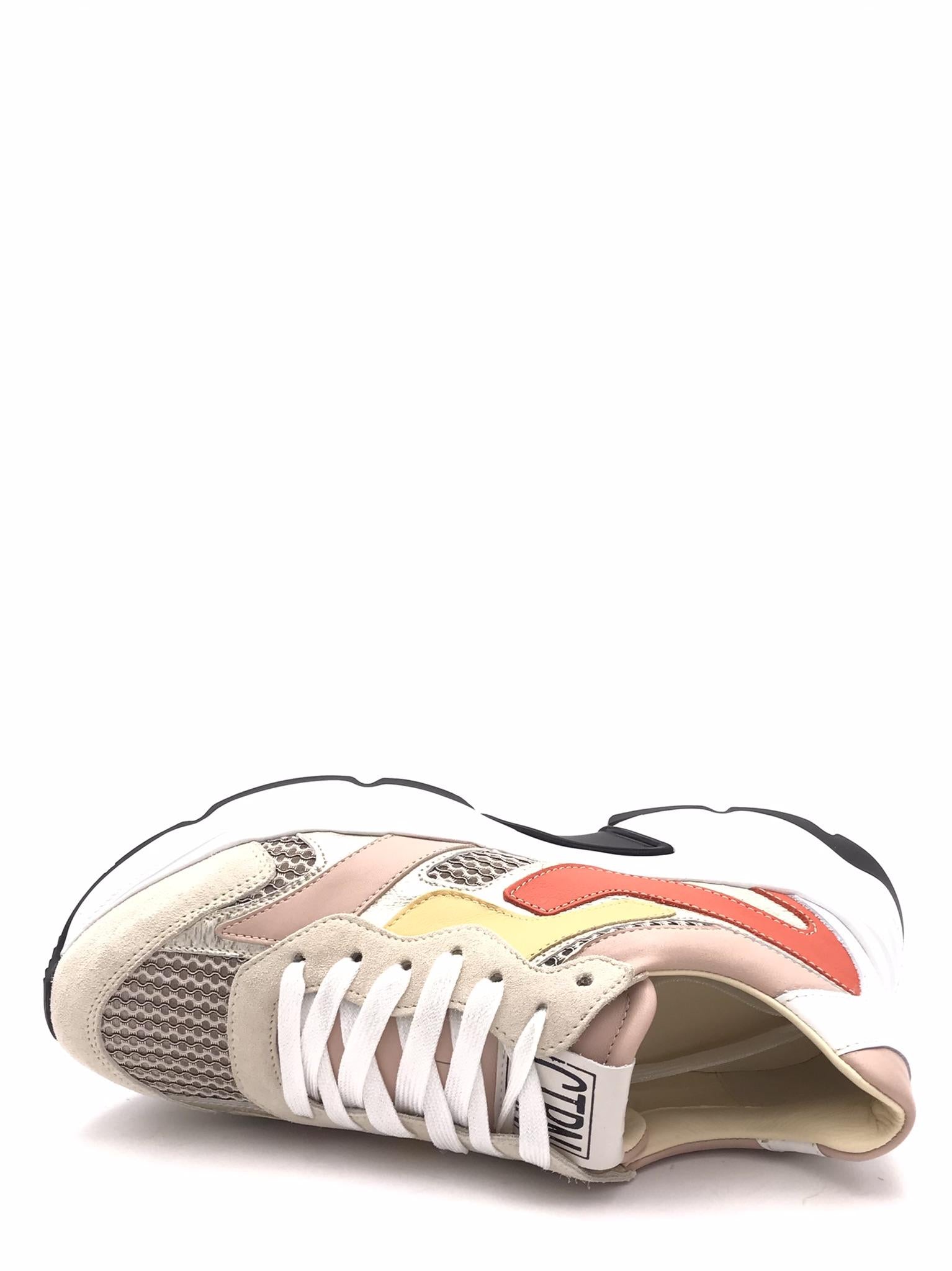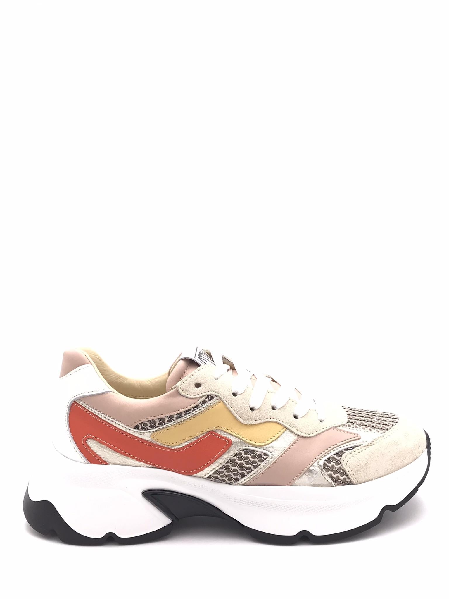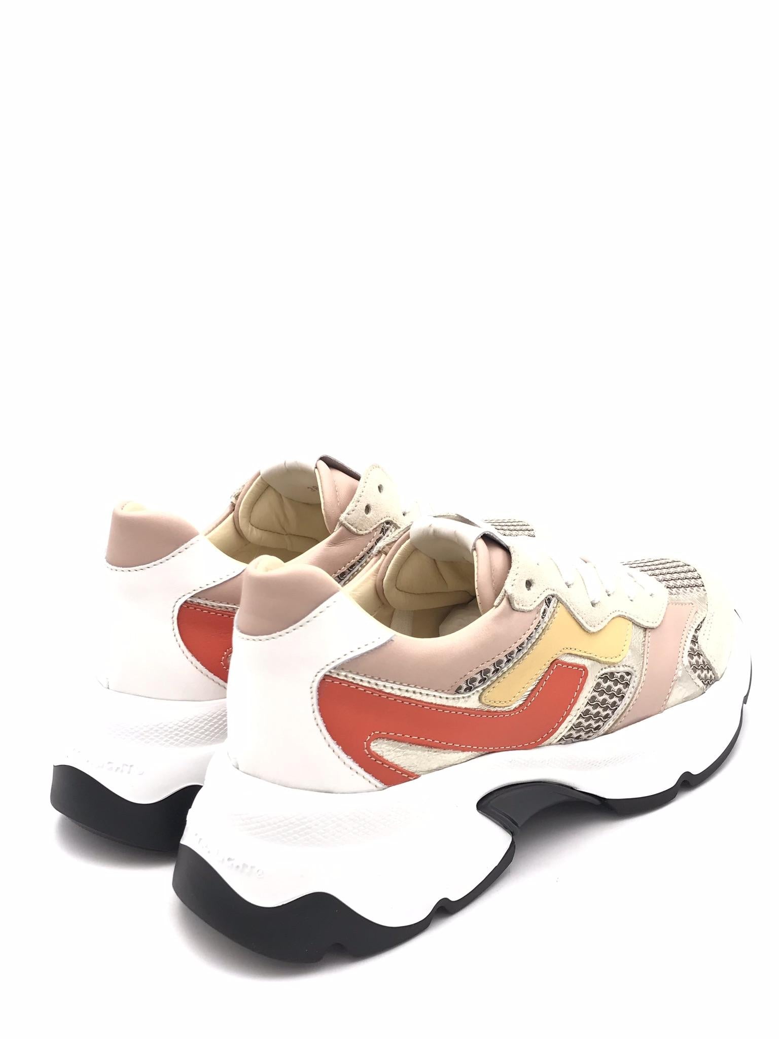 Sneakers in pelle bianca, rosa e laminata platino con inserti in tessuto effetto rete color beige. Punta e bordo lacci in crosta beige. Dettagli in pelle colorata arancione e ocra. Laccio bianco. Fodera interna in pelle. Plantare estraibile morbido in pelle e lattice. Suola running oversize dal design particolare bianca e nera. Lavorazione artigianale.