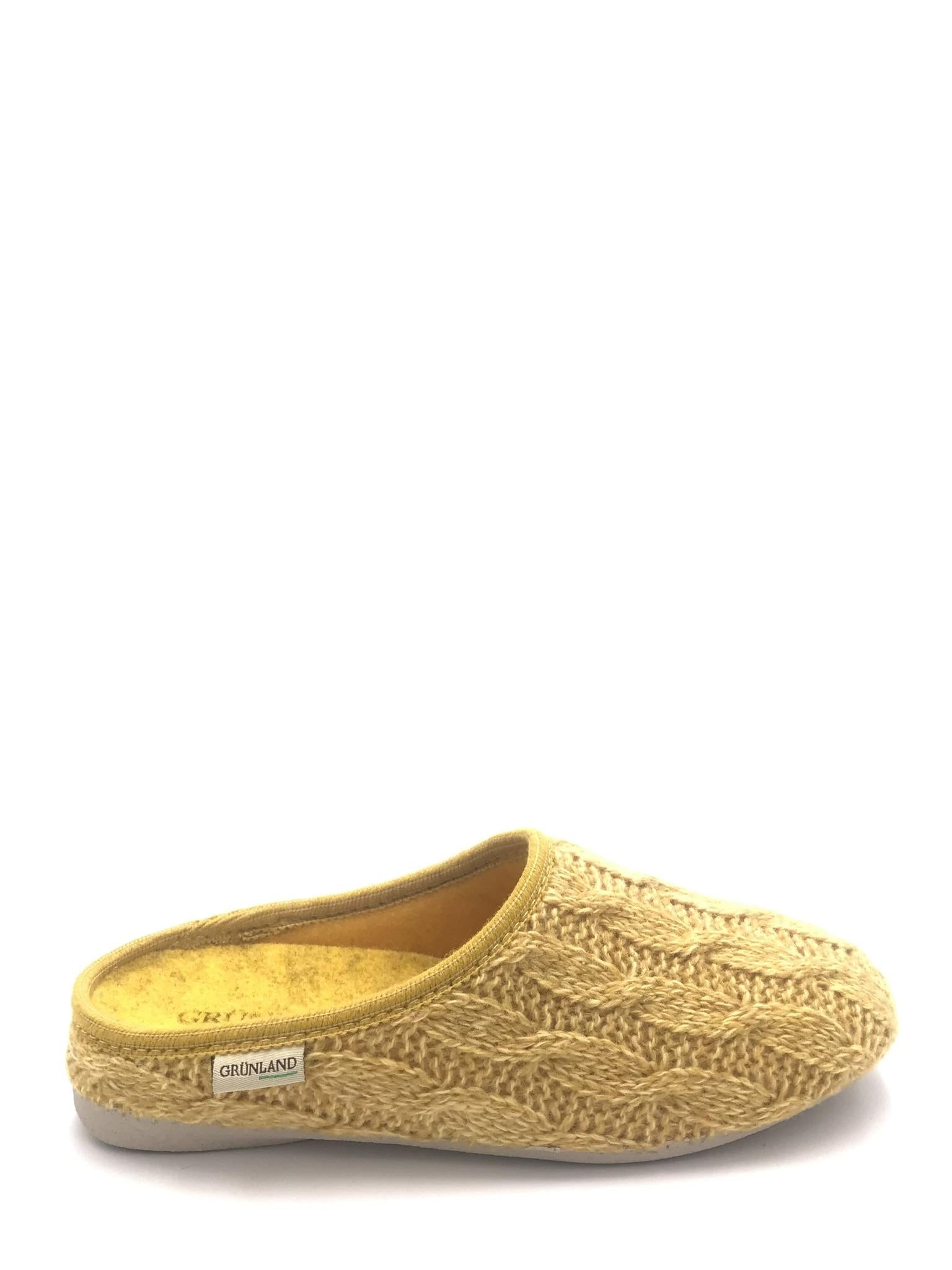 Ciabatta chiusa in panno effetto lana color giallo. Fodera interna in panno. Plantare morbido estraibile.