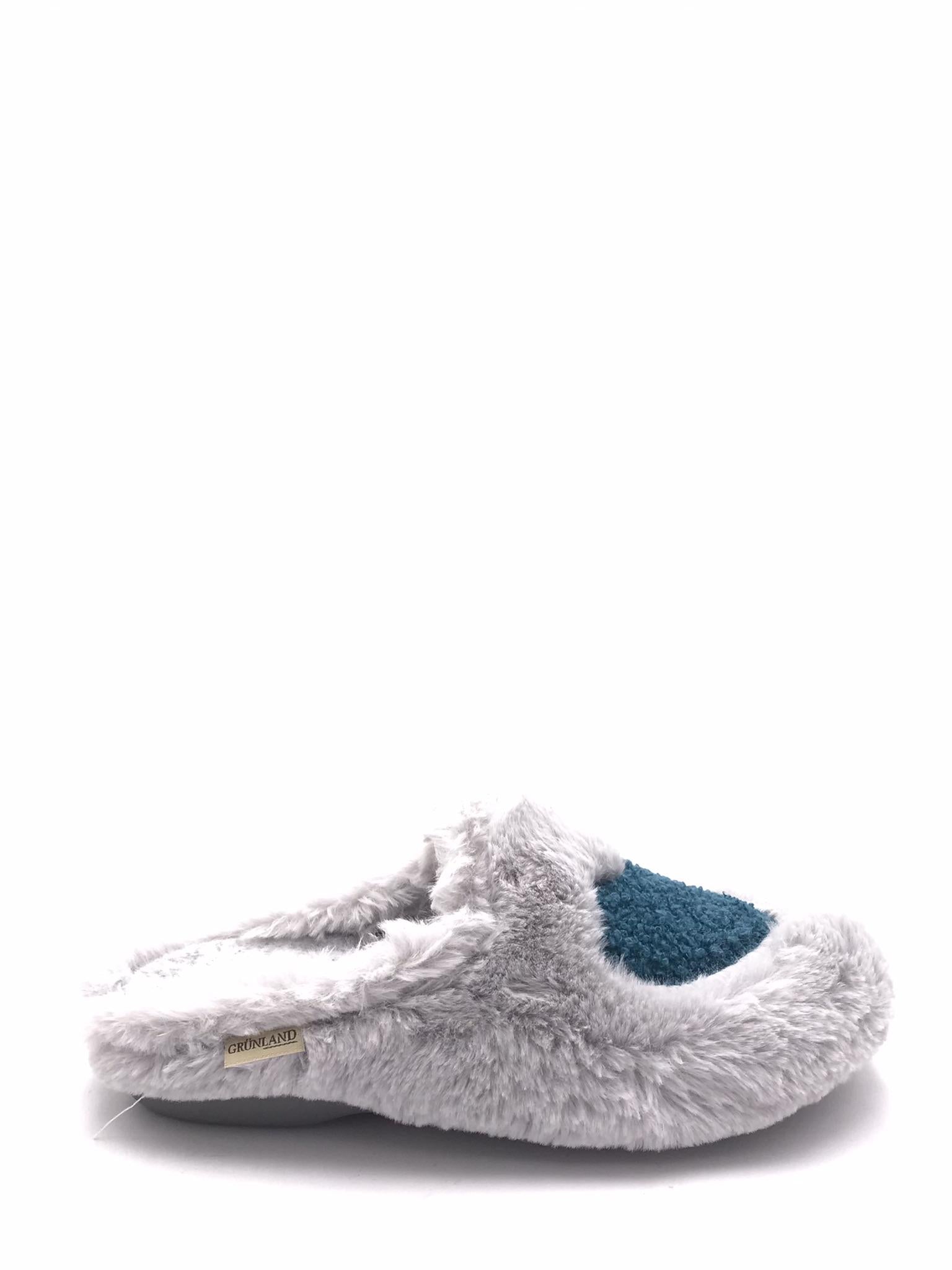 Ciabatta Alin chiusa in panno color grigio con cuore a contrasto blu. Fodera interna in panno grigio a contrasto. Plantare morbido.