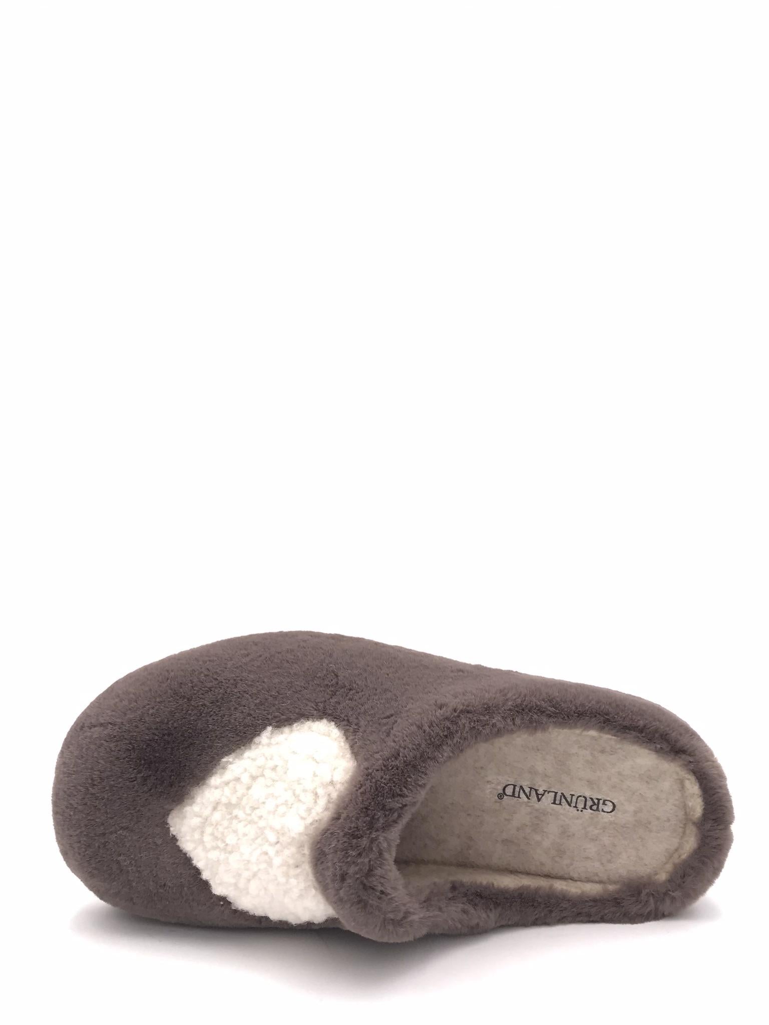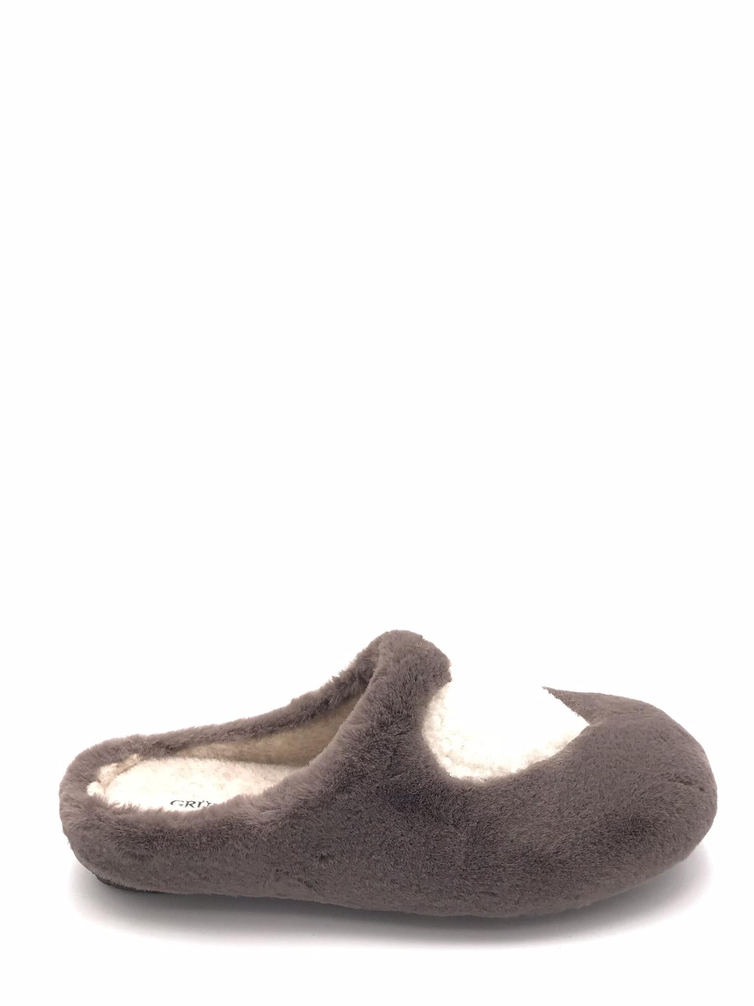 Ciabatta chiusa in panno color taupe con cuore a contrasto panna. Fodera interna in panno panna a contrasto. Plantare morbido.