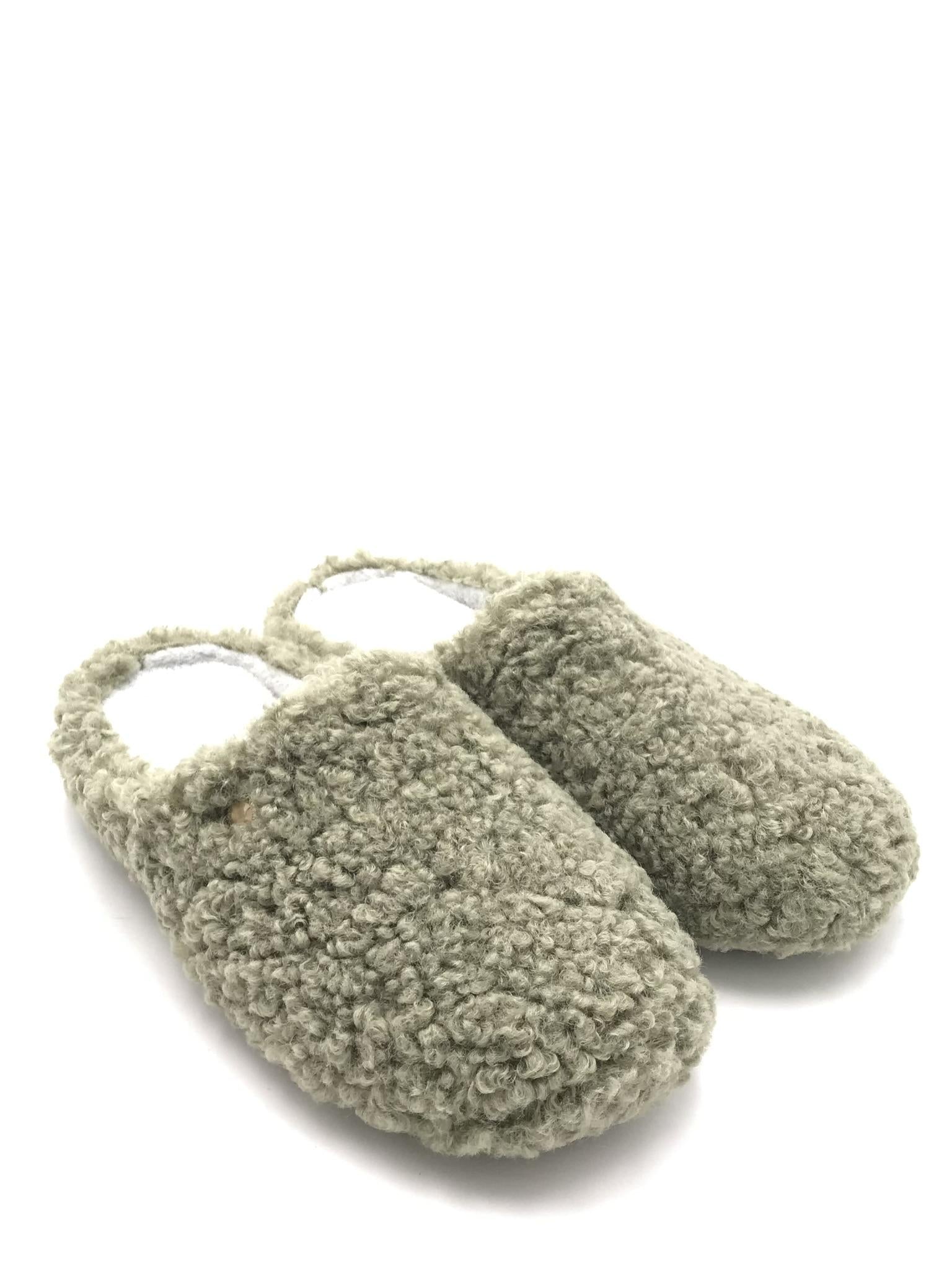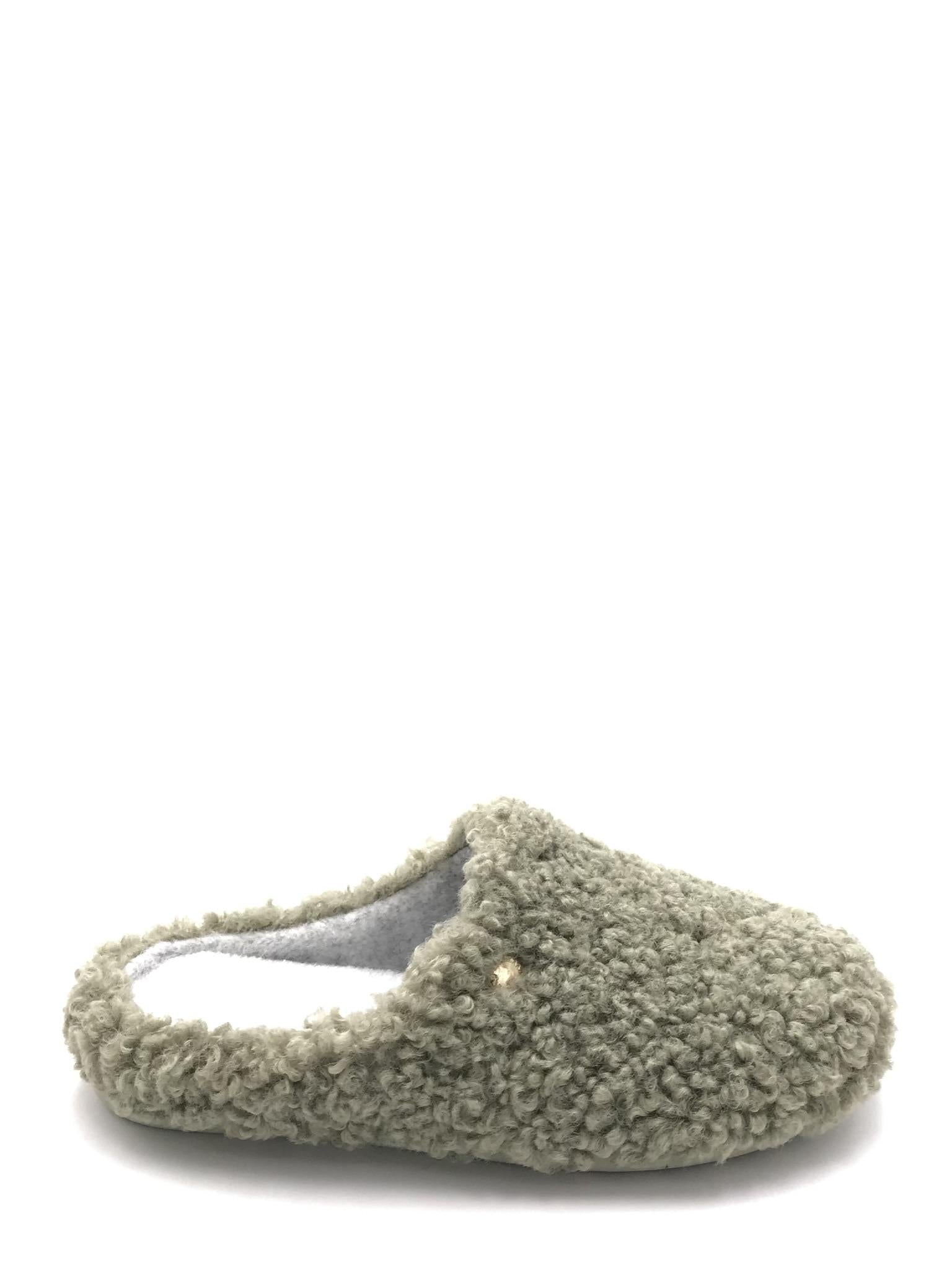 Ciabatta chiusa in panno effetto teddy color menta. Fodera interna in panno grigio a contrasto. Plantare morbido.