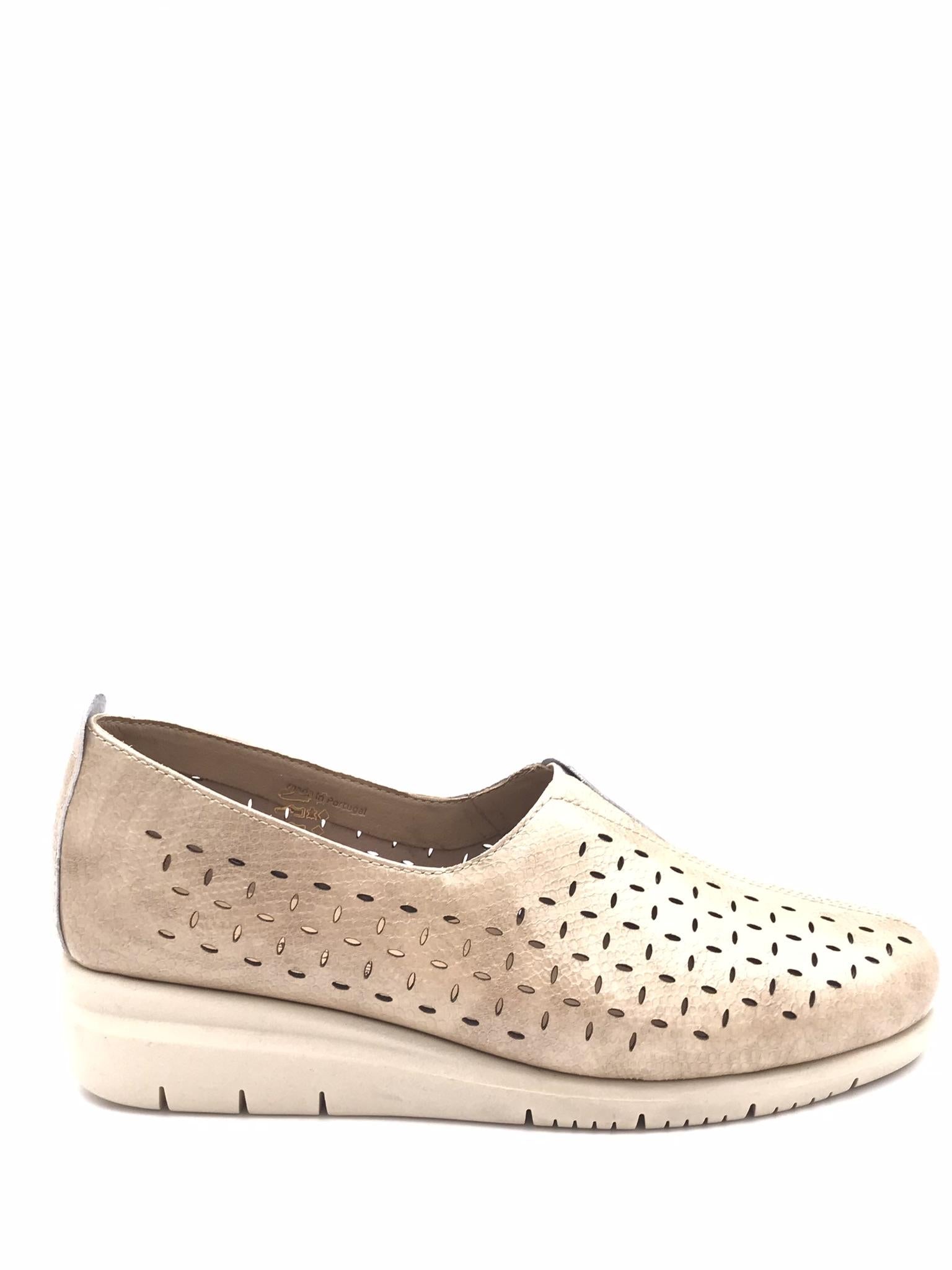 Scarpa comfort modello Rysa in naplak beige con stampa lucertolina. Tomaia forata. Elastico nel collo piede. Fodera interna in pelle. Plantare estraibile RE-SOFT (realizzato in doppio strato di schiuma di poliuretano, primo strato ammortizza il secondo memorizza) che recupera la forma originaria anche dopo molte ore di camminata.