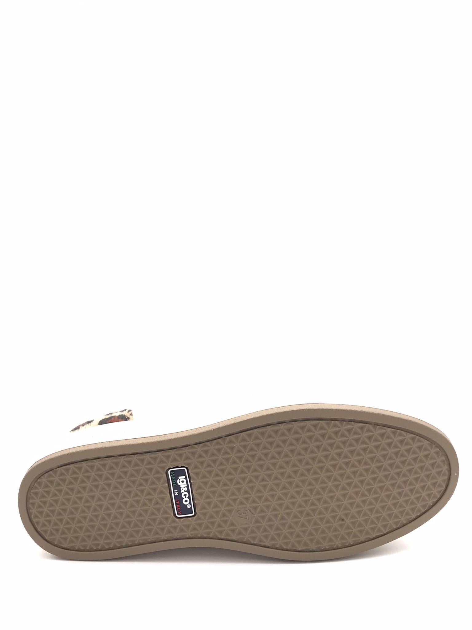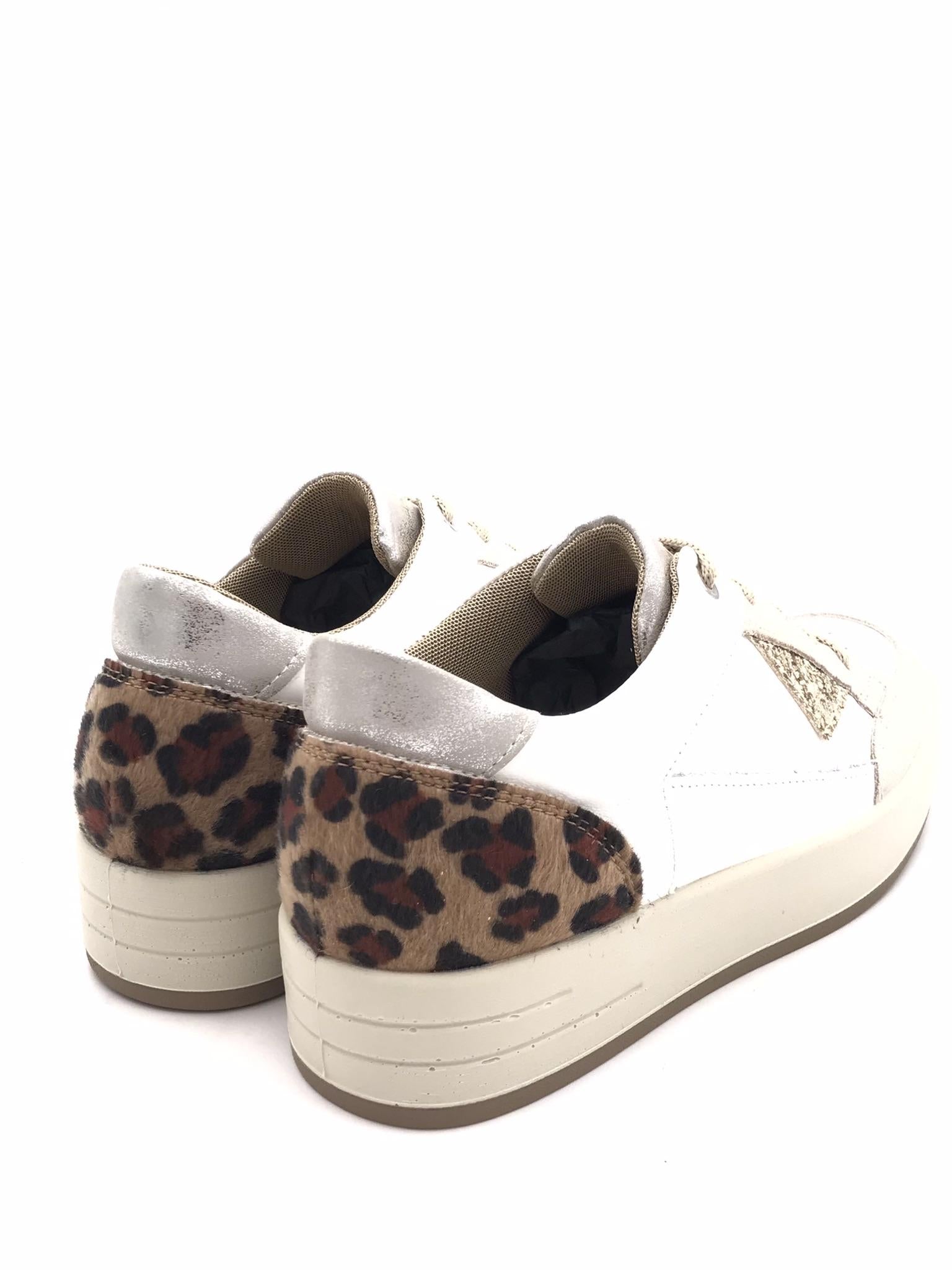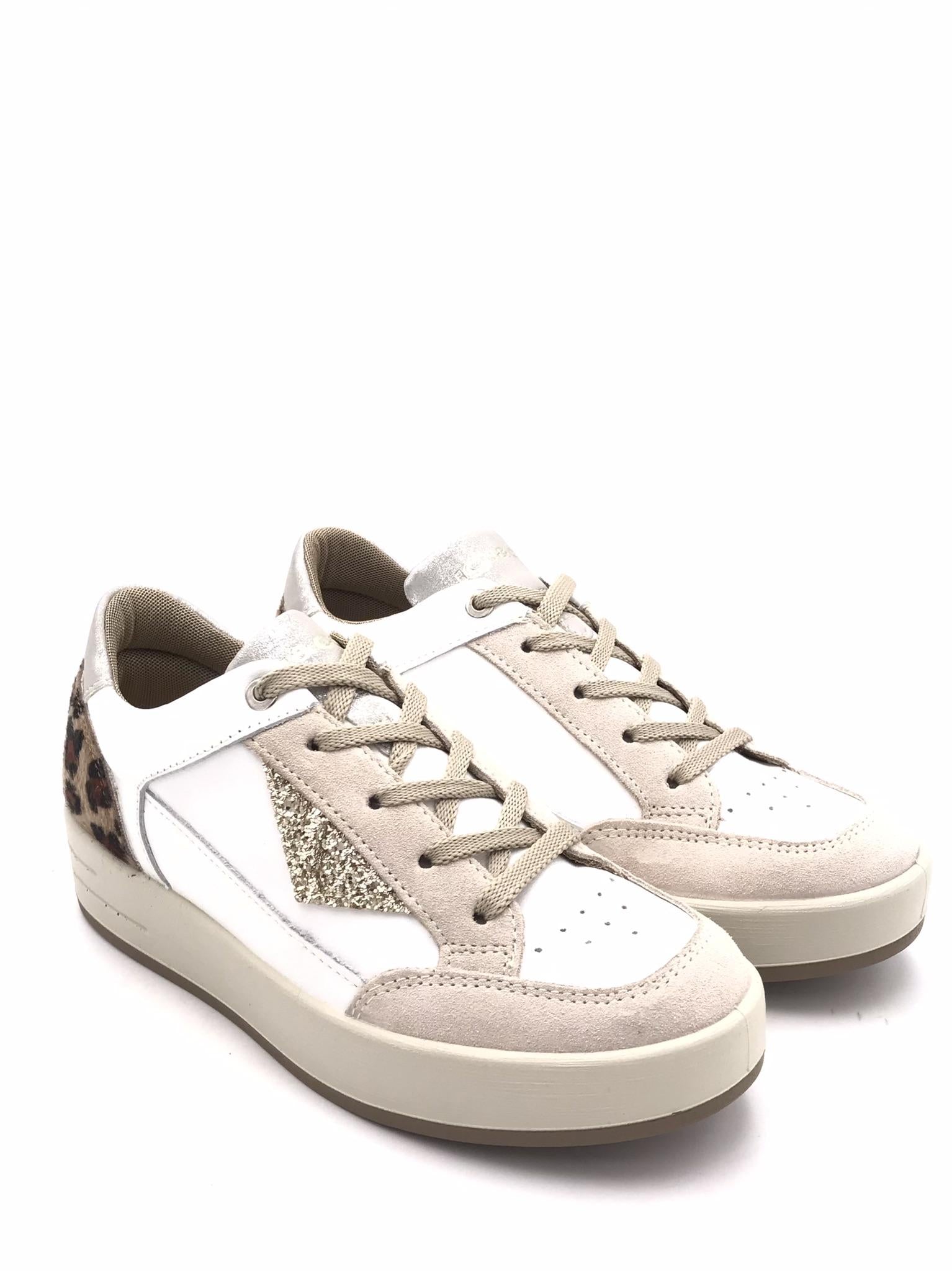 Sneakers modello Alina in pelle bianca e crosta beige. Dettagli in pelle laminata argento e glitter platino. Tallone in cavallino maculato. Laccio beige
