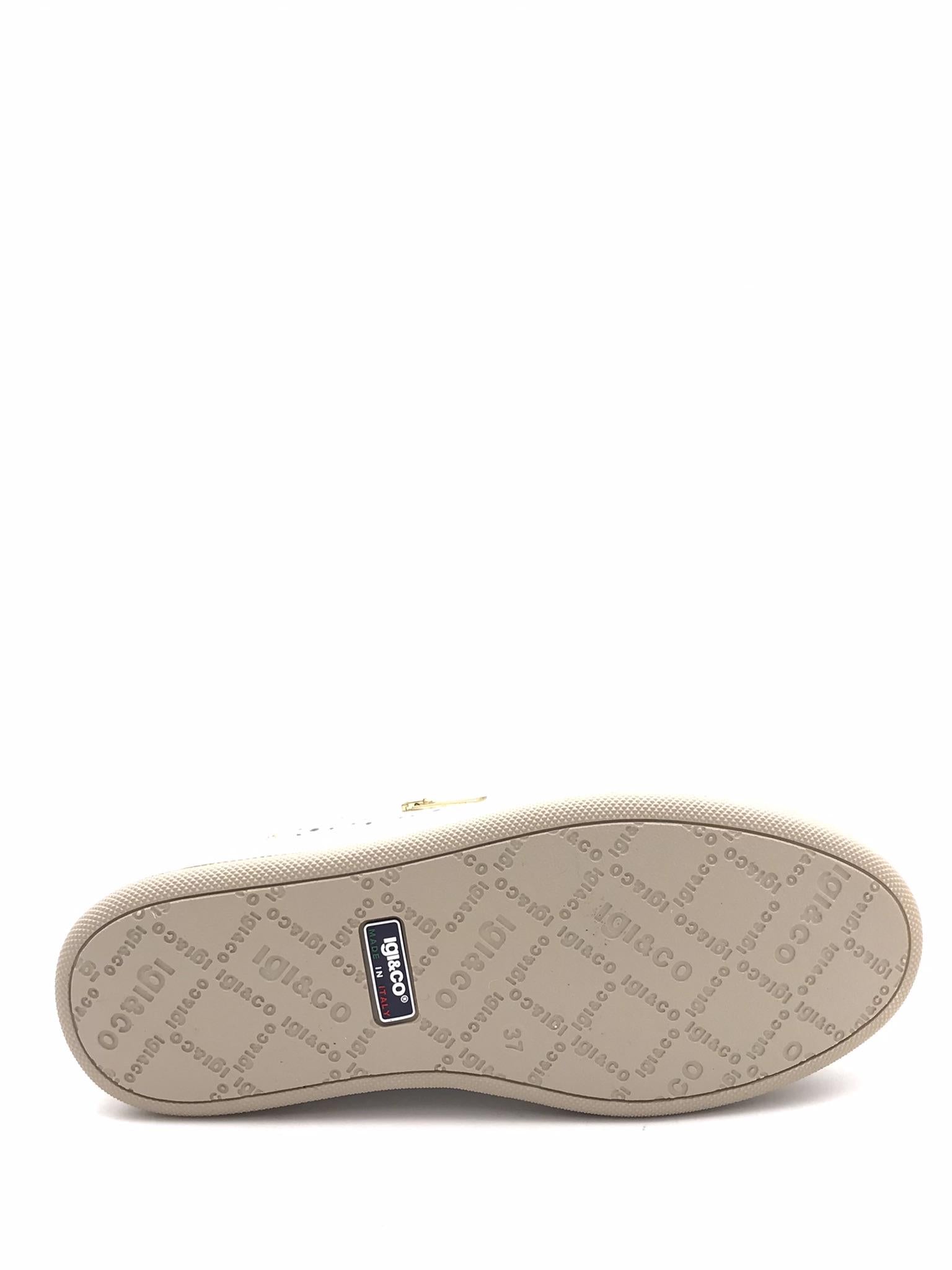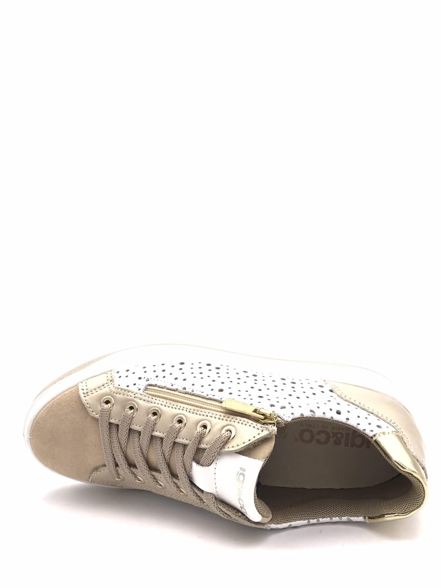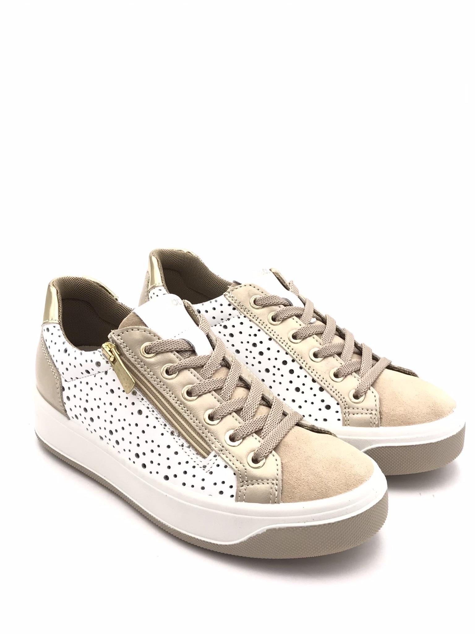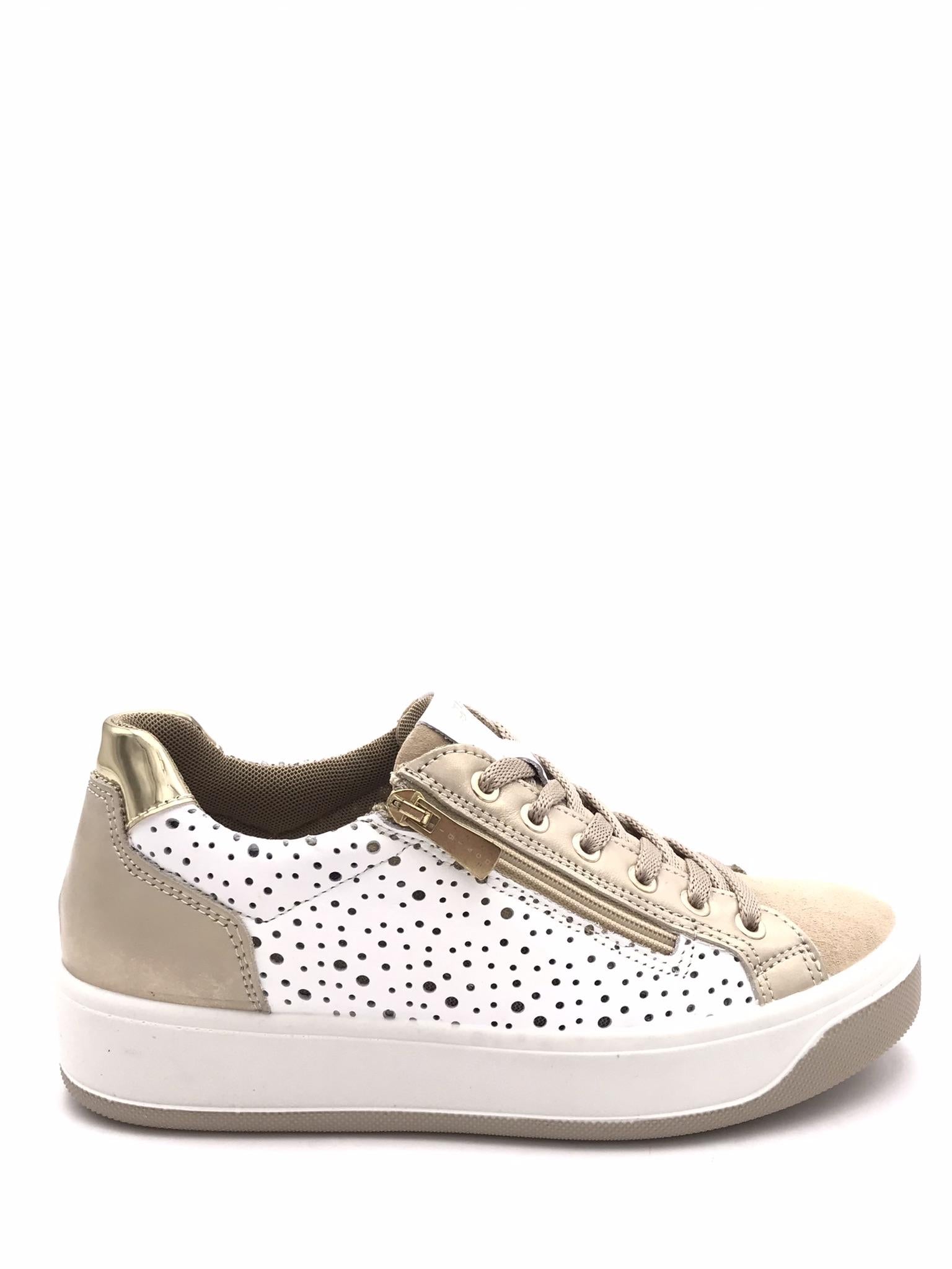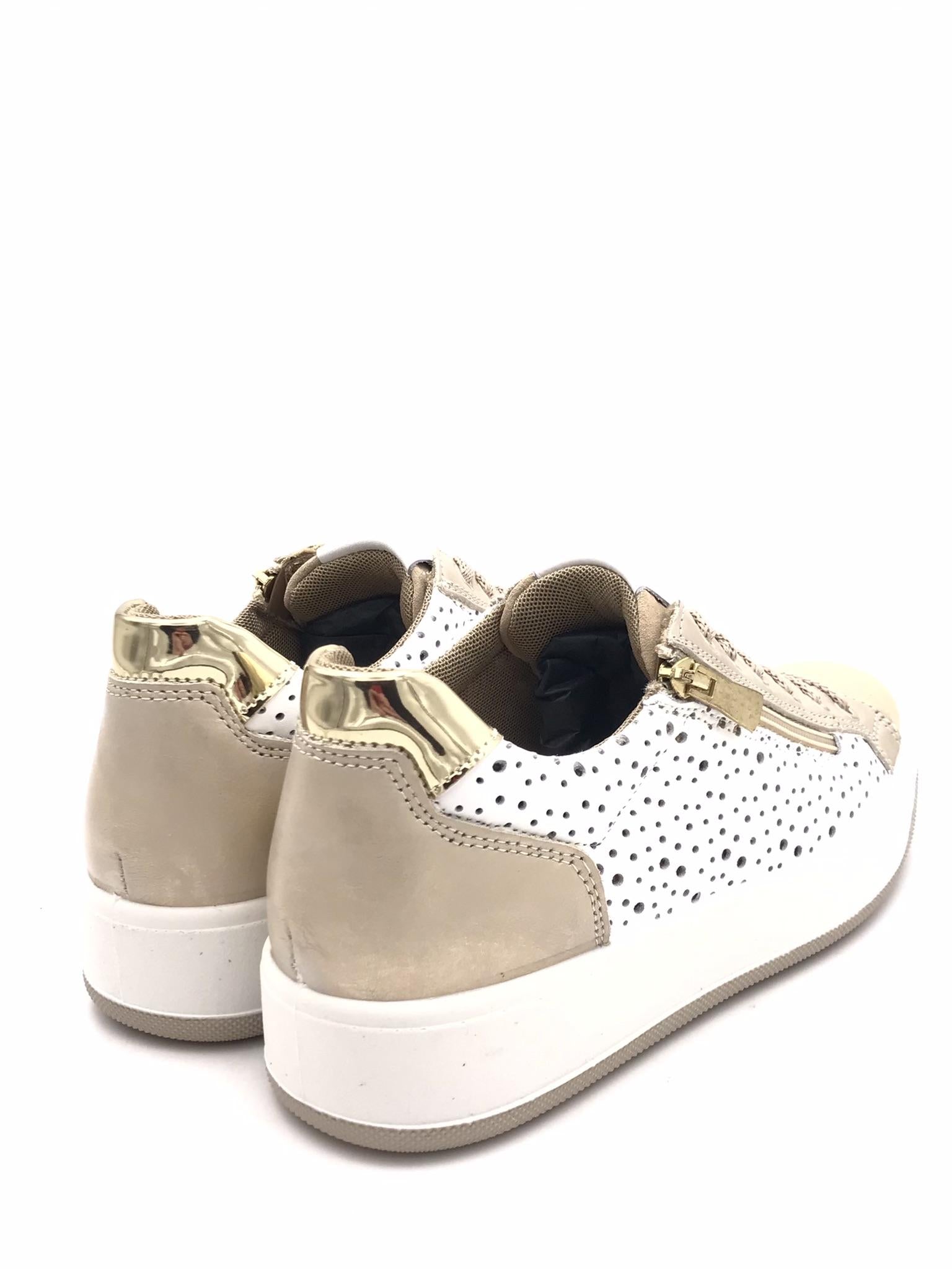 Sneakers modello Ava in pelle bianca e pelle laminata avorio. Tomaia traforata. Punta e linguetta in crosta beige. Talloncino in pelle laminata oro. Zip laterale di chiusura. Laccio beige. Fodera interna in pelle e tessuto. Plantare estraibile in pelle e lattice. Suola in gomma.
