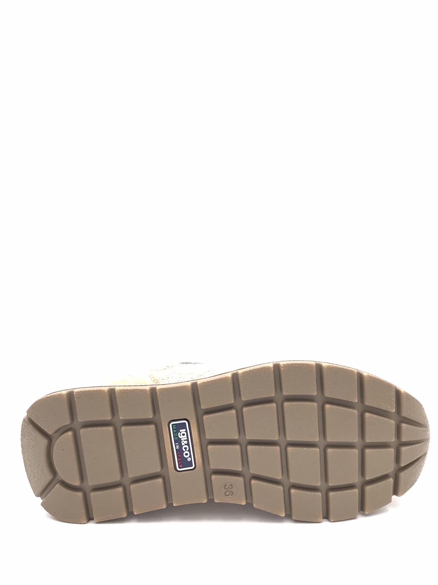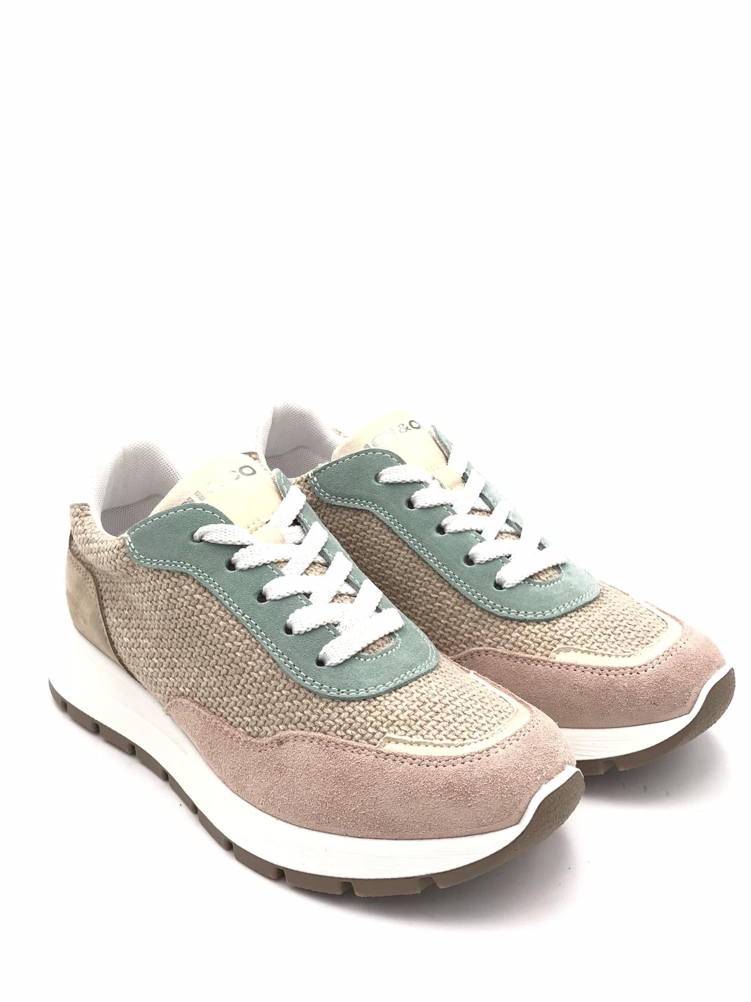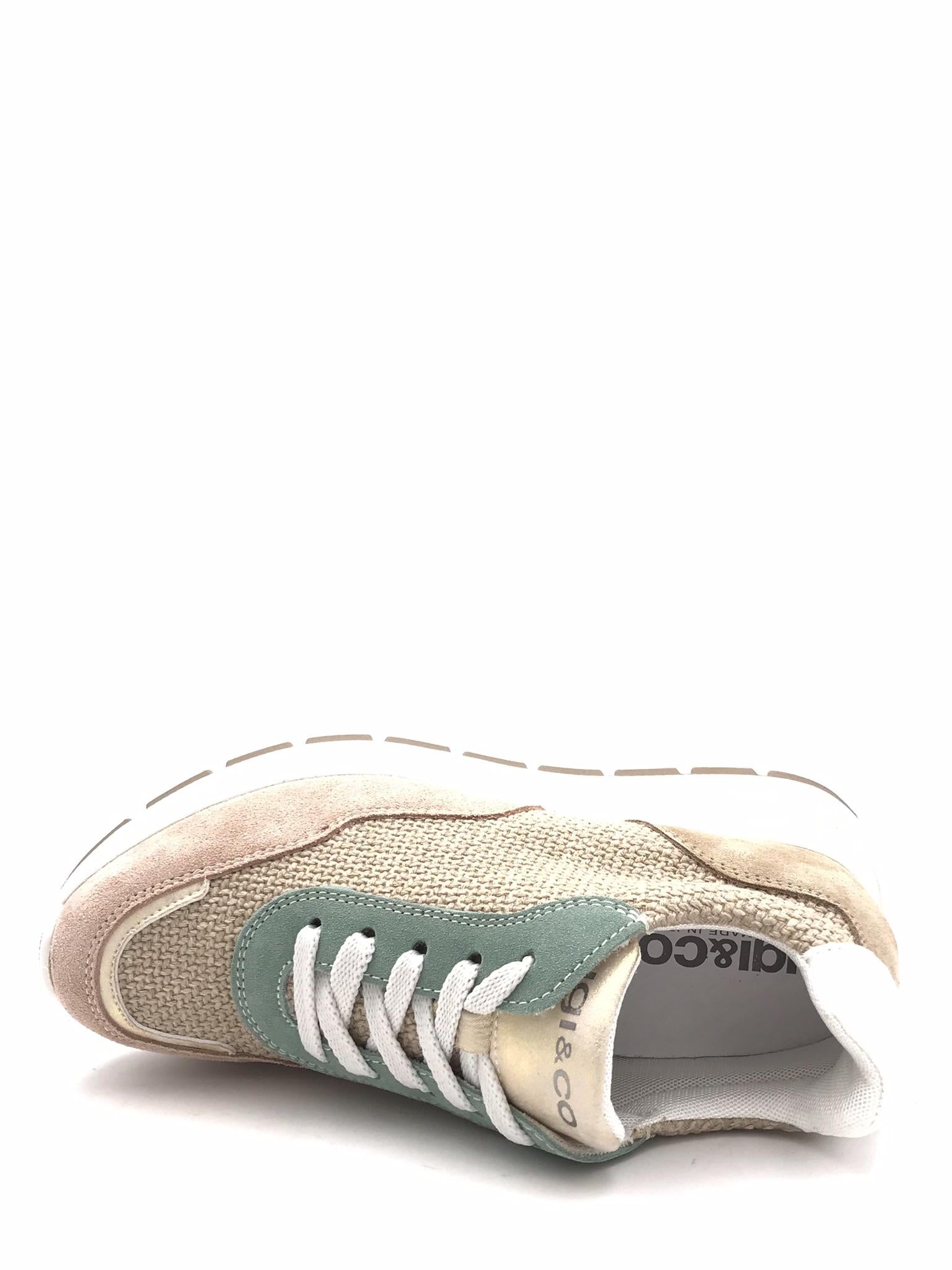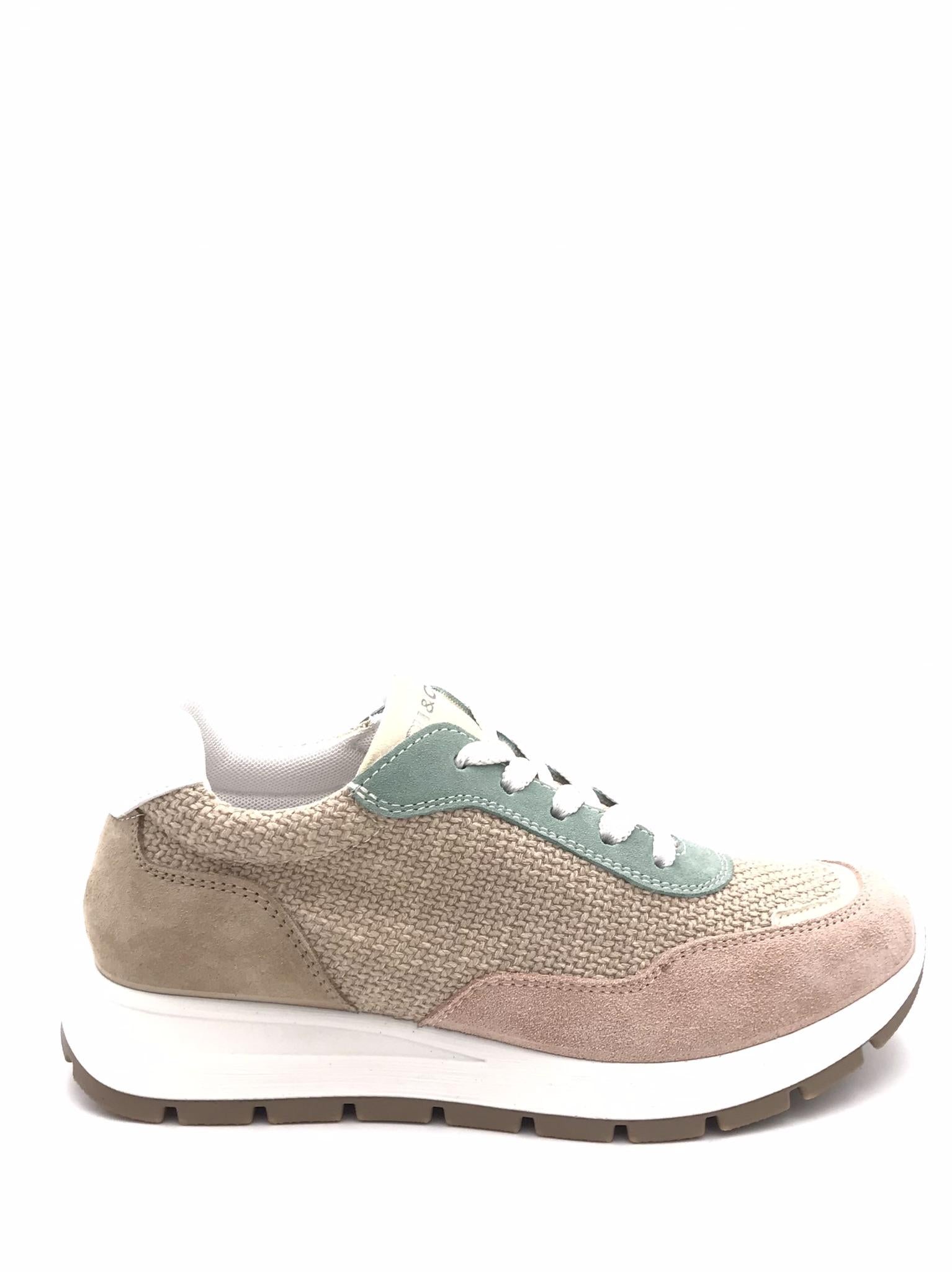 Sneakers modello Ermione in crosta color beige e rosa con bordo lacci in crosta salvia. Tomaia laterale in tessuto effetto lino color beige. Linguetta in pelle laminata platino. Talloncino in pelle bianca. Laccio bianco. Fodera interna in pelle e tessuto. Plantare estraibile in pelle e lattice. Suola running in gomma.