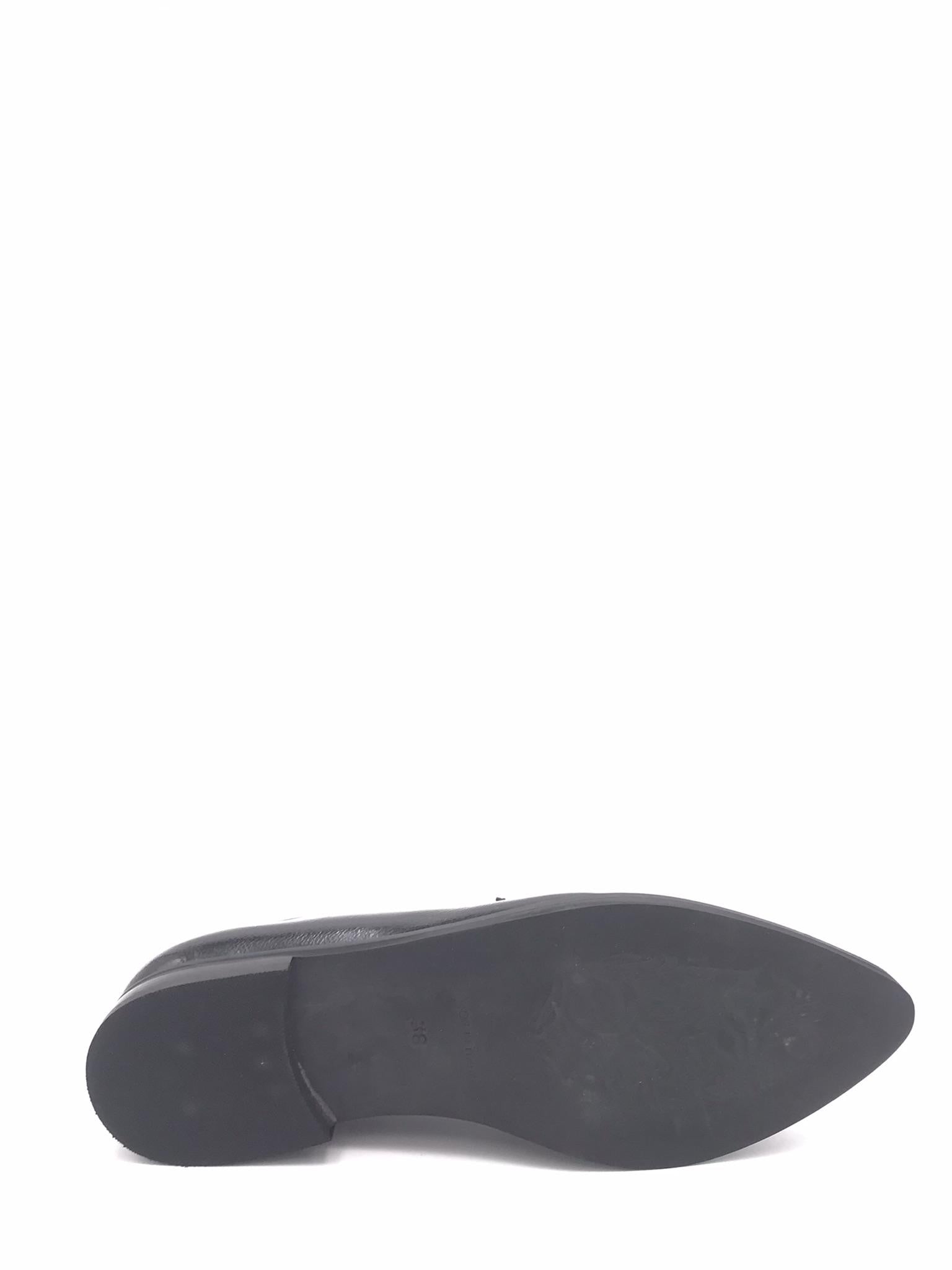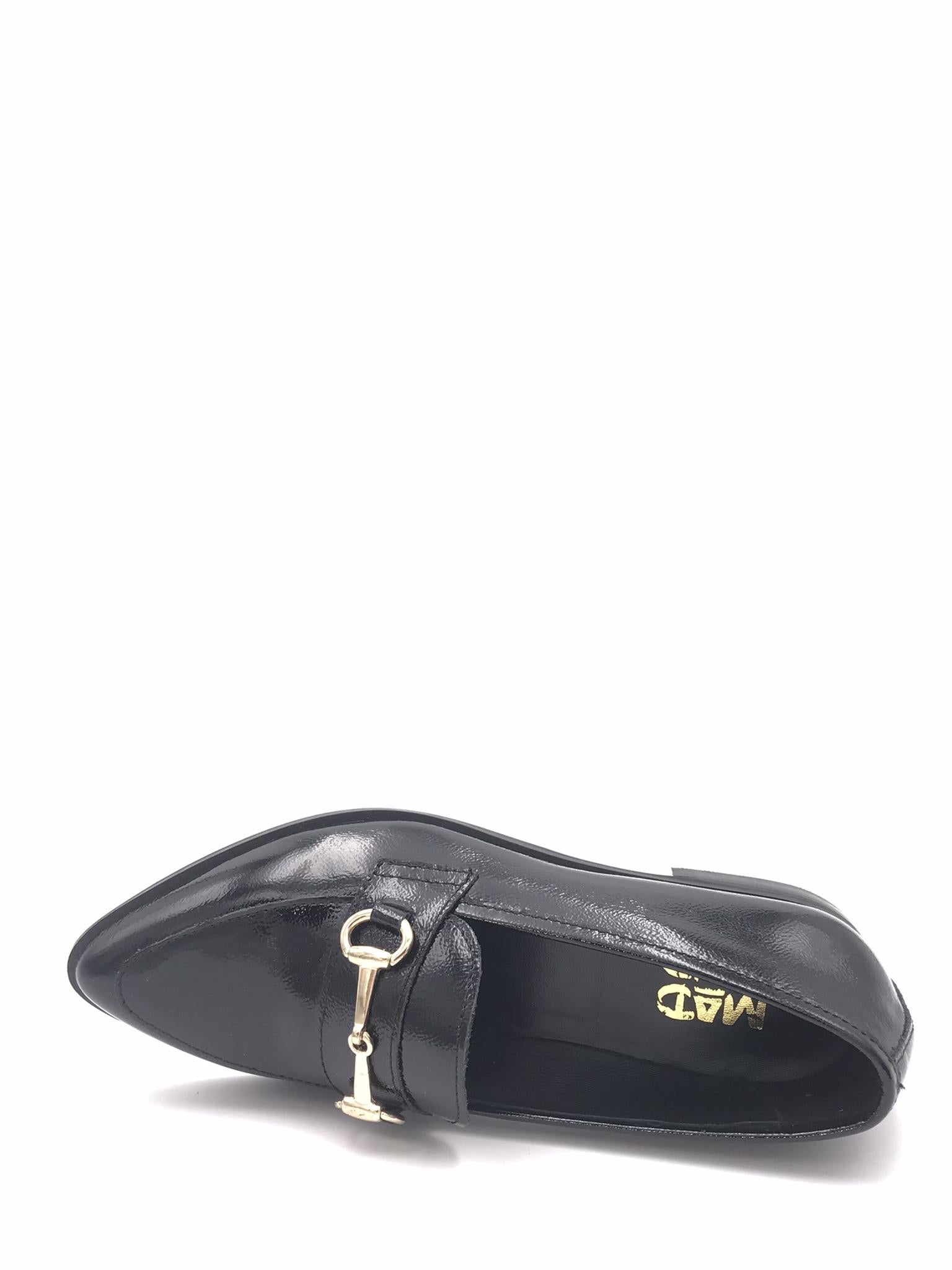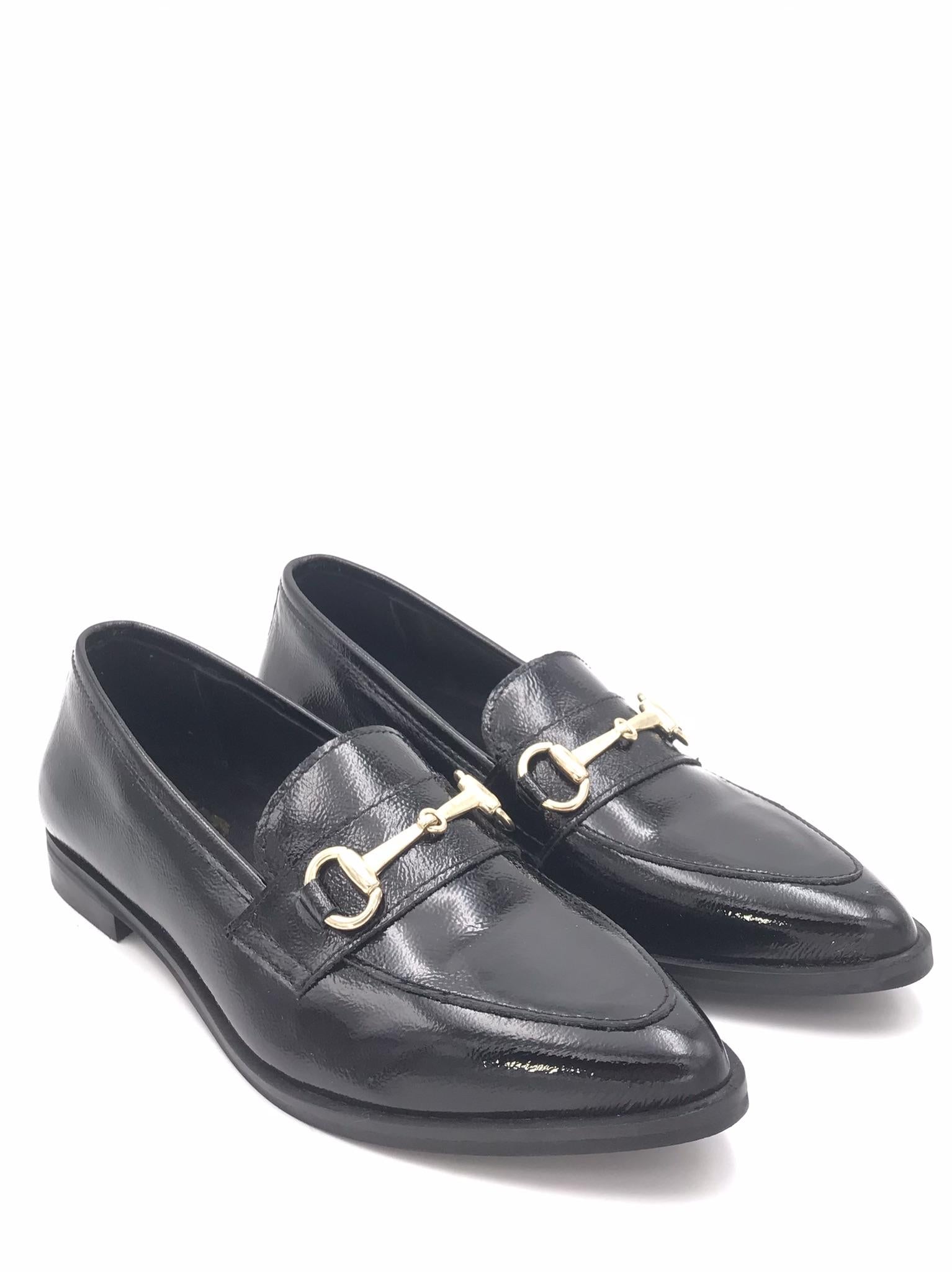 Mocassino realizzato in naplak nero. Forma affusolata. Morsetto in metallo oro applicato. Fodera interna in pelle. Suola in gomma. Tacco 2 cm