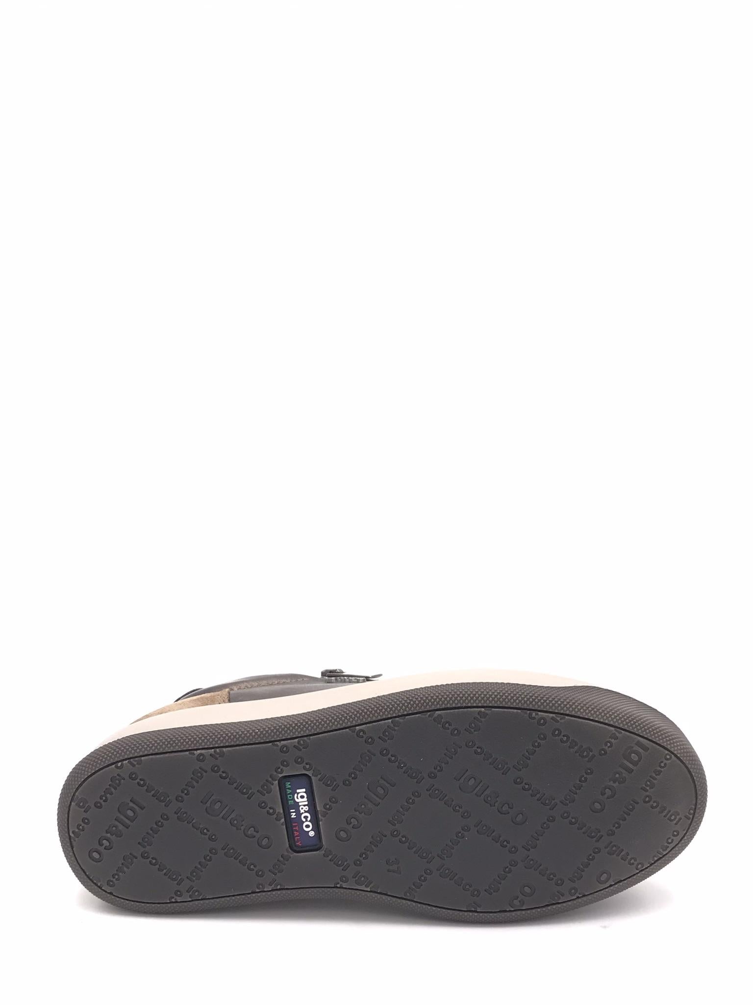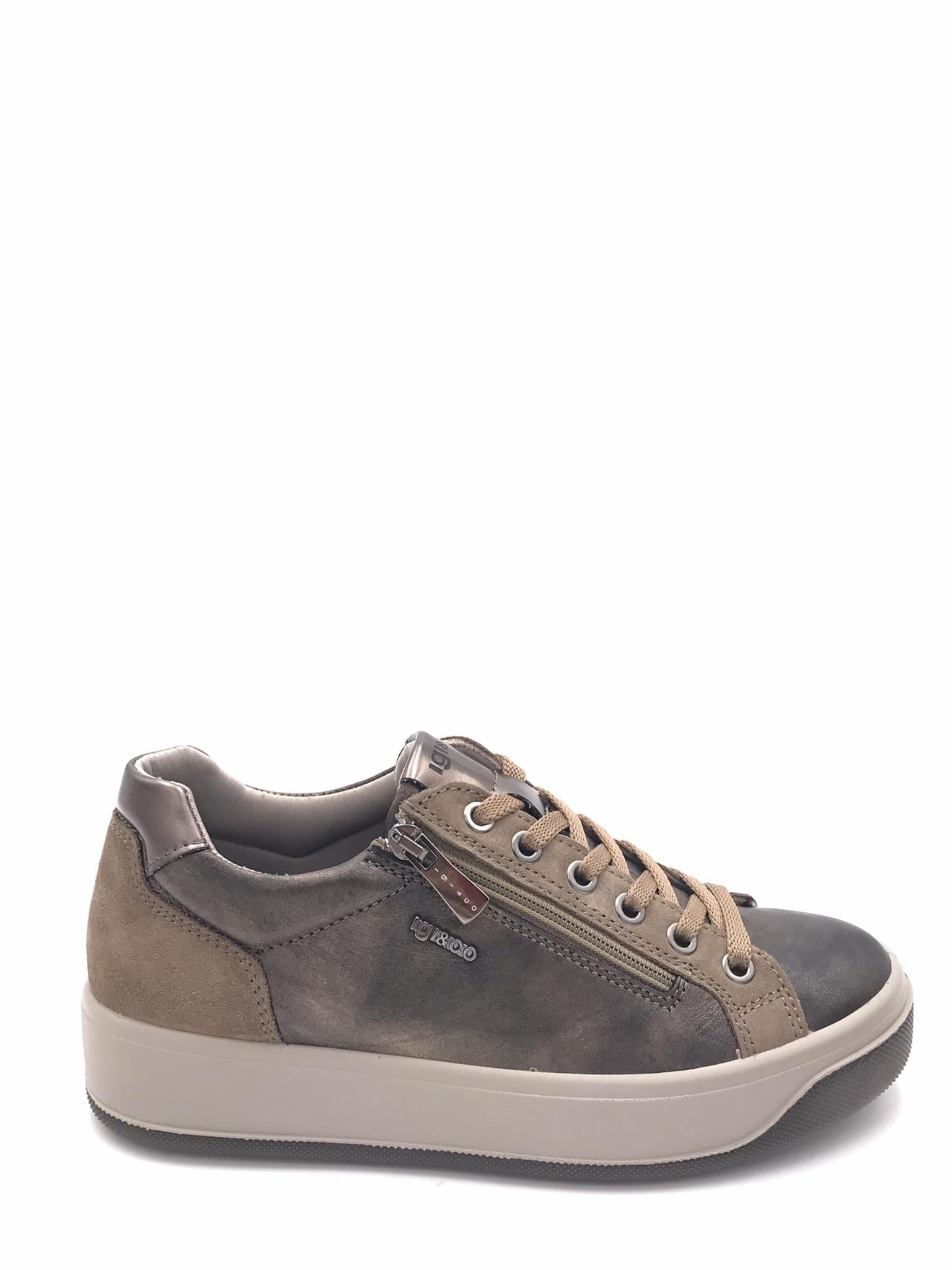 Sneakers modello Ava in pelle laminata bronzo e crosta fango.. Tallone in pelle laminata canna fucile. Laccio beige e zip laterale.