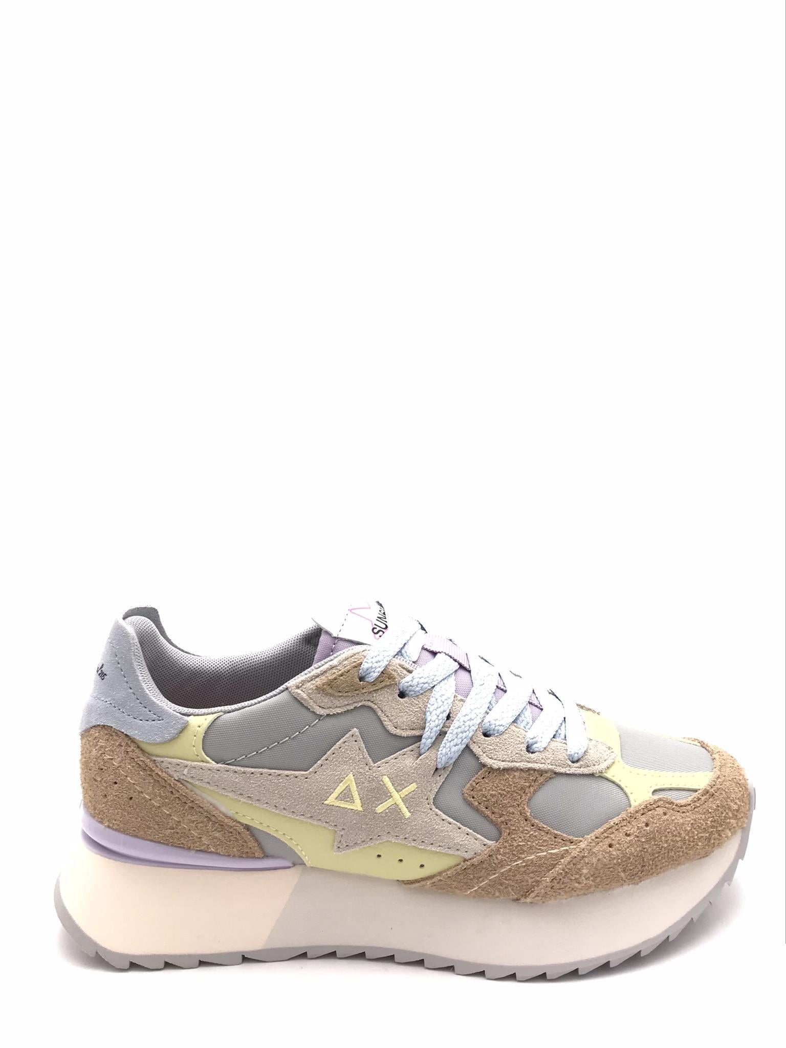 Sneakers running stargirl multicolor option in crosta grigio chiaro e beige, tessuto tecnico grigio chiaro e dettagli giallo pastello. Inserti nel tallone in crosta azzurra. Linguetta in nylon lilla. Maxi logo laterale. Laccio azzurro. Fodera interna in tessuto. Plantare estraibile morbido in tessuto e lattice. Suola running leggera in eva bi colore.