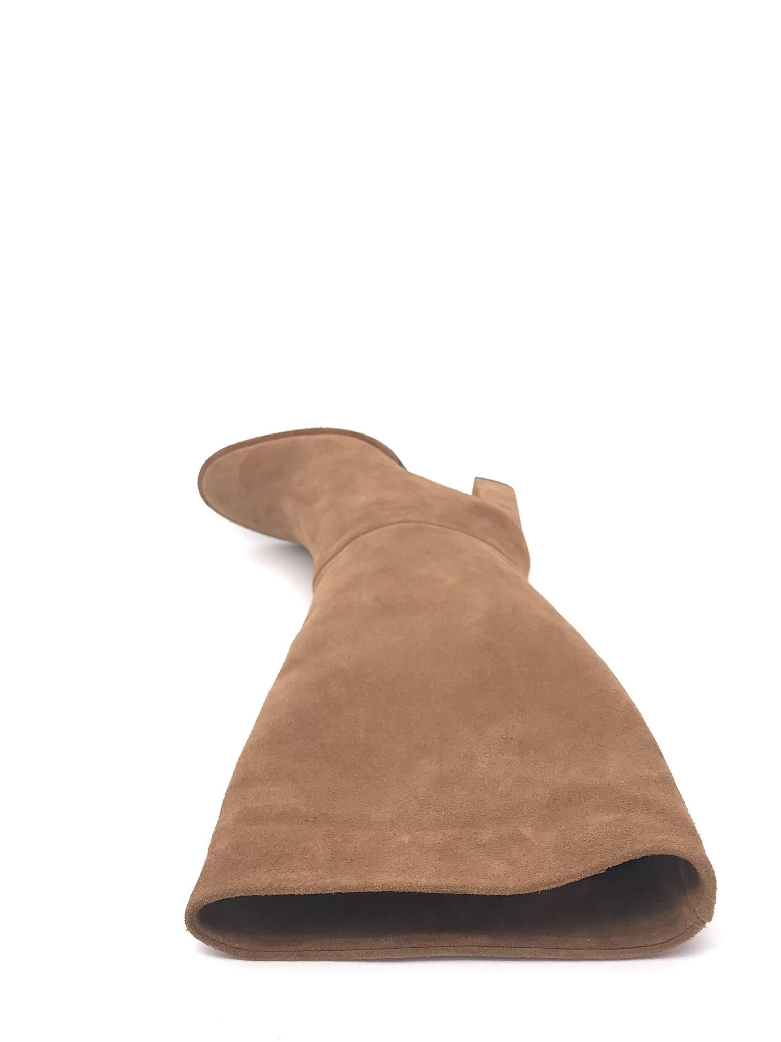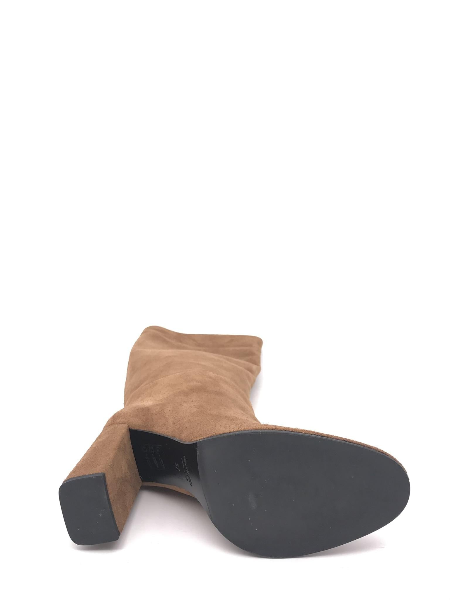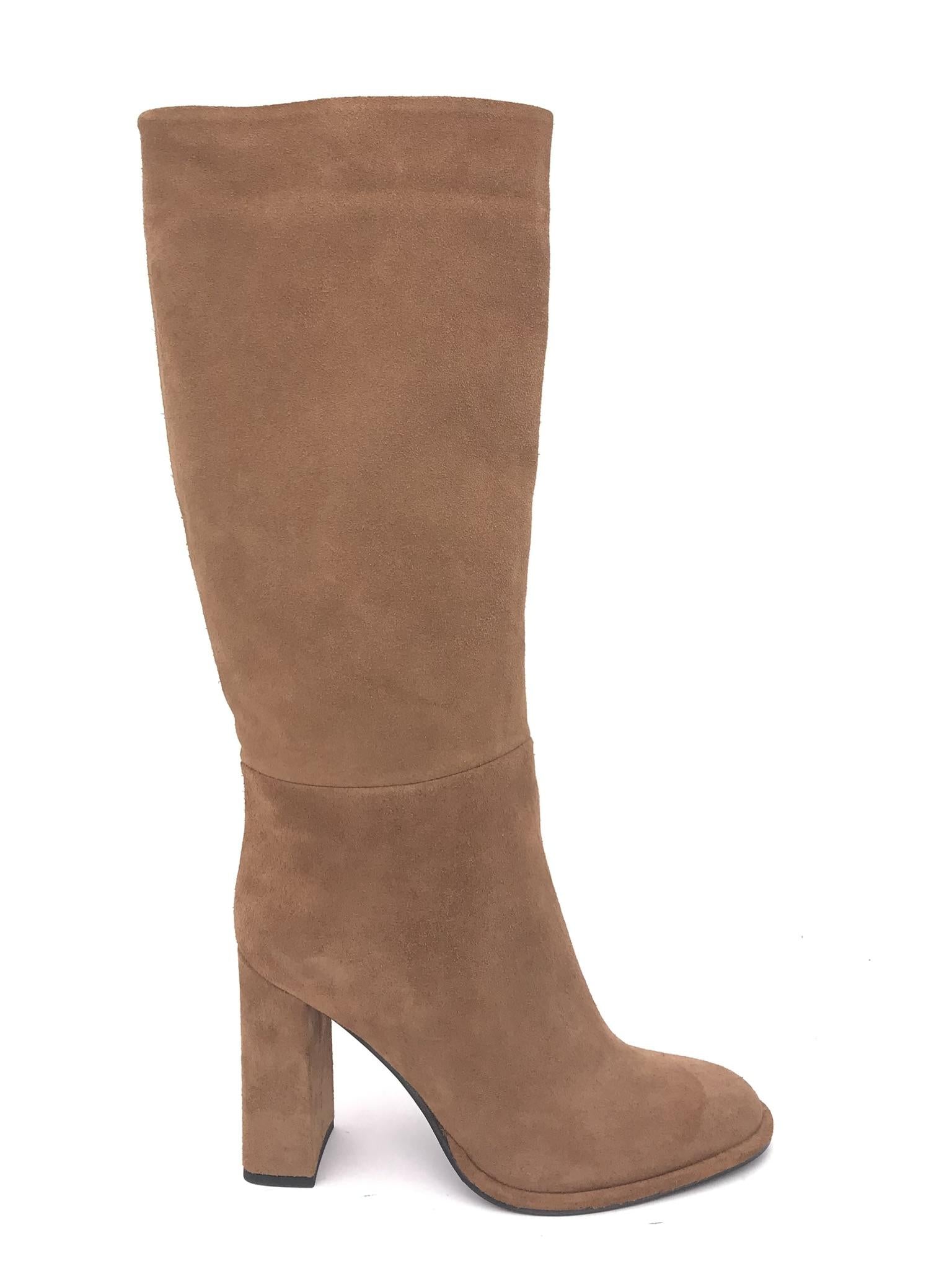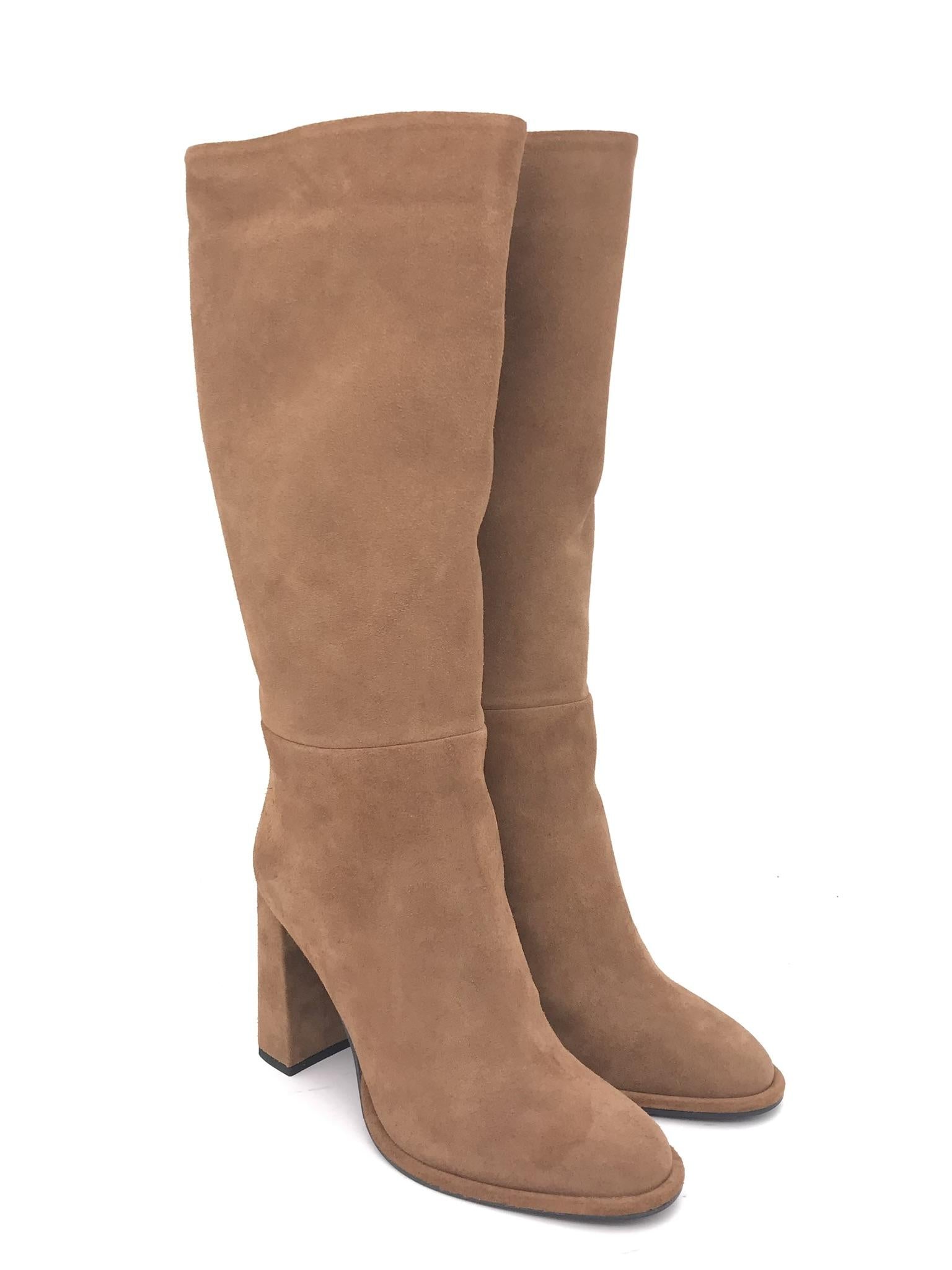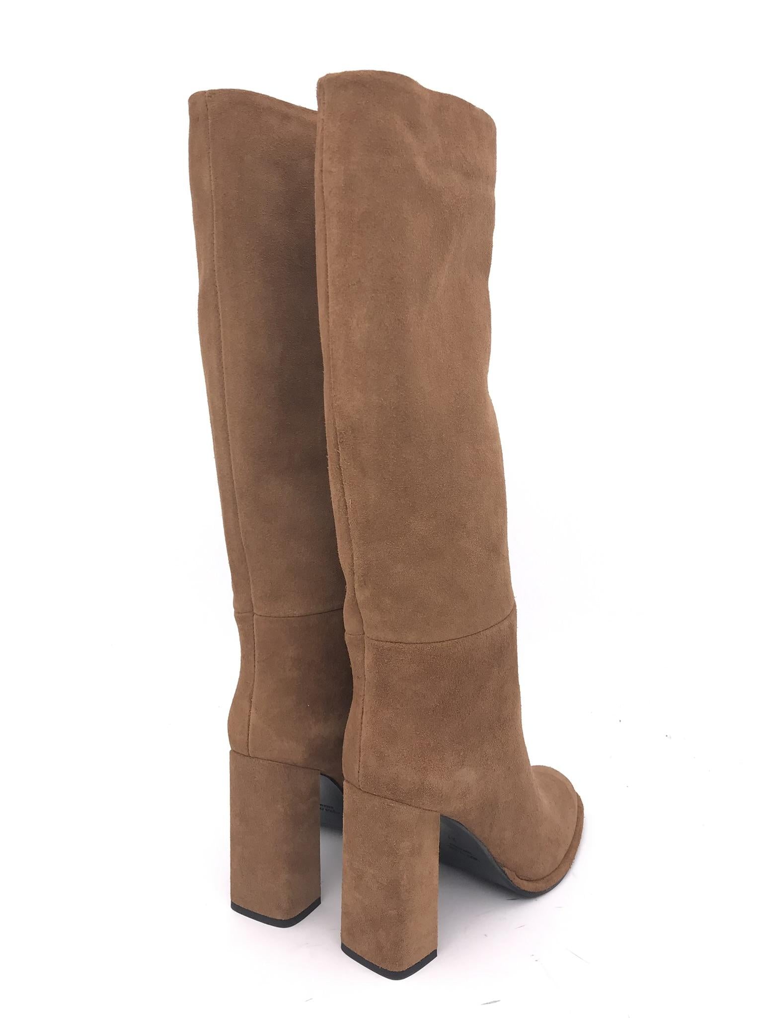 Stivale a tubo realizzato in camoscio cuoio. Forma arrotondata. Fodera interna in pelle. Suola in gomma e tacco 10 foderato in camoscio in tinta. Lavorazione artigianale