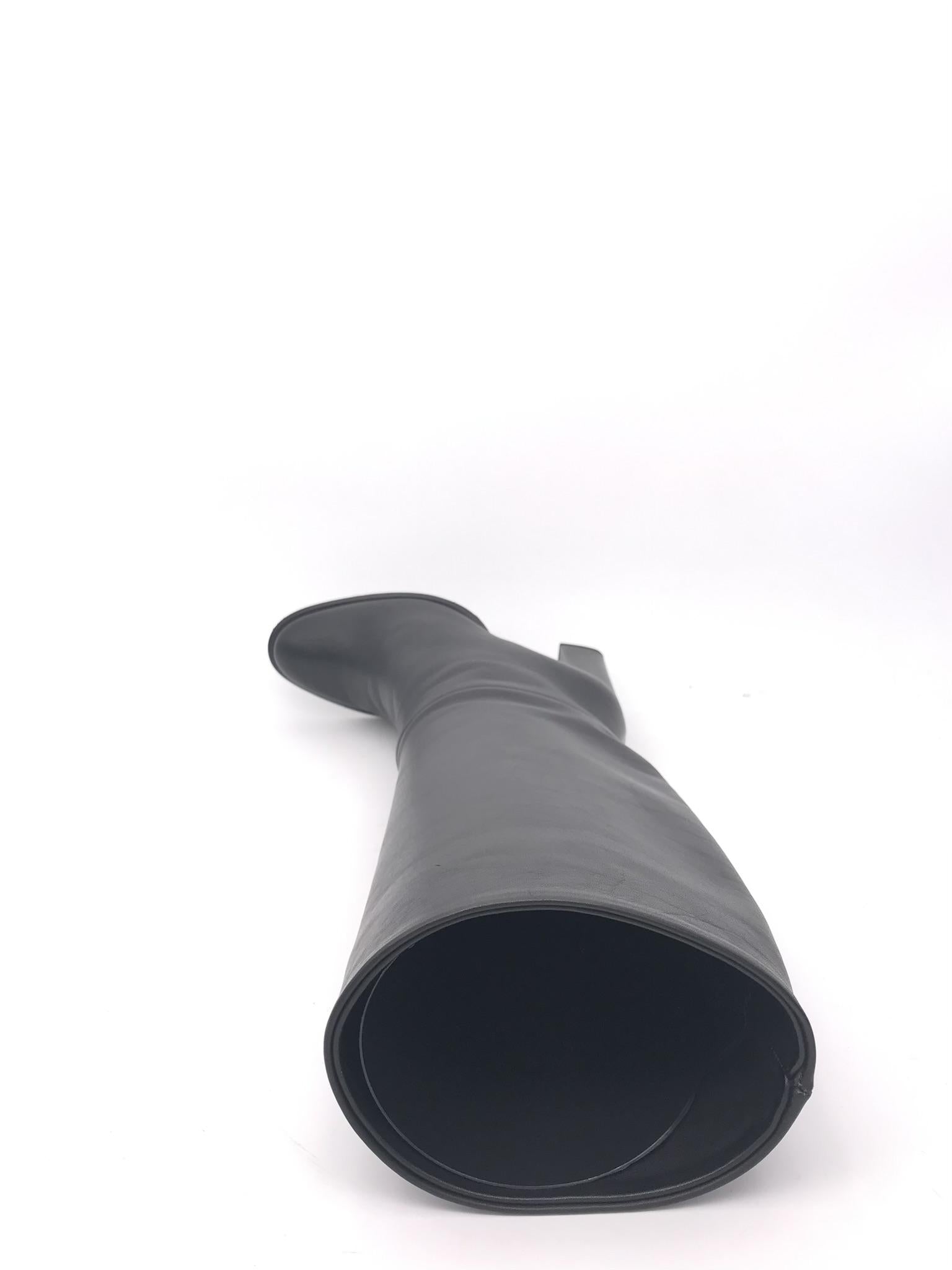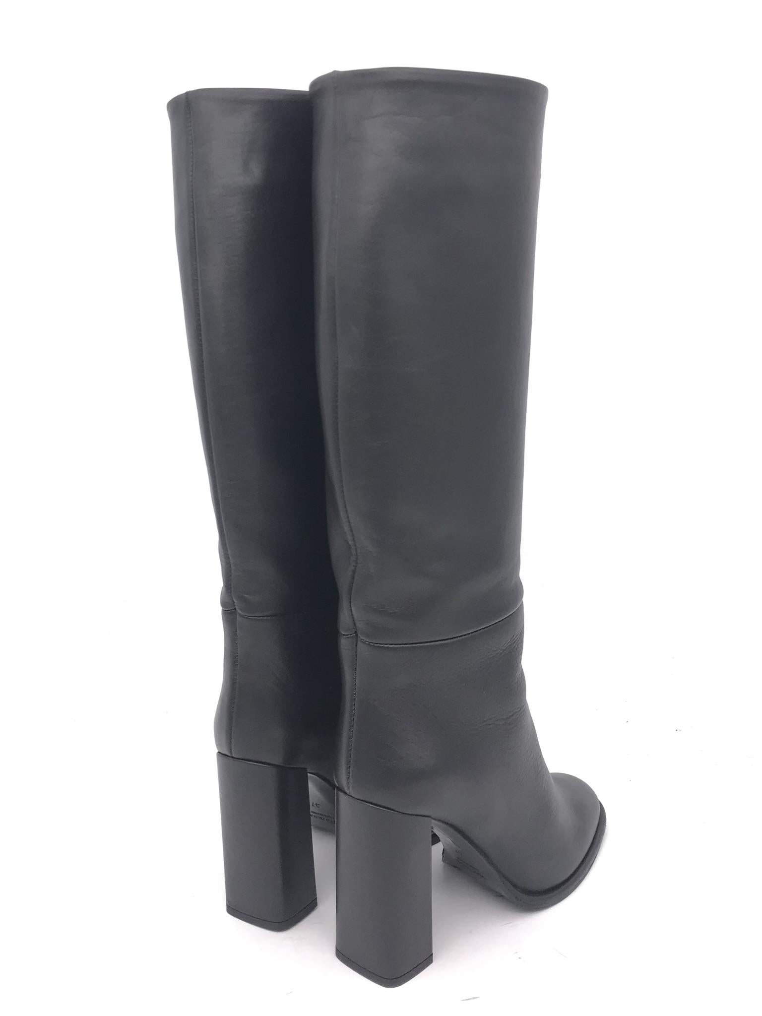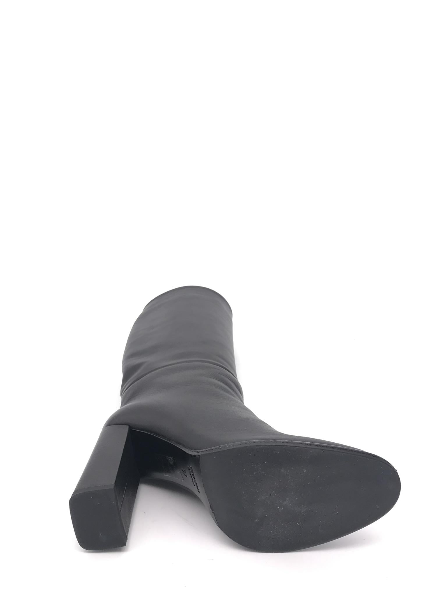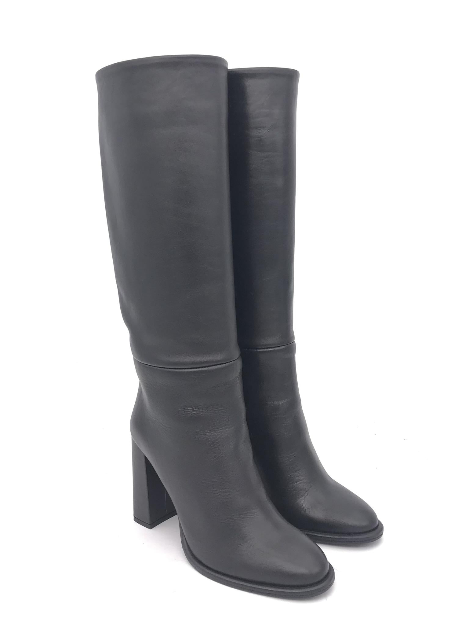 Stivale a tubo realizzato in pelle nera. Forma arrotondata. Fodera interna in pelle. Suola in gomma e tacco 10 foderato in pelle nera. Lavorazione artigianale