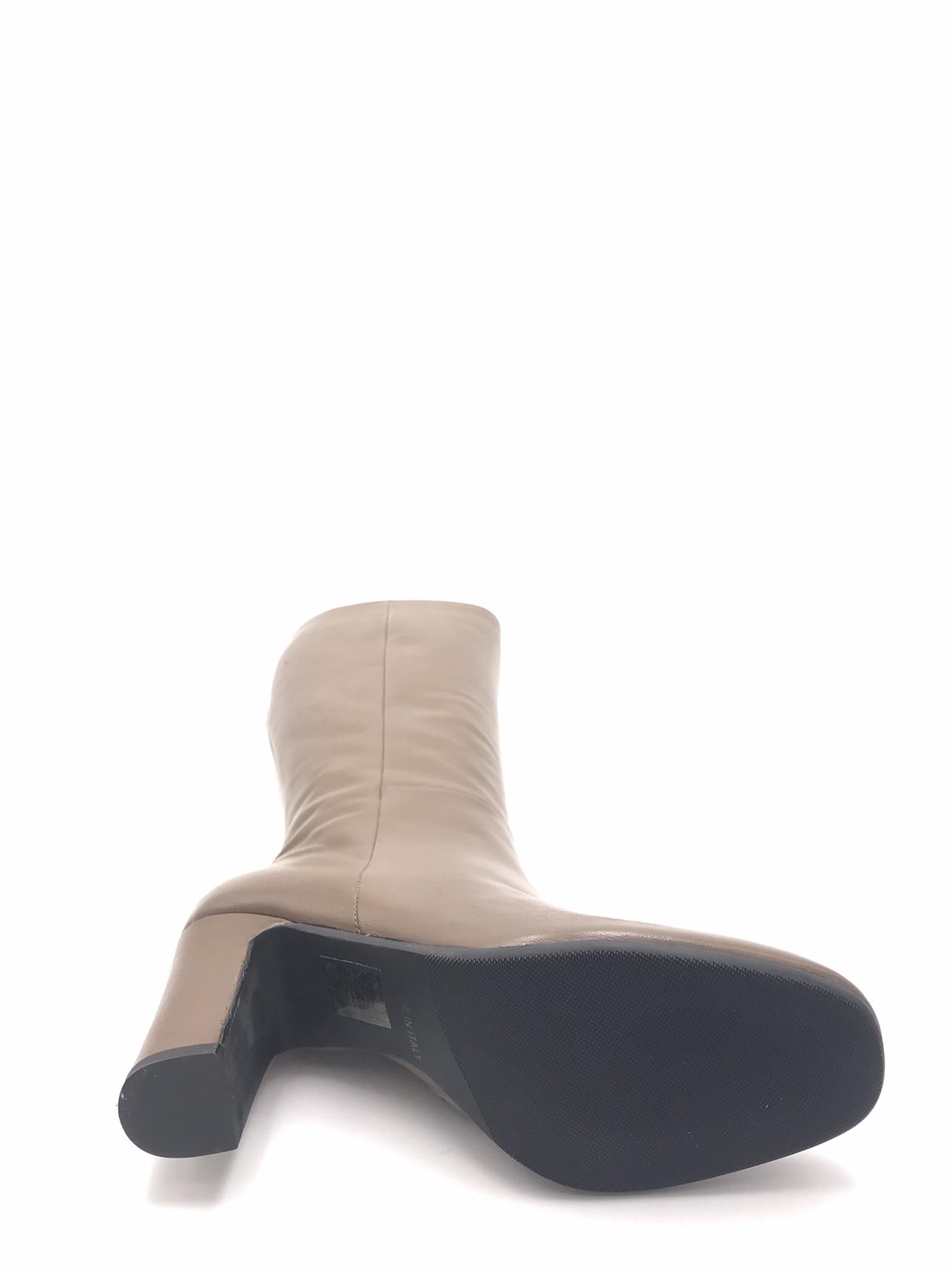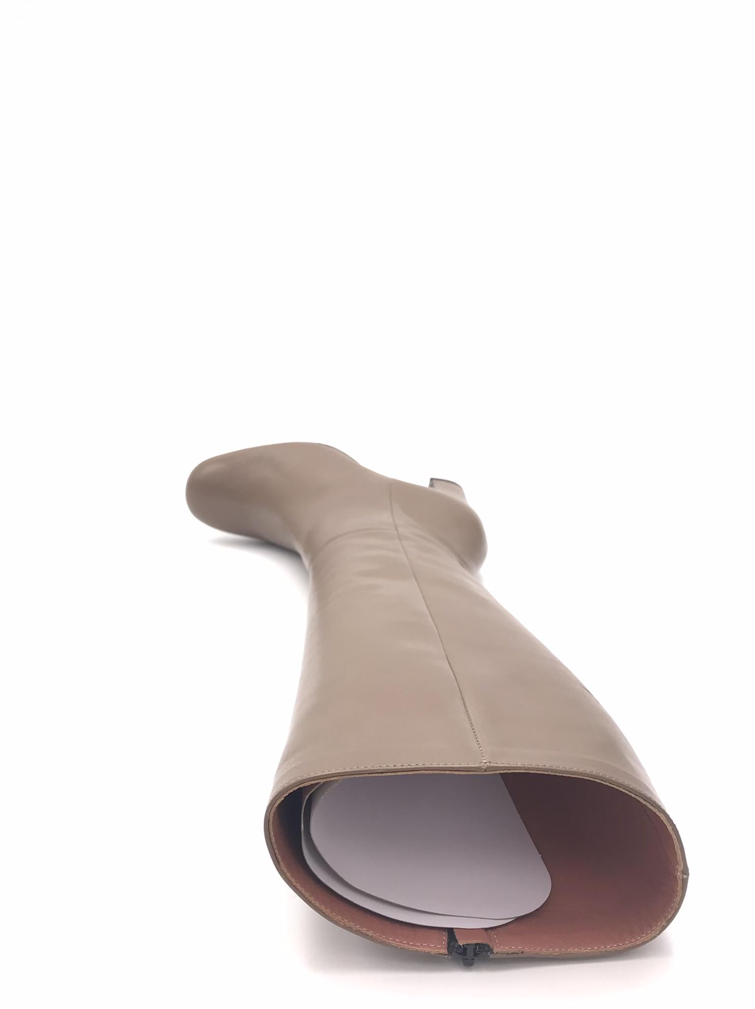 Stivale in pelle color fango. Forma arrotondata. Zip di chiusura. Fodera interna in pelle. Tacco in tinta altezza 7 cm. Fondo in cuoio con inserto in gomma antiscivolo. Lavorazione artigianale