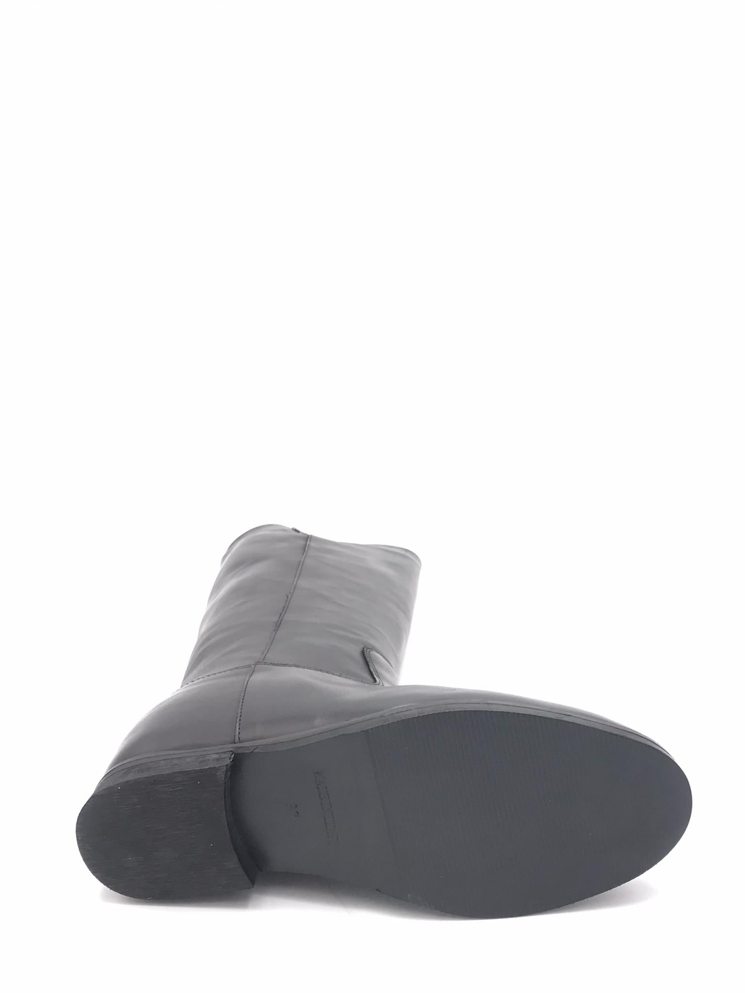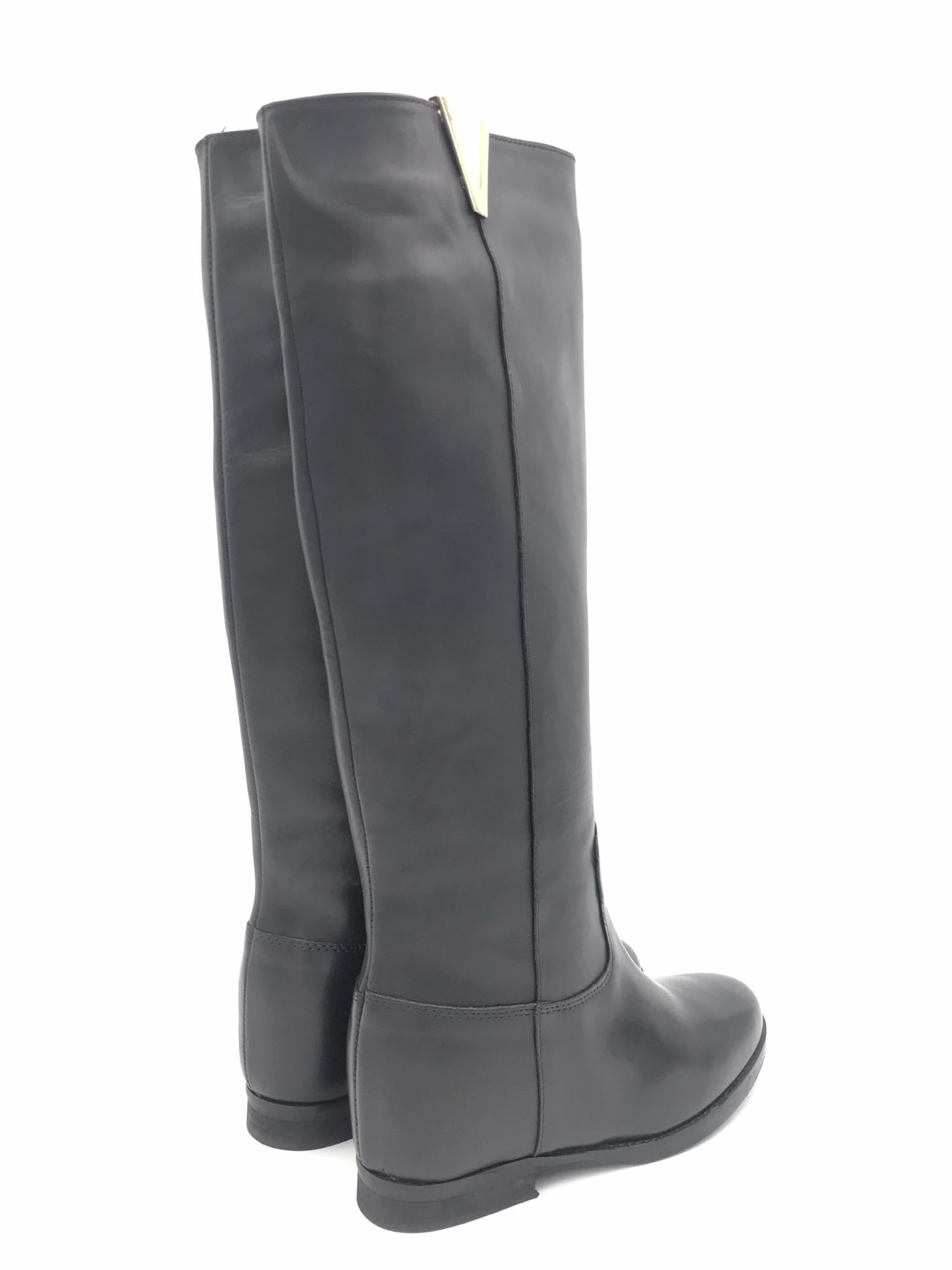Stivale realizzato in pelle nera. Gambale a tubo. Forma arrotondata. Accessorio oro applicato. Zeppa interna altezza 6 cm. Fodera interna in pelle. Suola in gomma. Lavorazione artigianale