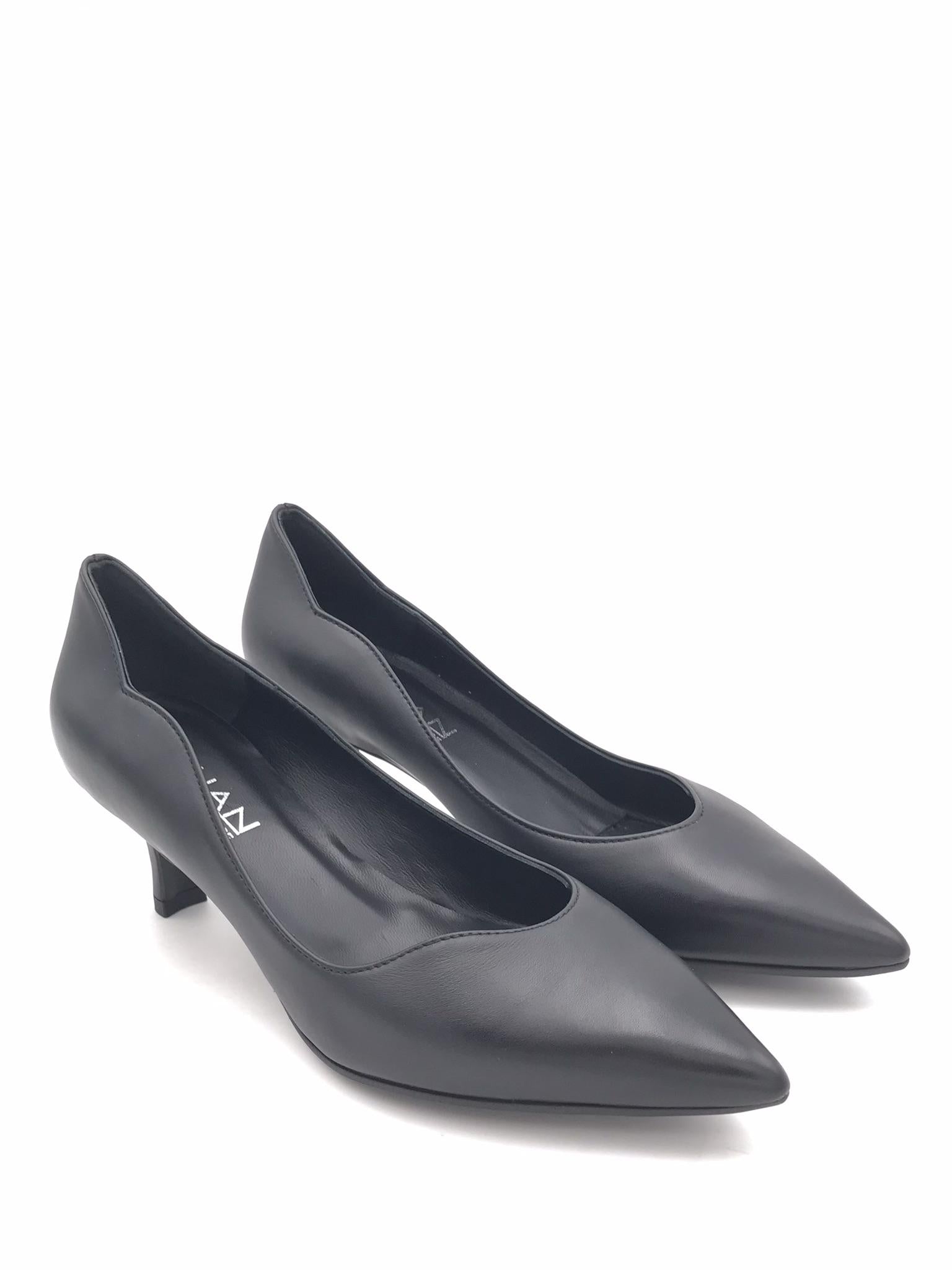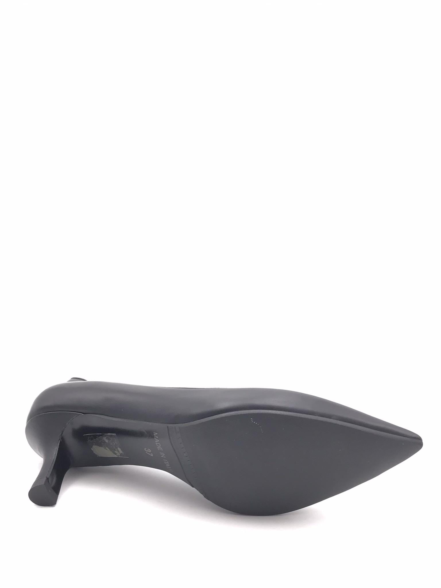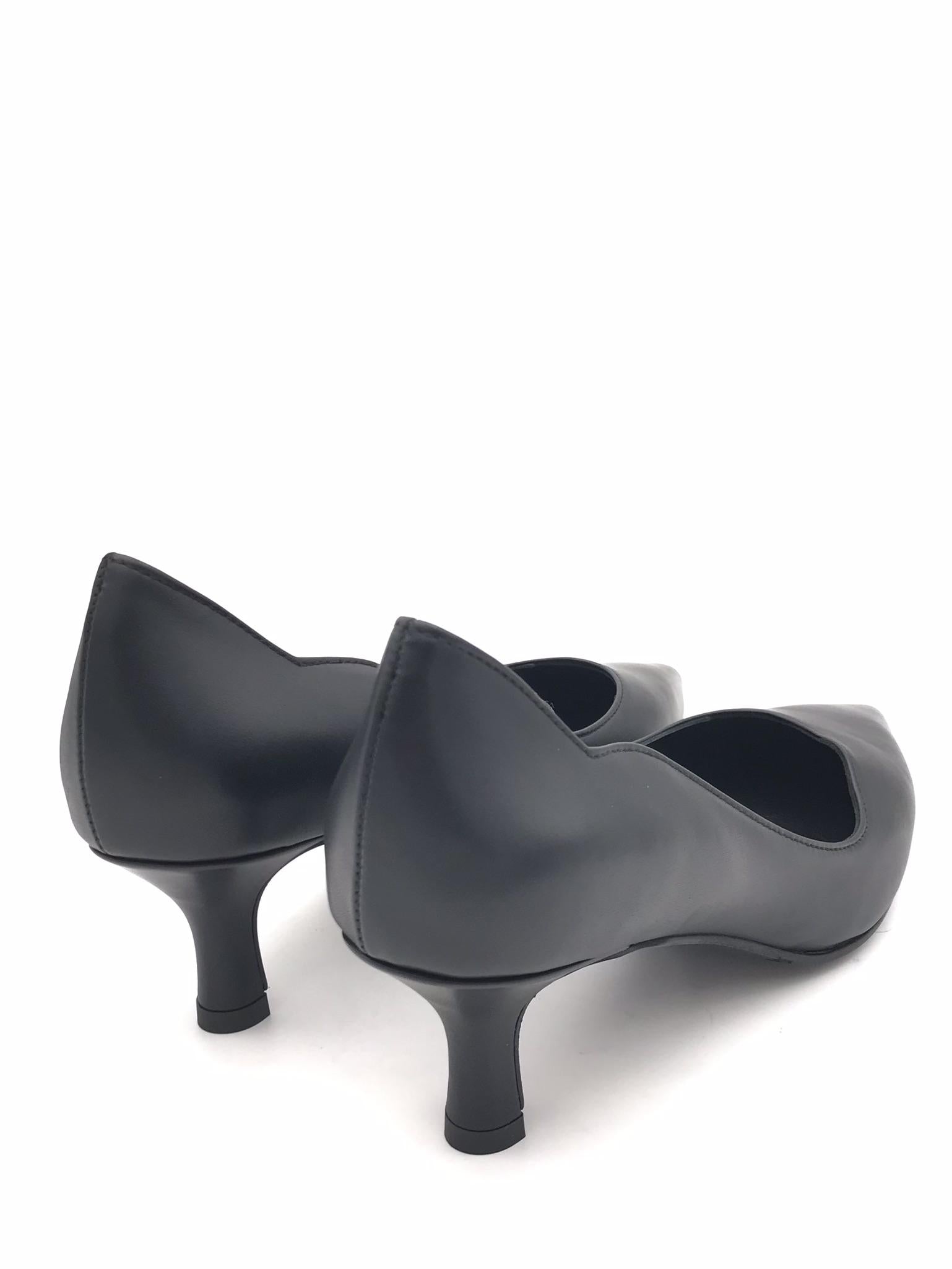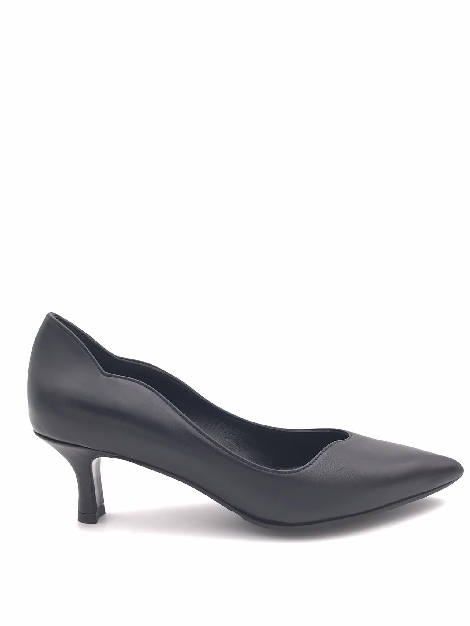 Decolletè in nappa morbida nera. Scollo asimmetrico. Forma sfilata. Fodera interna in pelle. Sottopiede morbido con lavorazione sacchetto. Tacco foderato in tono colore altezza 5 cm. Suola in gomma flessibile.