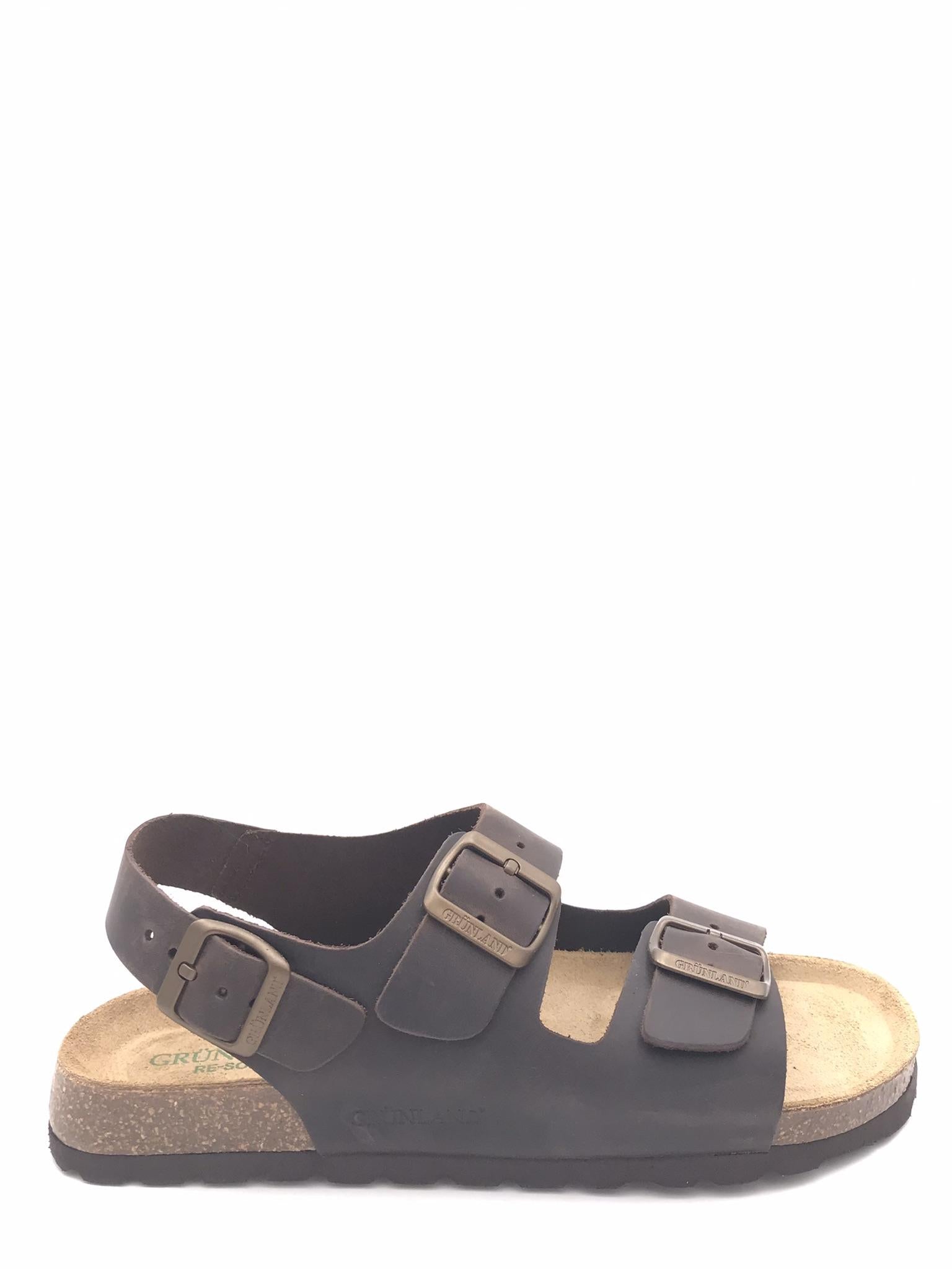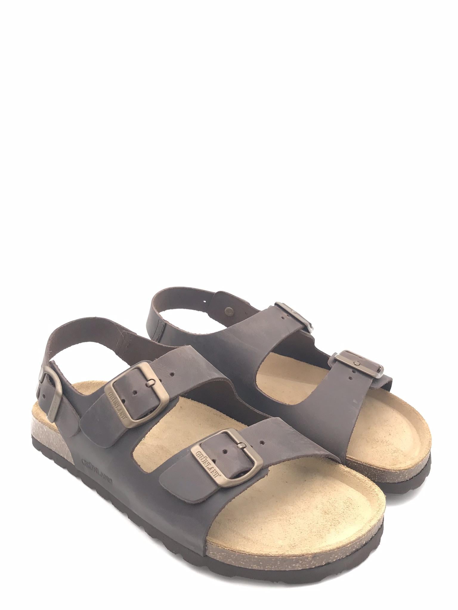 Sandalo aperta in nabuk oliato color marrone scuro. Doppia fascia con fibbia regolabile nel collo piede e fascia regolabile nel tallone. Fodera interna in pelle. Plantare anatomico in pelle e sughero con sottopiede RE-SOFT (realizzato in doppio strato di schiuma di poliuretano, primo strato ammortizza il secondo memorizza) che recupera la forma originaria anche dopo molte ore di camminata.
