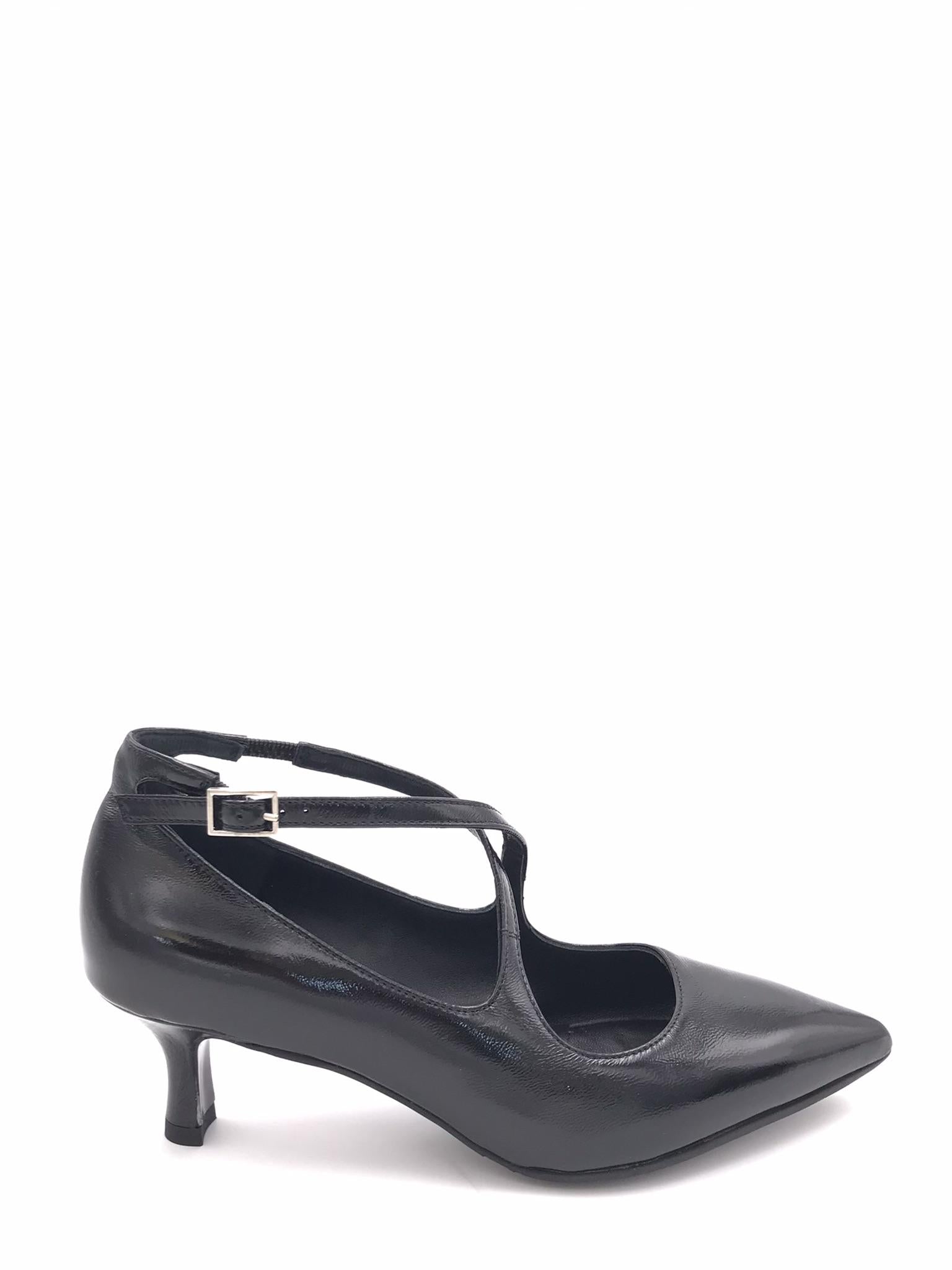 Decolletè in nappa morbida nappa verniciata nera. Cinturin i incrociati nel collo del piede regolabili con fibbia. Forma sfilata. Fodera interna in pelle. Sottopiede morbido con lavorazione sacchetto. Tacco foderato in tono colore altezza 5 cm. Suola in gomma.