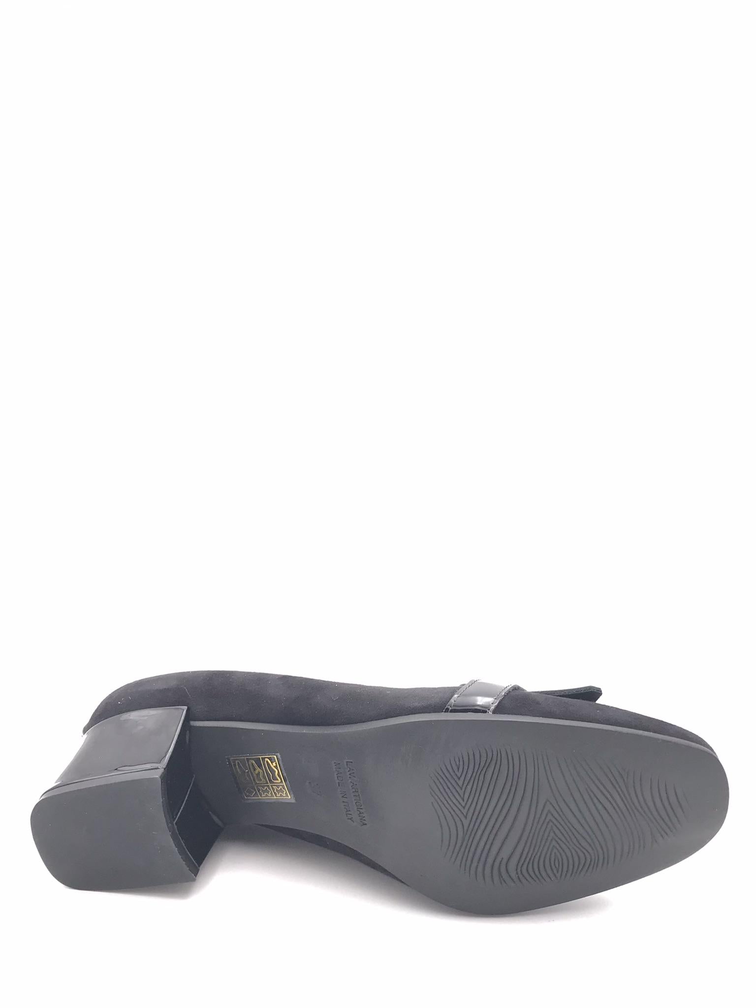Decolletè in camoscio nero. Accessorio in metallo oro applicato. Frangia in vernice nera. Elastico nel bordo della tomaia che avvolge il piede. Forma arrotondata. Fodera in pelle. Sottopiede morbido in pelle. Suola in gomma con tacco foderato altezza 5 cm.
