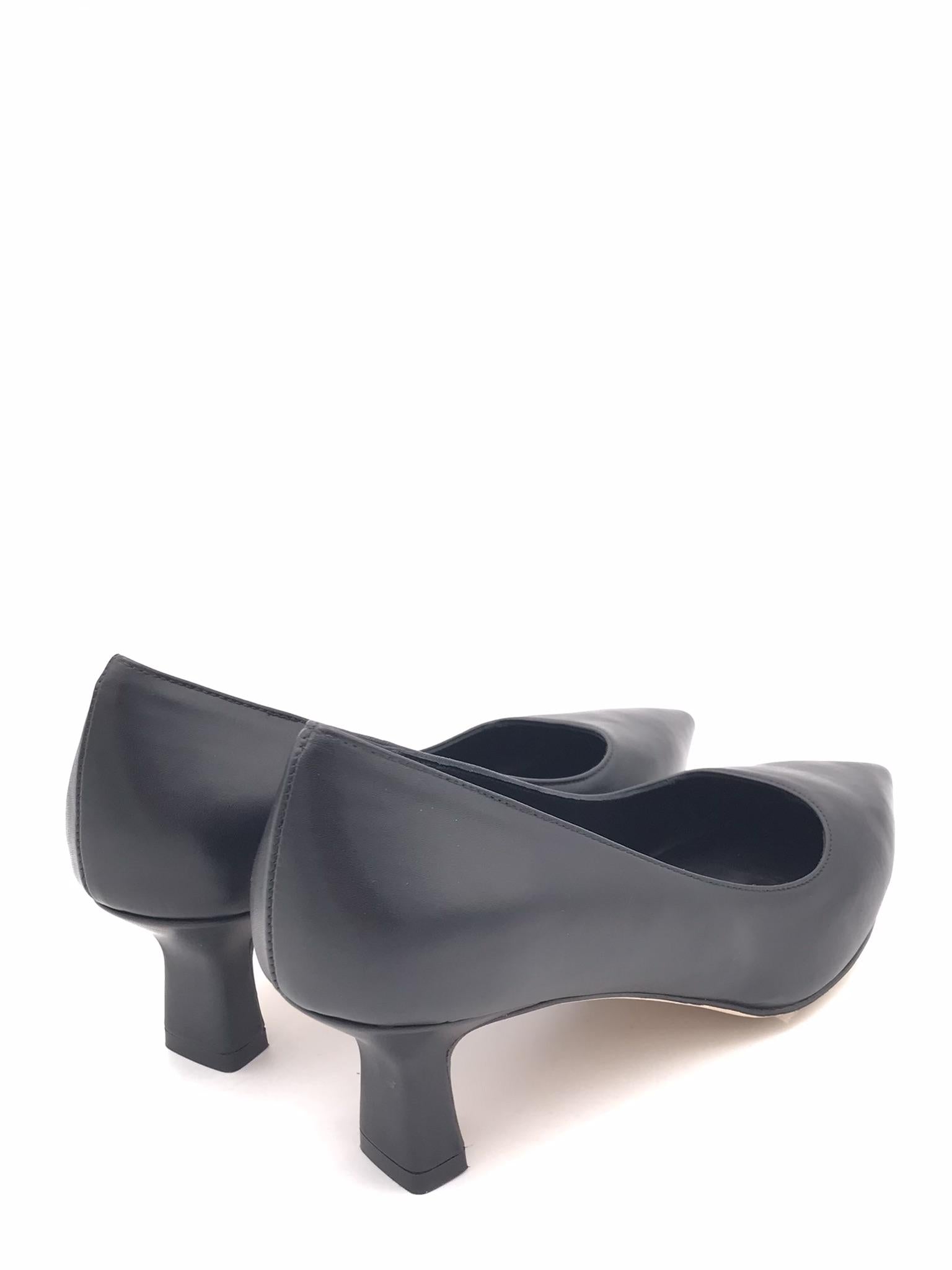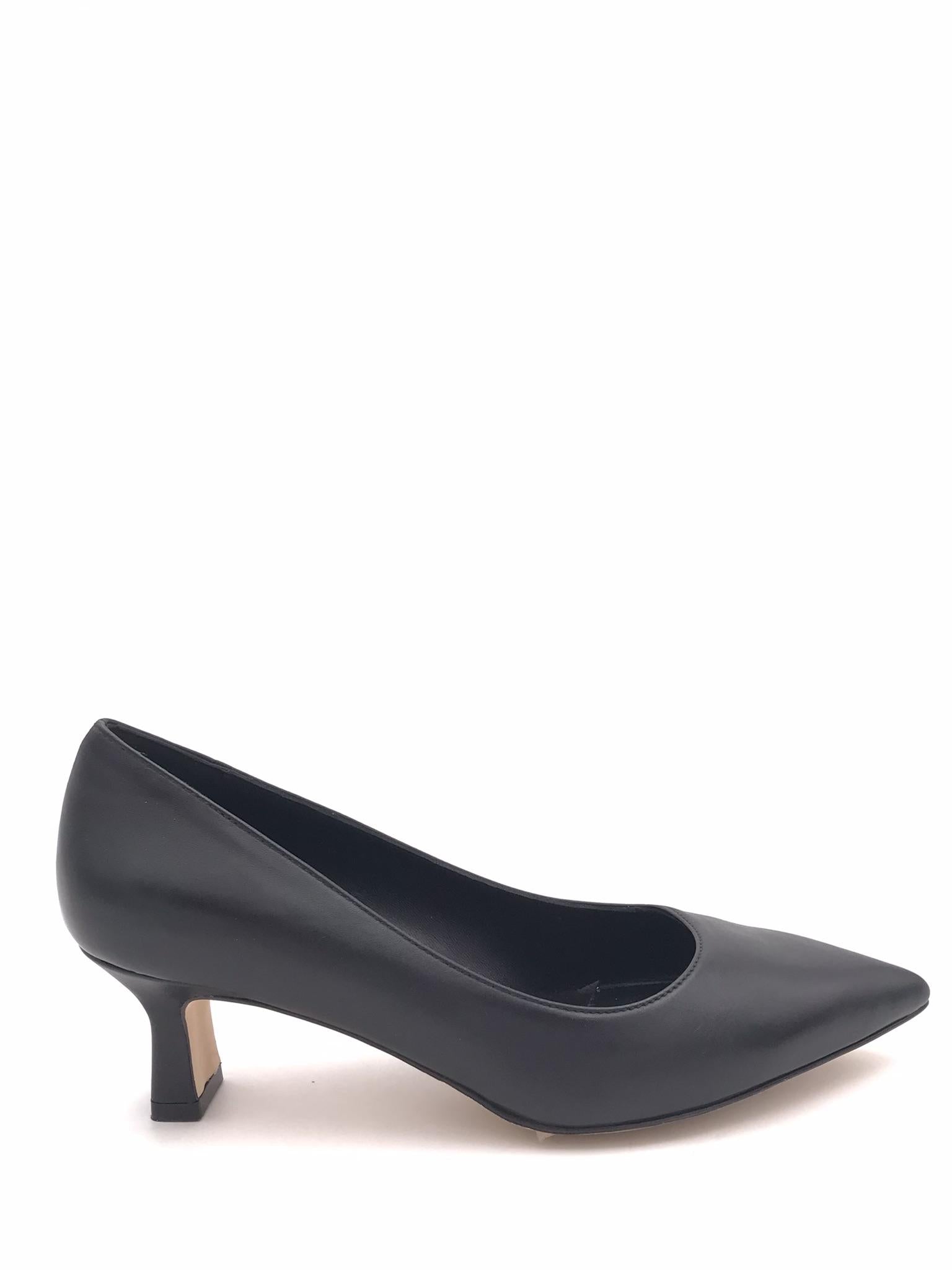 Decolletè in nappa morbida nera. Forma sfilata. Fodera interna in pelle. Sottopiede morbido con lavorazione sacchetto. Tacco foderato in tono colore altezza 5 cm. Suola in cuoio.