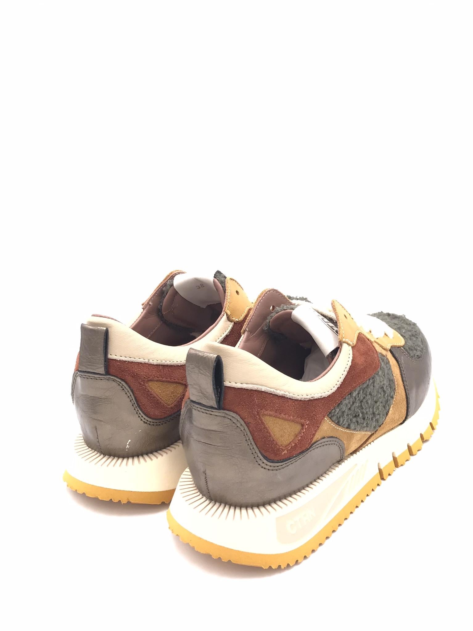 Sneakers running in pelle morbida laminata canna fuciole e crosta ocra. Inserti in ecopelliccia effetto teddy color oliva. Bordo lacci in pelle ocra e dettagli in crosta mattone. Laccio beige spugnato. Fodera interna in pelle. Plantare estraibile morbido in pelle e lattice. Suola running in eva leggera. Lavorazione artigianale.