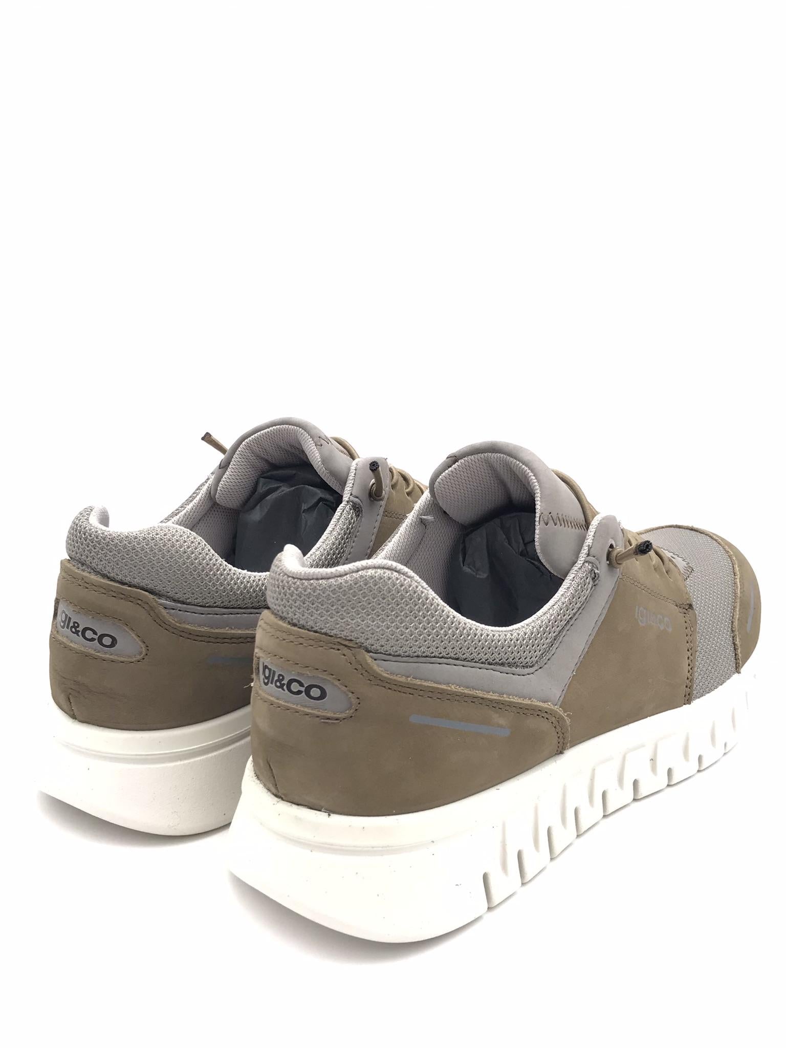 Sneakers modello Edo in crosta color militare e tessuto tecnico grigio chiaro. Linguetta in ecopelle grigia. Laccio elastico. Fodera interna in pelle e tessuto. Plantare estraibile in pelle e lattice. Suola running in gomma.