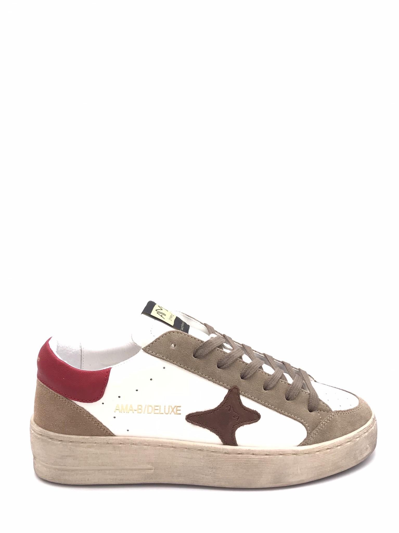 Sneakers modello Slam dal gusto retrò in pelle bianca con inserti in crosta beige. Vaschetta cucita e forata nel puntale. Tallonciono in pelle rossa. Logo in pelle marrone nella tomaia laterale. Linguetta in pelle bianca. Laccio beige. Effetto used su tutta la tomaia. Fodera interna in pelle e cotone. Plantare in lattice e pelle. Suola in gomma beige con effetto used