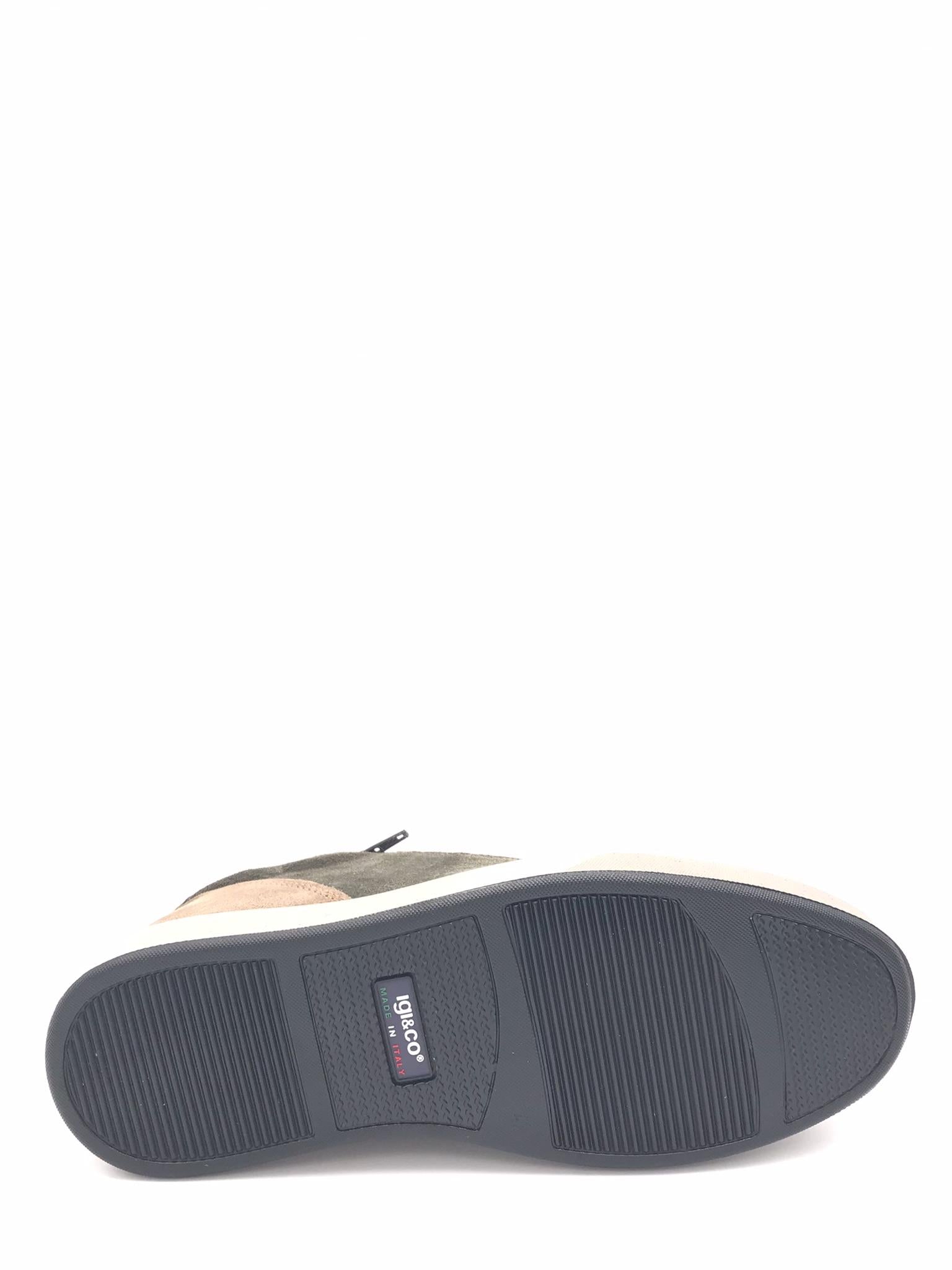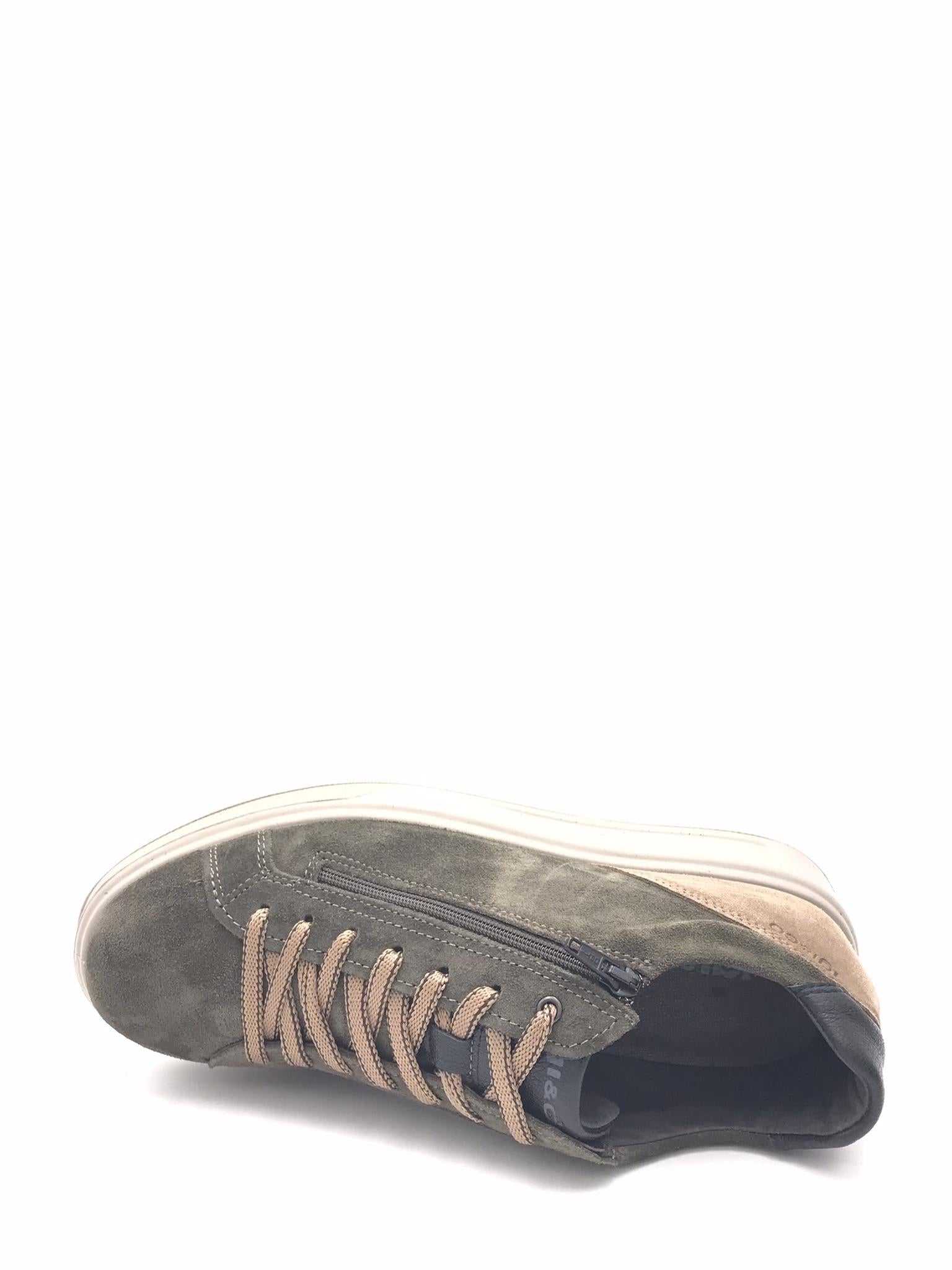 Sneakers modello Sten in crosta verde bosco e fango. Linguetta in in tono colore. Talloncino in pelle nera. Inserto nel tallone in camoscio fango. Laccio fango e zip. Fodera interna in pelle e tessuto. Plantare estraibile in pelle e lattice. Suola in gomma.