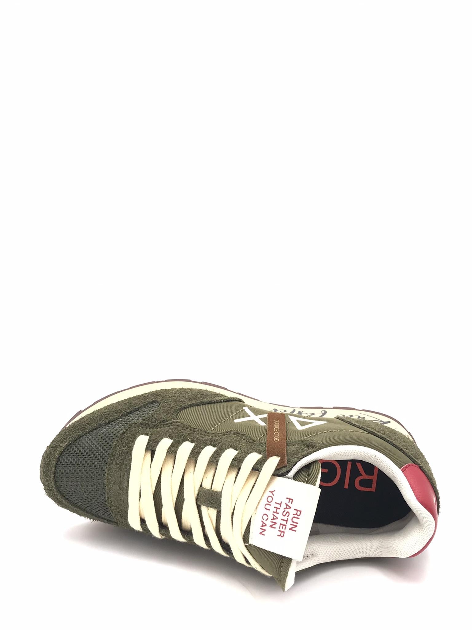 Sneakers running Tom vintage in crosta e tessuto tecnico verde militare. Inserti nel tallone in pelle rossa. Linguetta in nylon militare. Logo laterale ricamato bianco. Laccio panna e laccio giallo di cambio. Fodera interna in tessuto. Plantare estraibile morbido in tessuto e lattice. Suola running leggera in eva effetto vintage