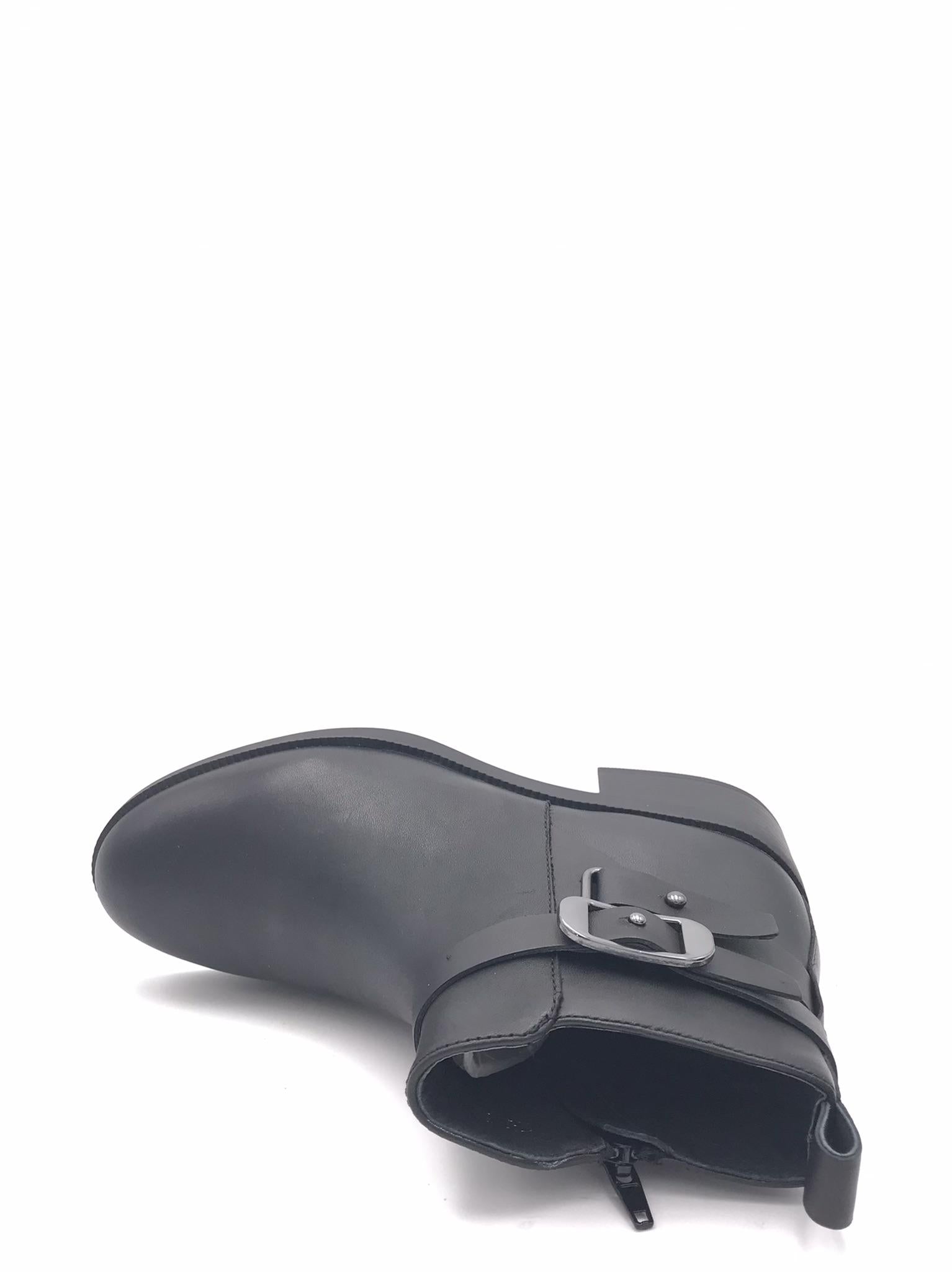 Tronchetto realizzato in pelle nera. Forma arrotondata. Passante in pelle sul gambale con accessorio in metallo applicato. Fodera interna in pelle e tessuto. Suola in gomma.