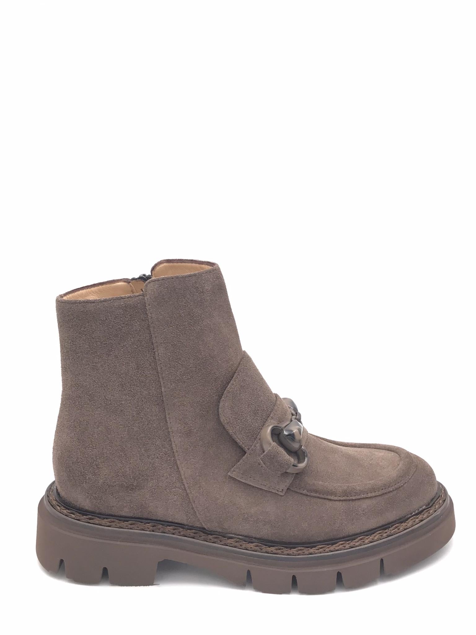 Tronchetto basso realizzato in crosta marrone. Forma arrotondata con vaschetta cucita nel puntale. Morsetto in metallo in tinta applicato nel collo piede. Zip laterale. Fodera interna in pelle. Suola in gomma leggera con guardolo cucito. Lavorazione artigianale