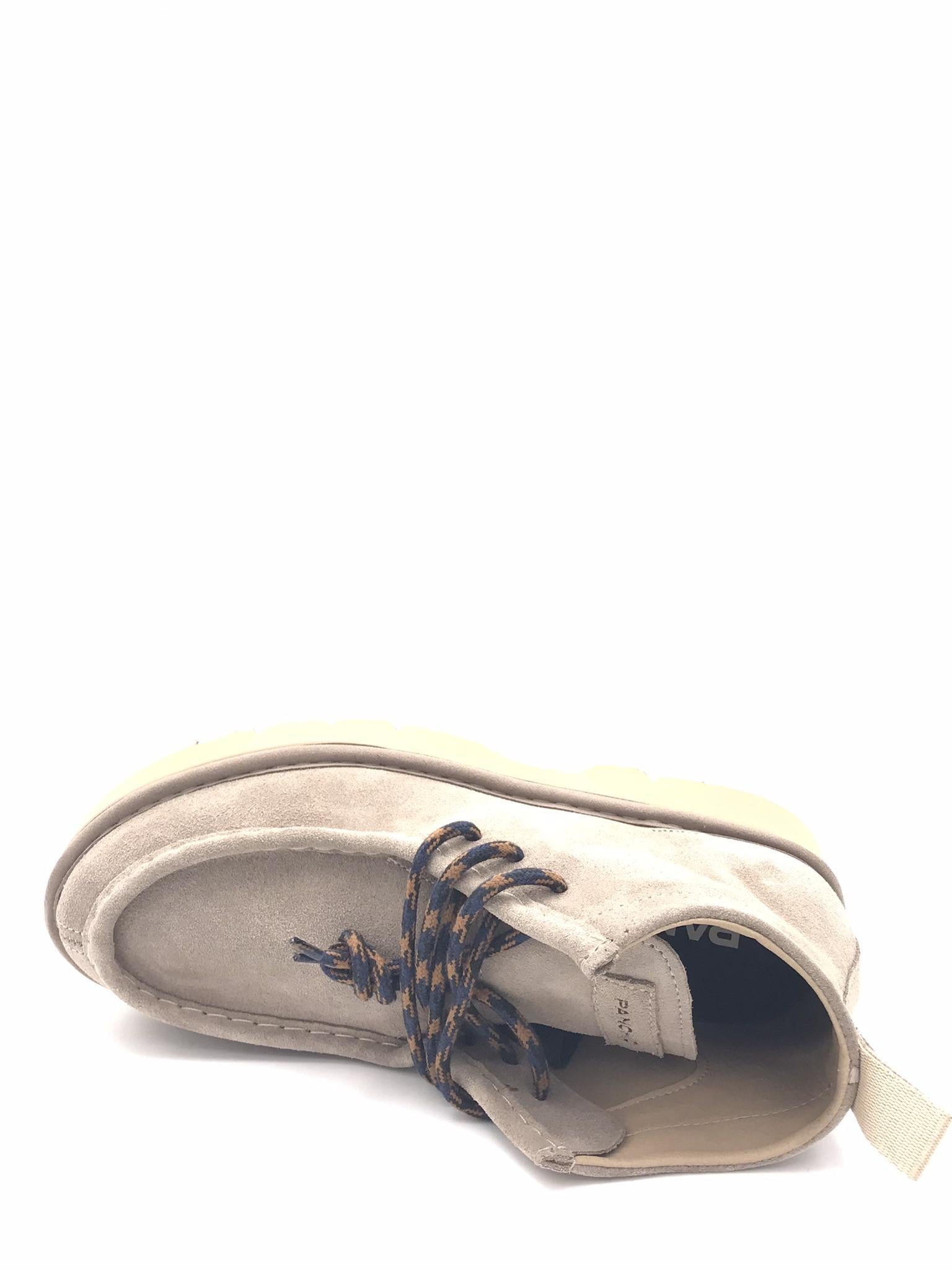 Scarponcino realizzato in crosta color beige. Forma arrotondata con mascherina e guardolo cucito. Fodera interna in pelle. Suola in gomma leggera con guardolo cucito. Laccio in cotone colorato a contrasto