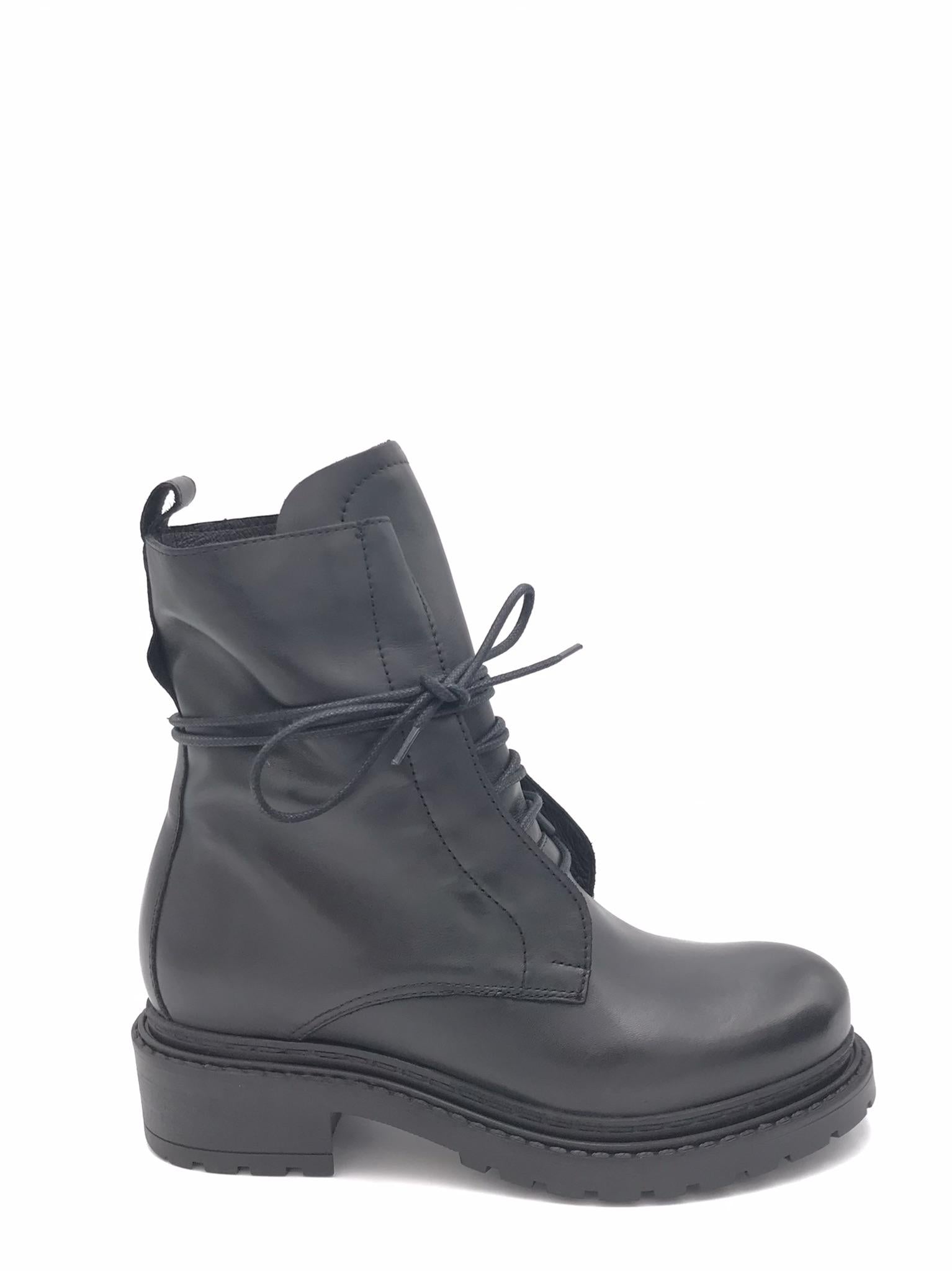 Anfibio realizzato in morbida pelle anticata nera. Chiusura con laccio. Forma arrotondata. Fodera interna in pelle. Suola in gomma effetto roccia. Lavorazione artigianale