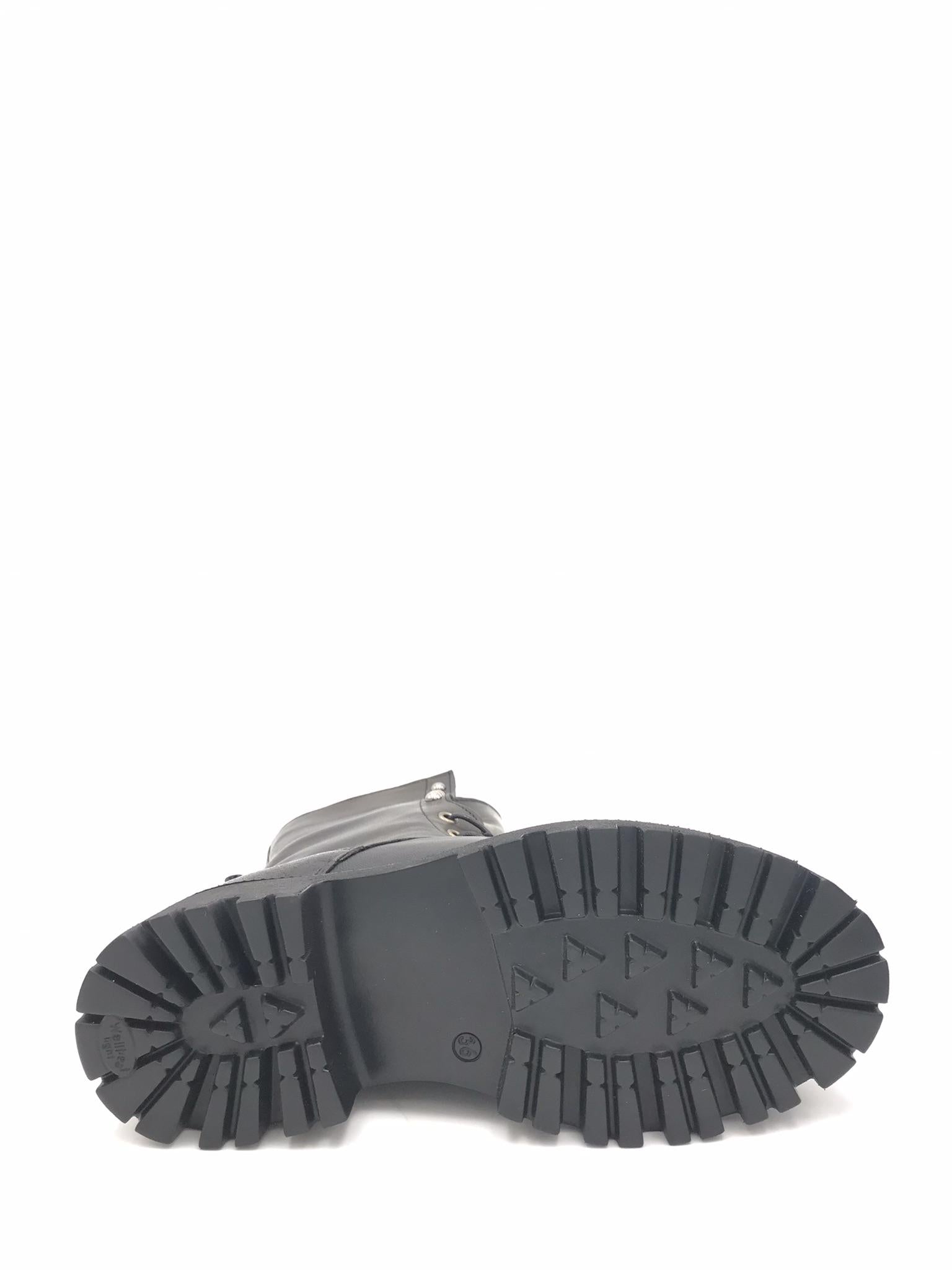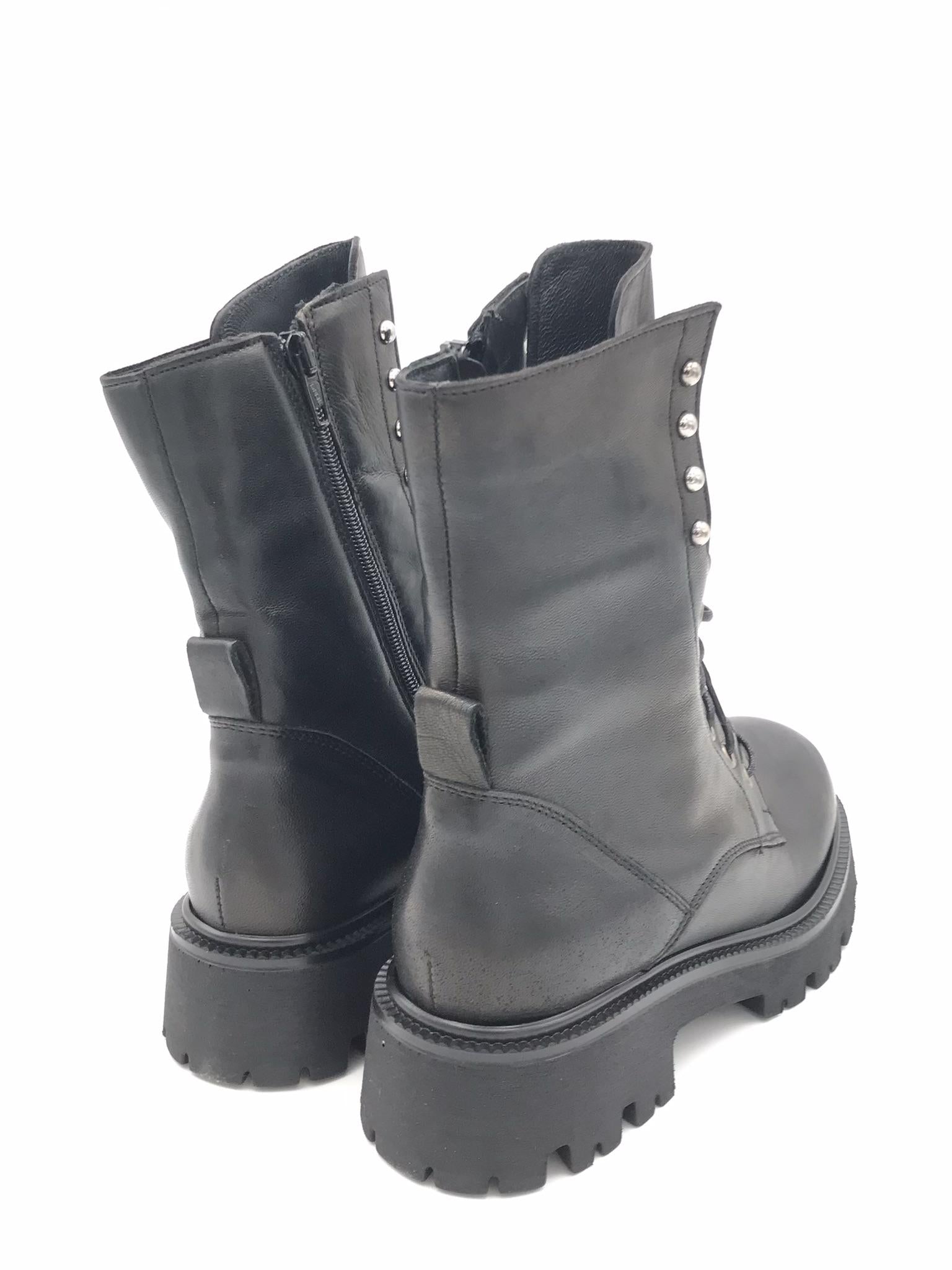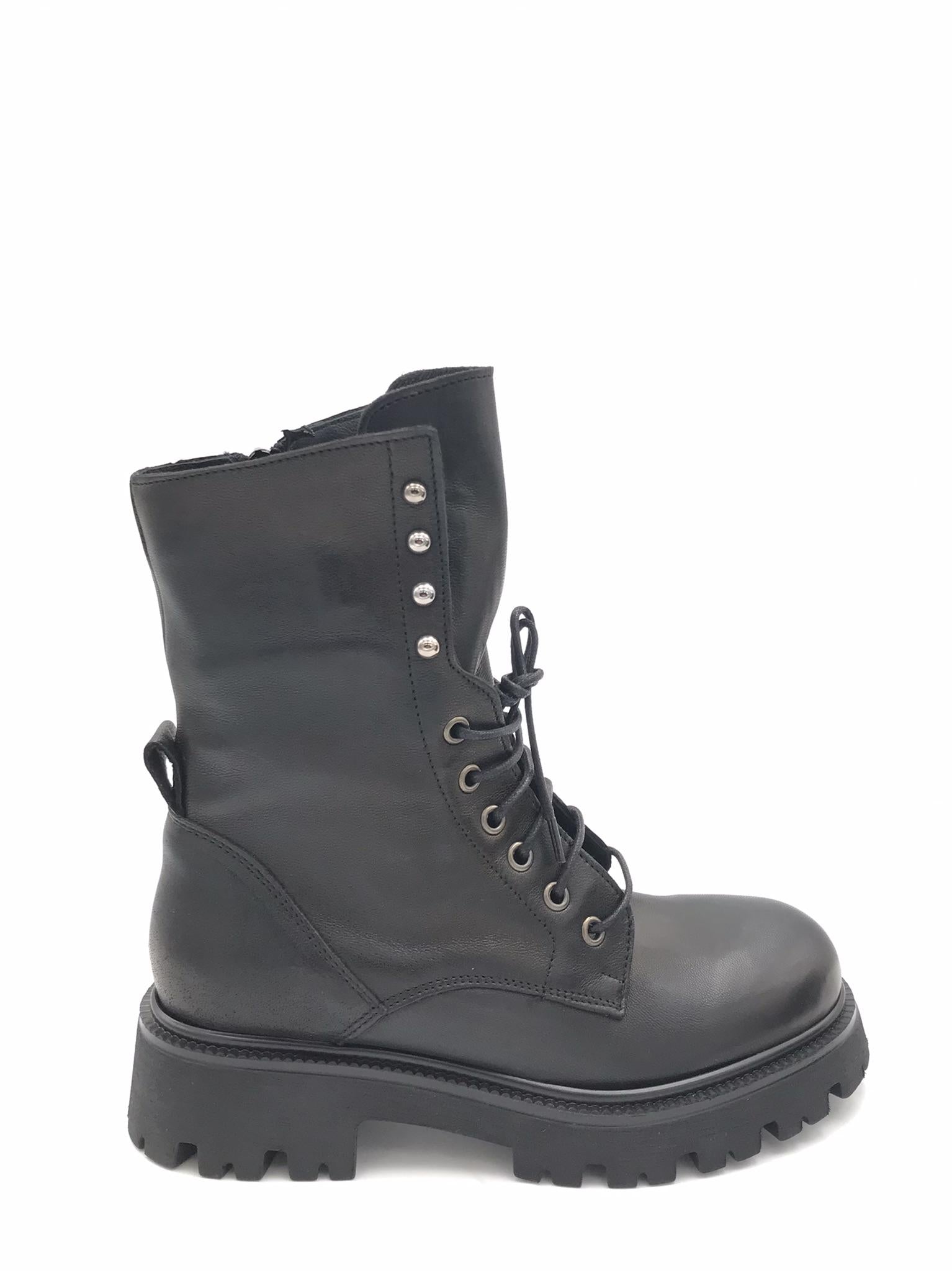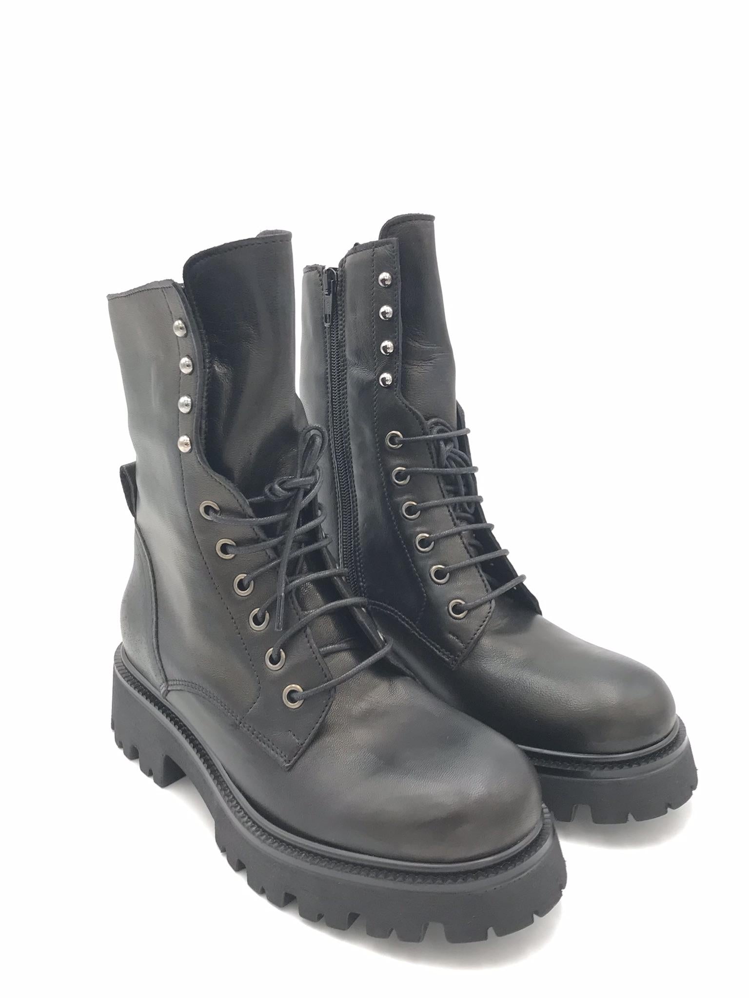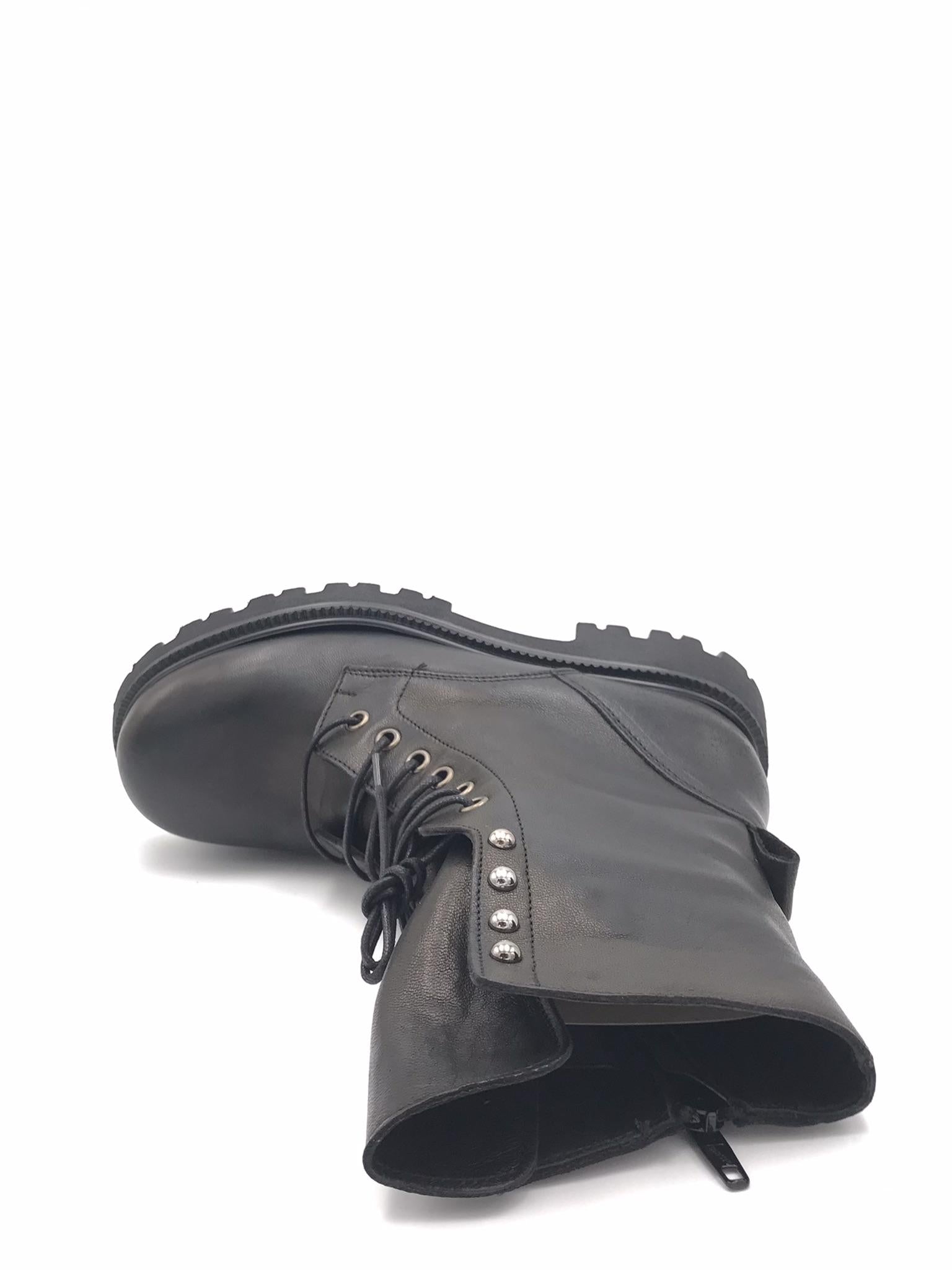 Anfibio realizzato in morbida pelle nera. Chiusura con laccio e zip laterale interna. Forma arrotondata. Fodera interna in pelle. Suola in gomma effetto roccia. Lavorazione artigianale
