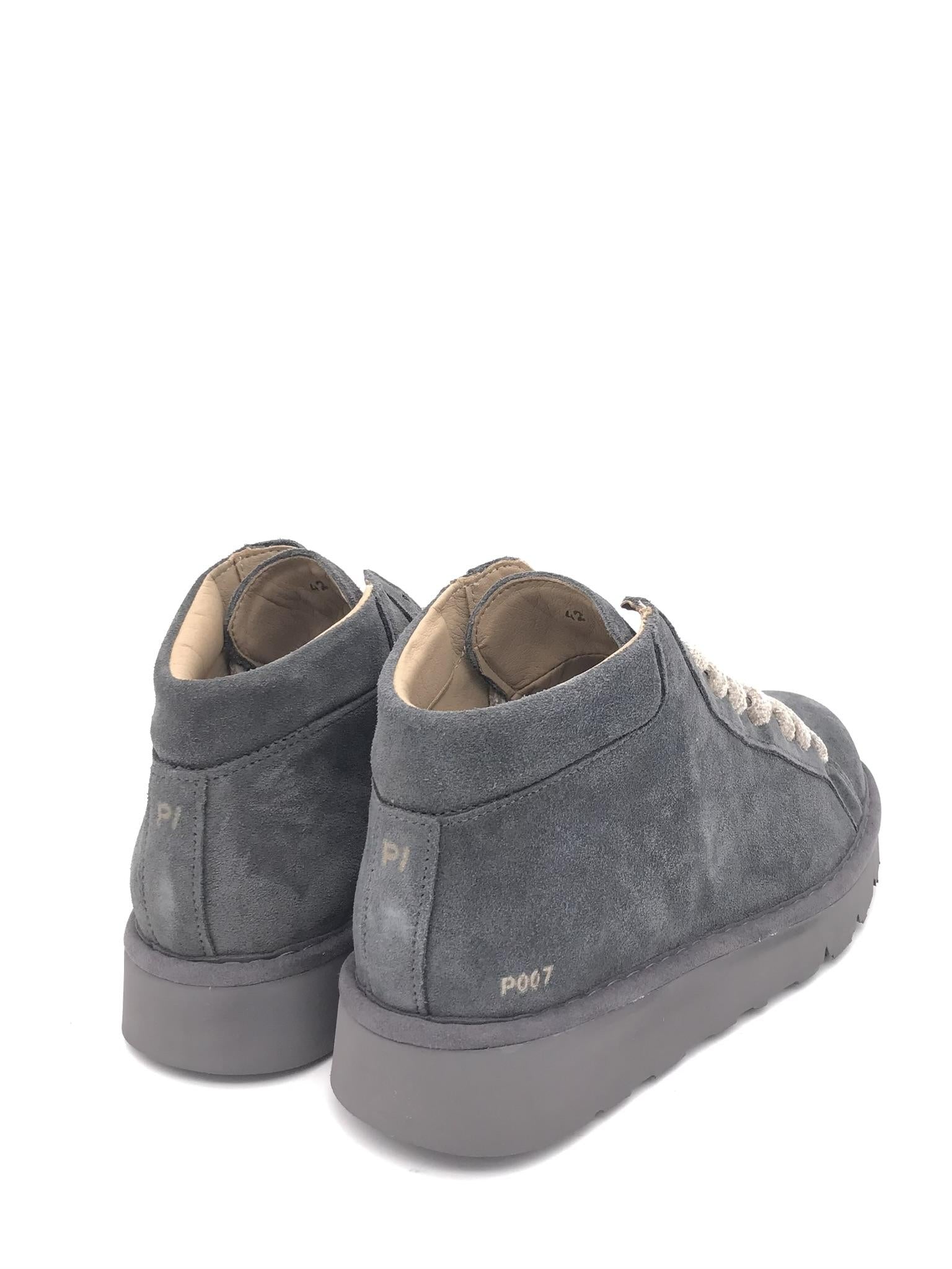 Scarponcino realizzato in crosta color antracite. Forma arrotondata. Fodera interna in pelle. Suola in gomma leggera con guardolo cucito. Laccio in cotone colorato a contrasto effetto spugnato