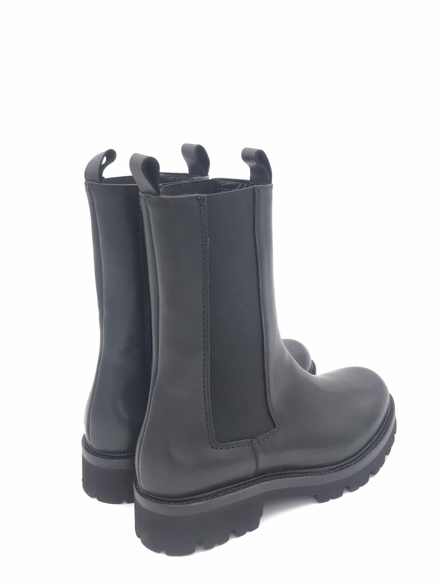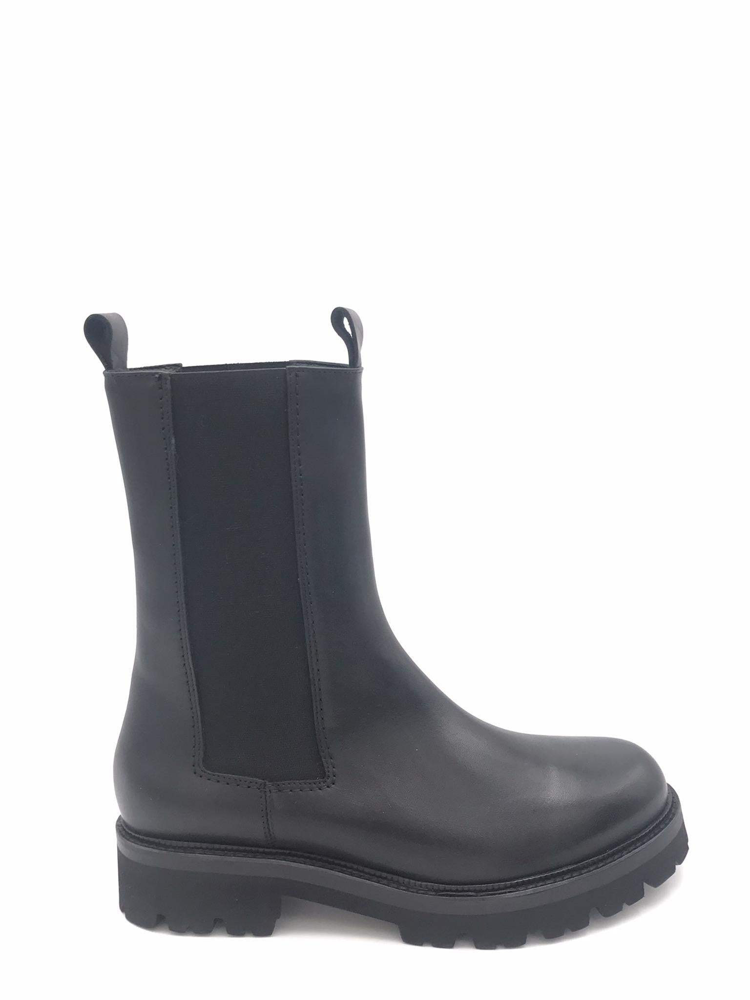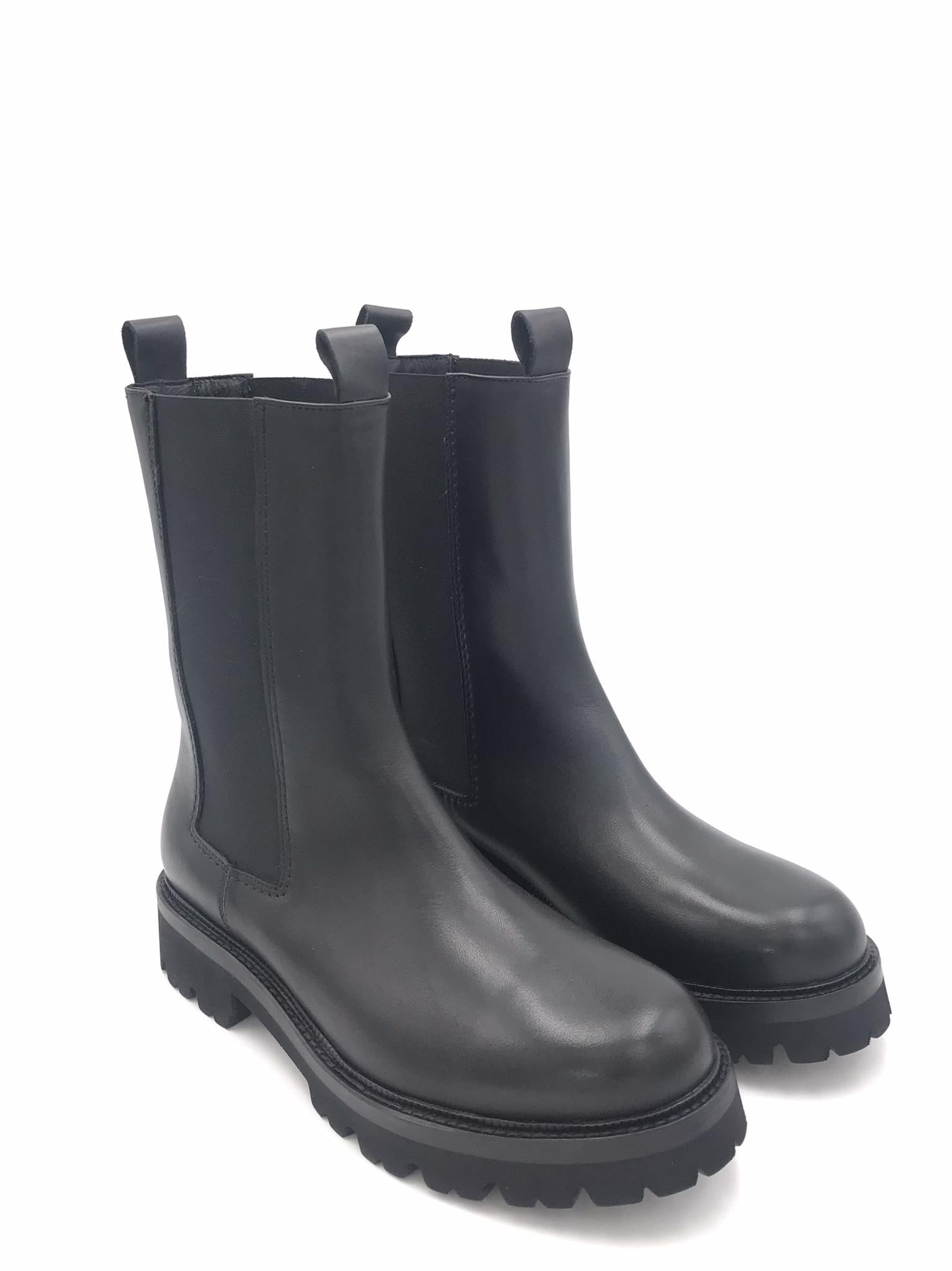 Boot modello Zafira realizzato in morbida pelle nera. Elastici laterali in tinta. Forma arrotondata. Fodera interna in pelle. Sottopiede morbido in pelle. Suola in gomma leggera effetto roccia con guardolo in cuoio nero cucito.